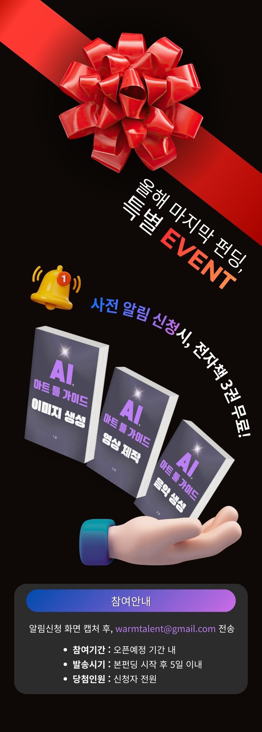 갤러리에서 AI 아트 전시를 진행하는 따능이입니다. 여러 차례 펀딩을 성공적으로 진행하며 많은 서포터들과 활발히 소통하고 있습니다. 앞으로도 완성도 높은 AI 아트 교육 콘텐츠를 제공하며 서포터들과 지속적으로 성장하겠습니다.