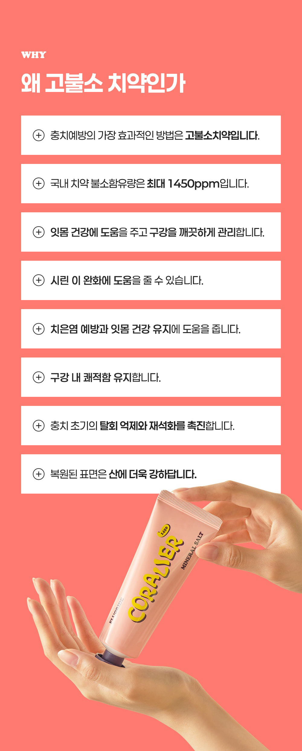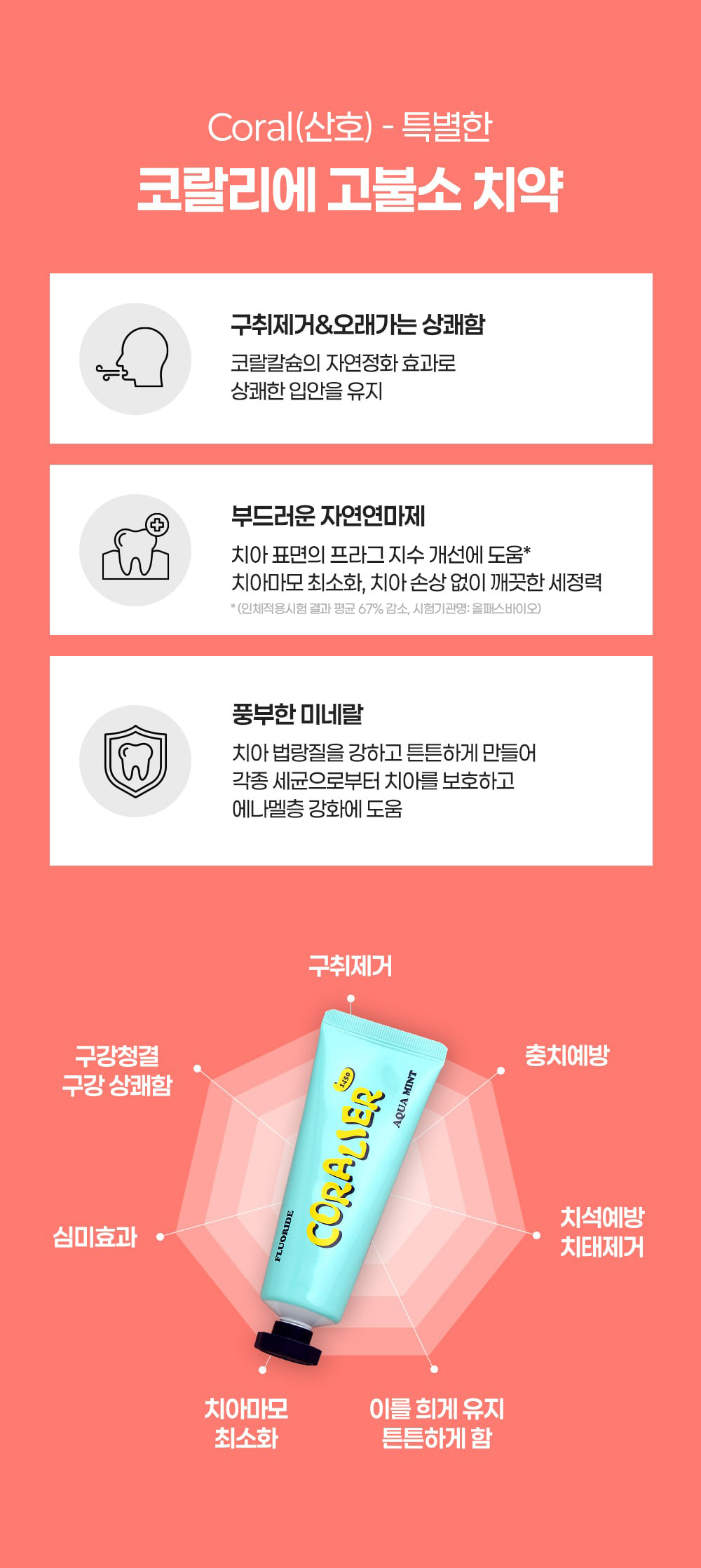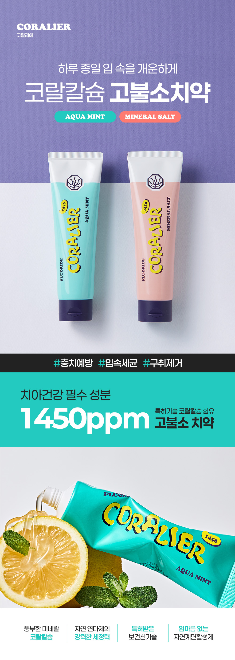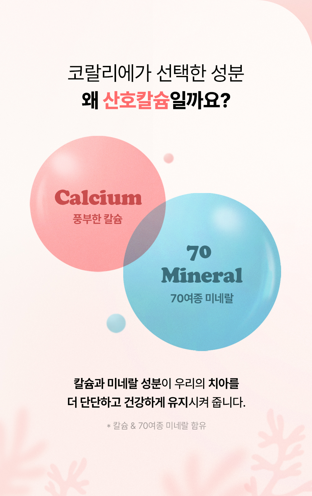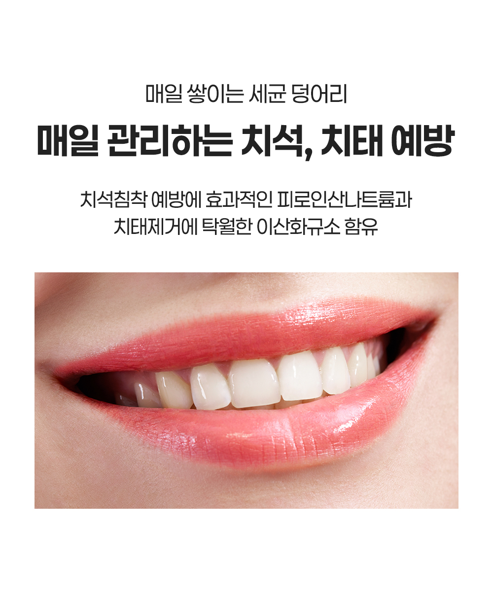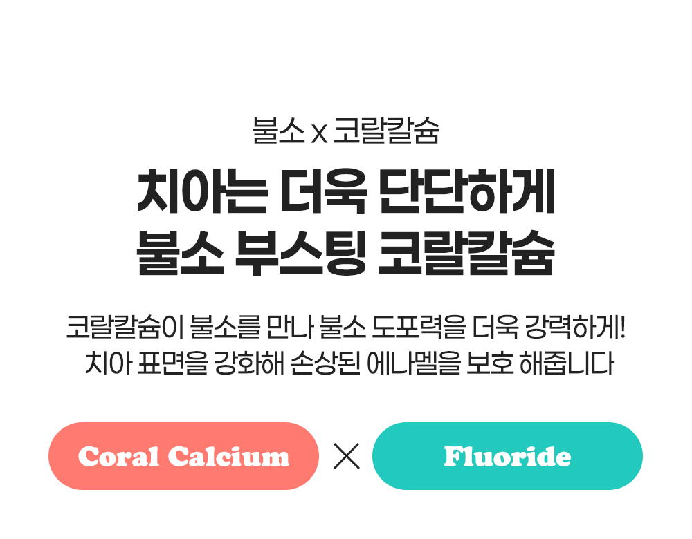 "산호칼슘 70여 미네랄 + 1,450ppm 고불소 정밀한 비율이 만드는 확실한 효과"