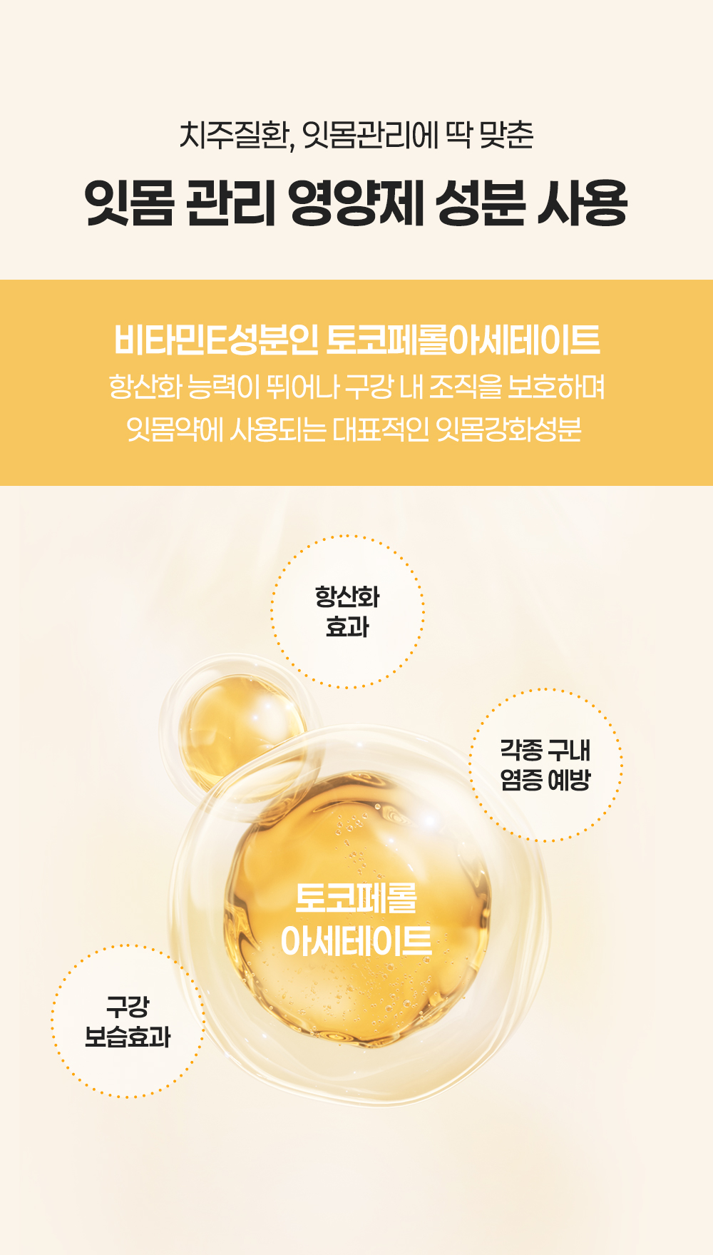 이것이 바로 연세치대 교수진들이 비타민E 성분인 토코페롤 아세테이트를 핵심 영양 성분으로 선택한 이유입니다.