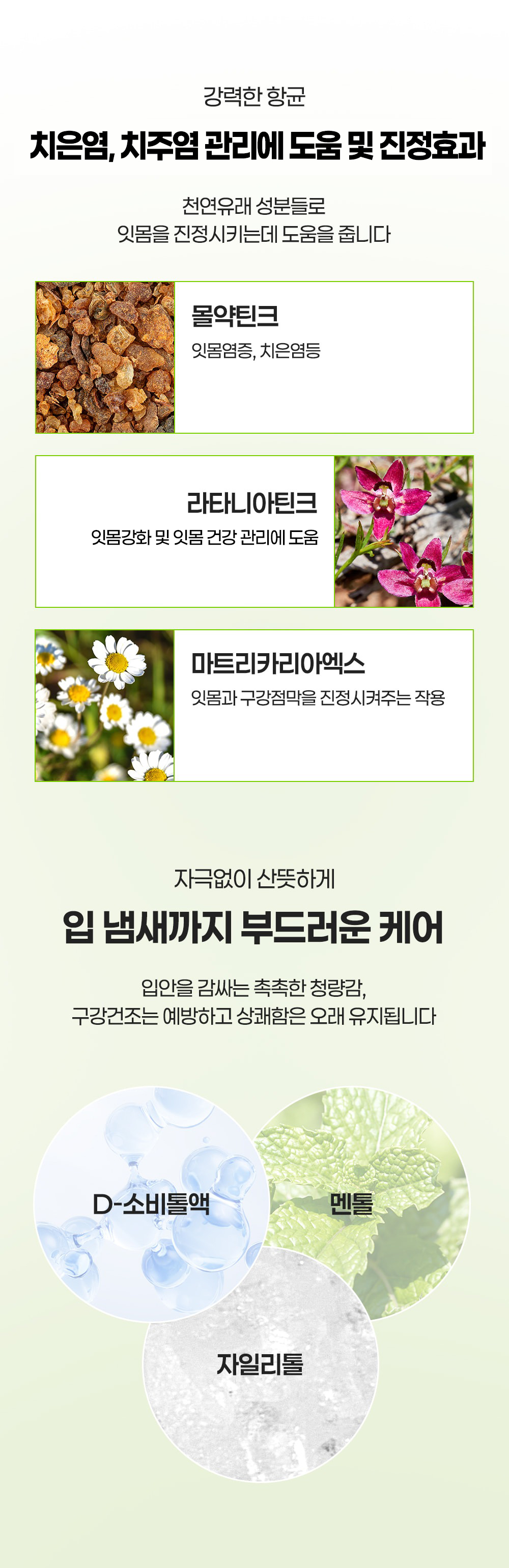 99.9% 항균력으로 잇몸질환 원인균을 제거했다면 이제는 손상된 잇몸을 회복시켜야 합니다.