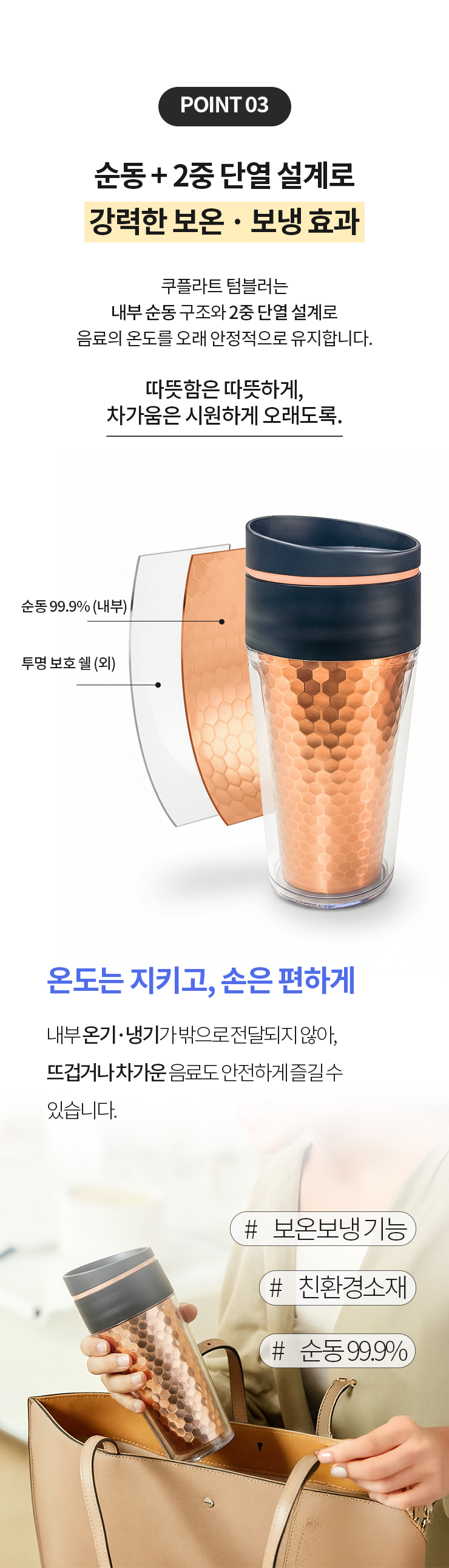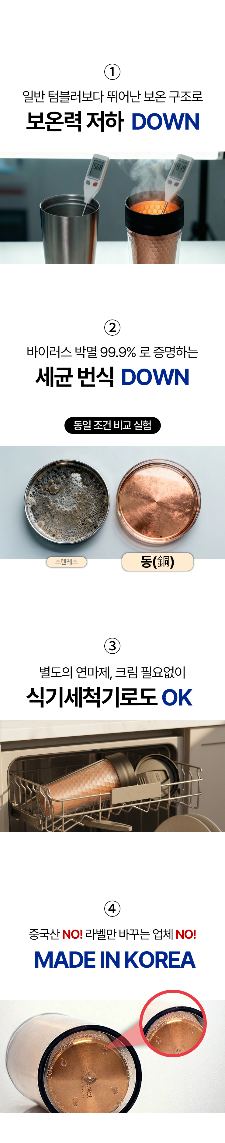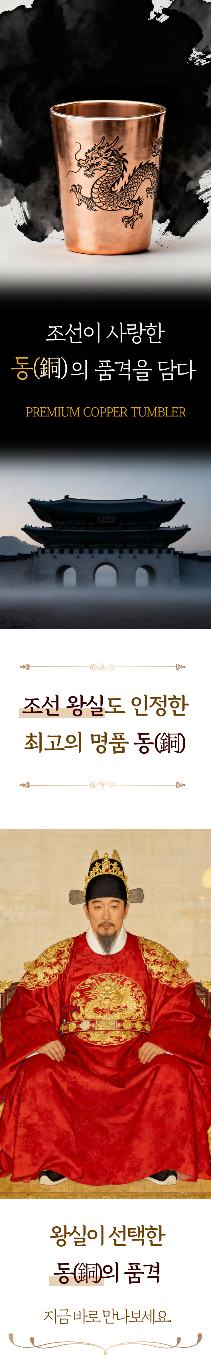1. 🥤 세계 최초 순동 텀블러 - 왕실이 선택한 동 소재로 완성한 프리미엄 텀블러 2. 🔥 뛰어난 보온 및 항균력 - 보온력과 항균력으로 위생과 품격을 동시에 높임 3. 🎁 할인 및 선물용 구성 - 고급 선물상자 포함, 세트 구매 시 할인과 사은품 제공