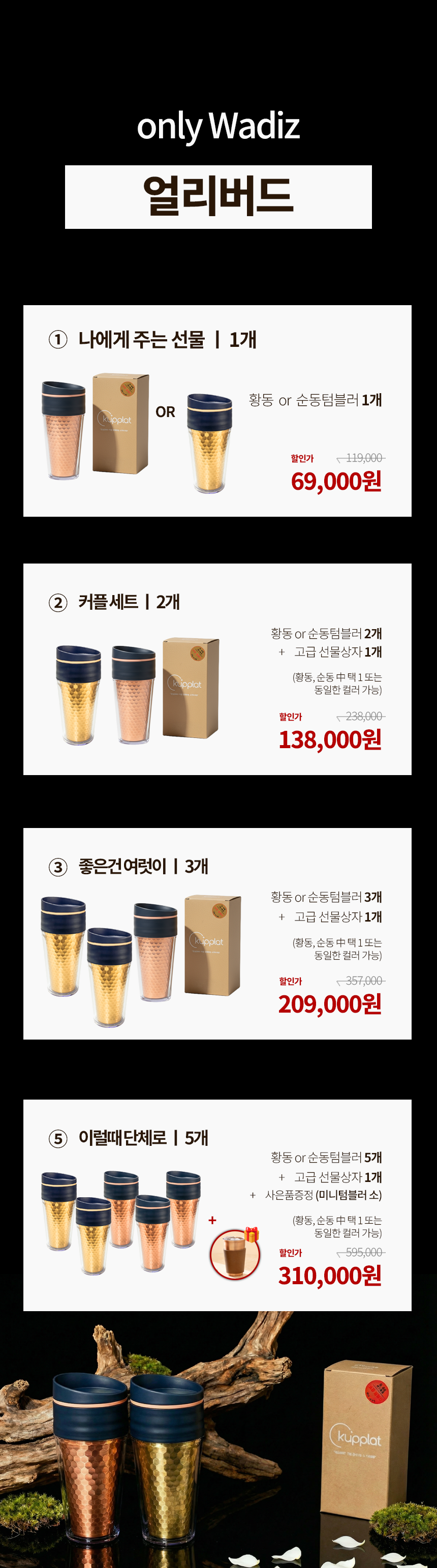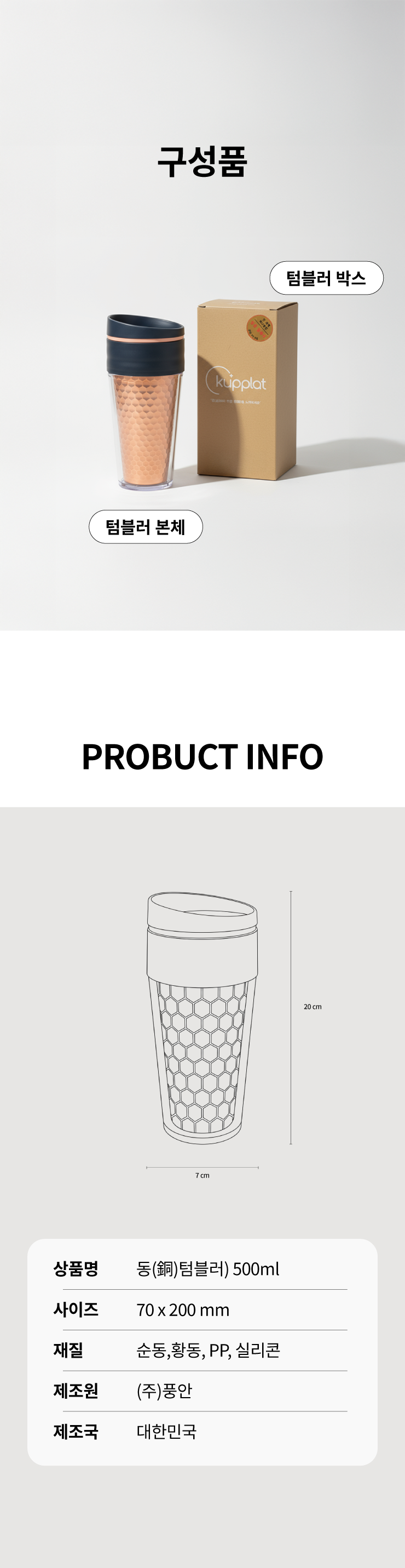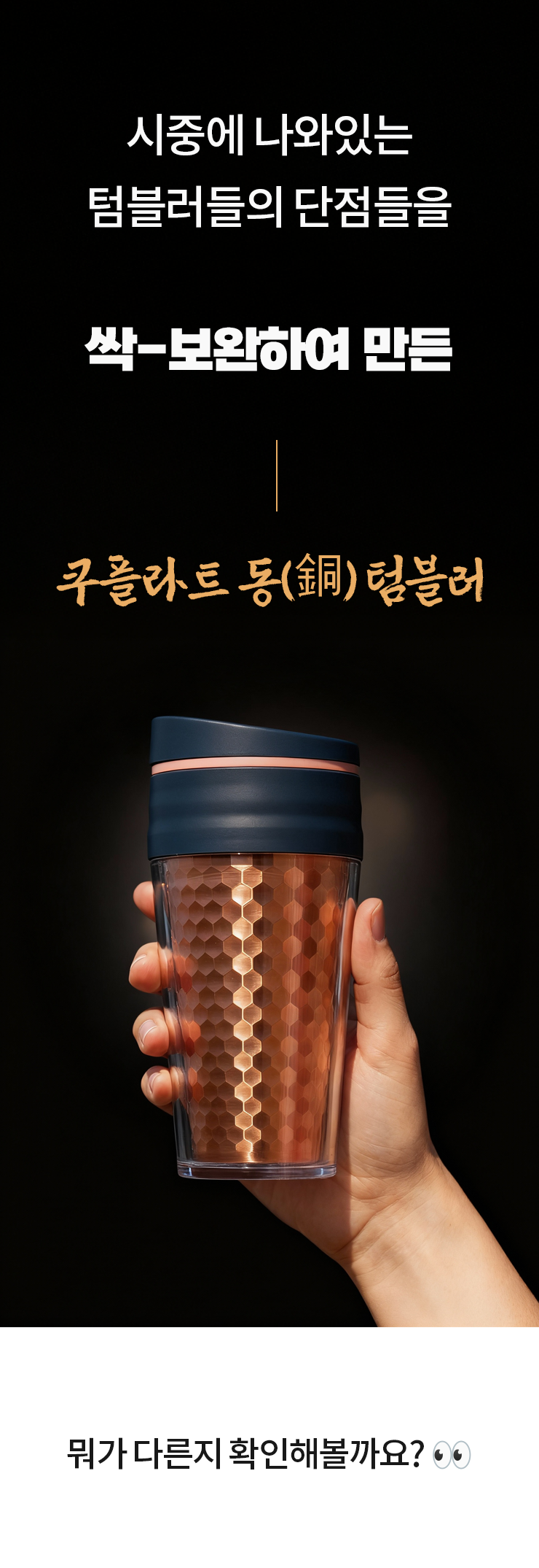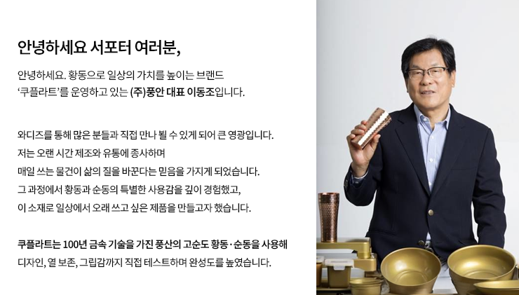 1. 🥤 세계 최초 순동 텀블러 - 왕실이 선택한 동 소재로 완성한 프리미엄 텀블러 2. 🔥 뛰어난 보온 및 항균력 - 보온력과 항균력으로 위생과 품격을 동시에 높임 3. 🎁 할인 및 선물용 구성 - 고급 선물상자 포함, 세트 구매 시 할인과 사은품 제공