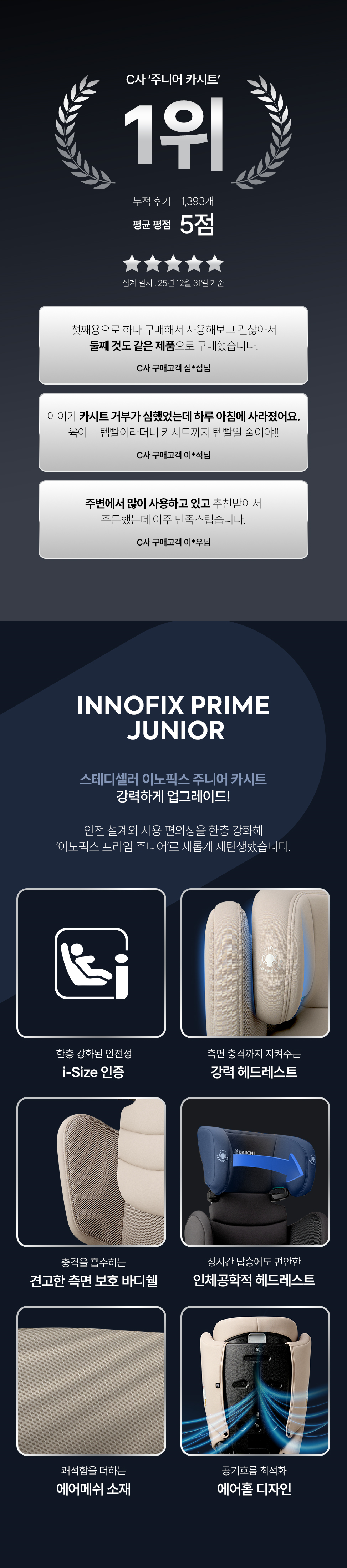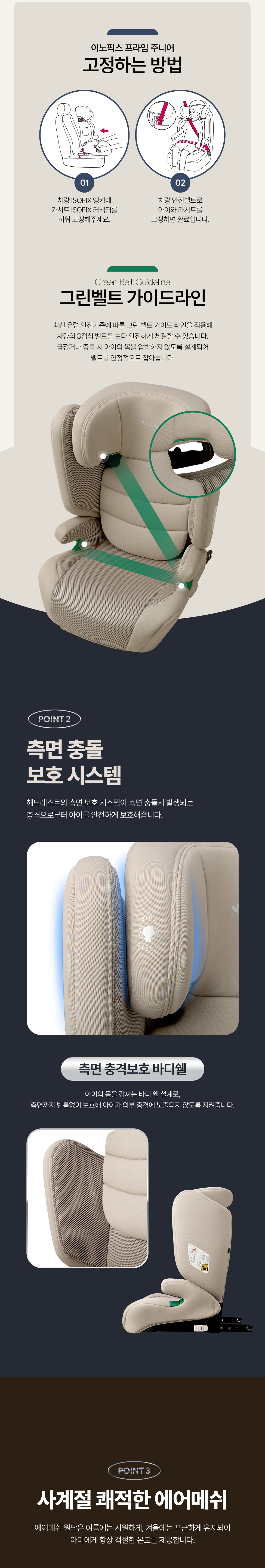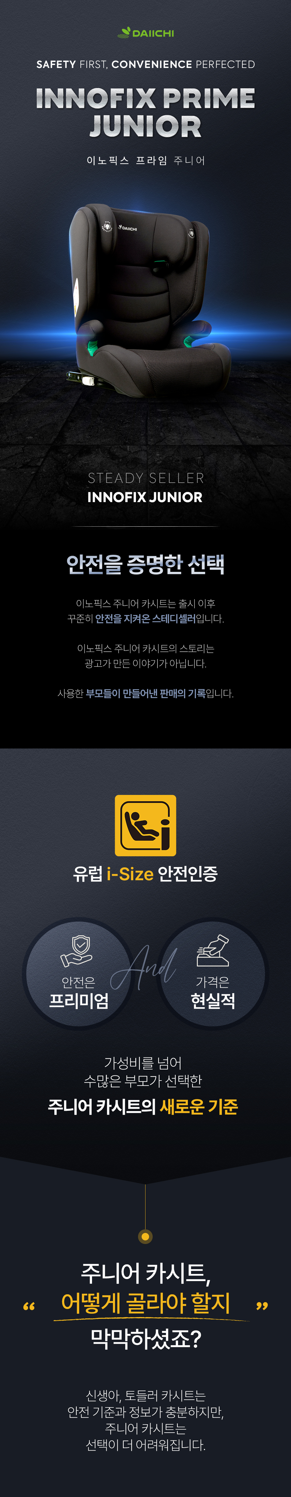 이노픽스 프라임 주니어 카시트는 유럽 i-Size 인증 기준을 적용한 설계로,