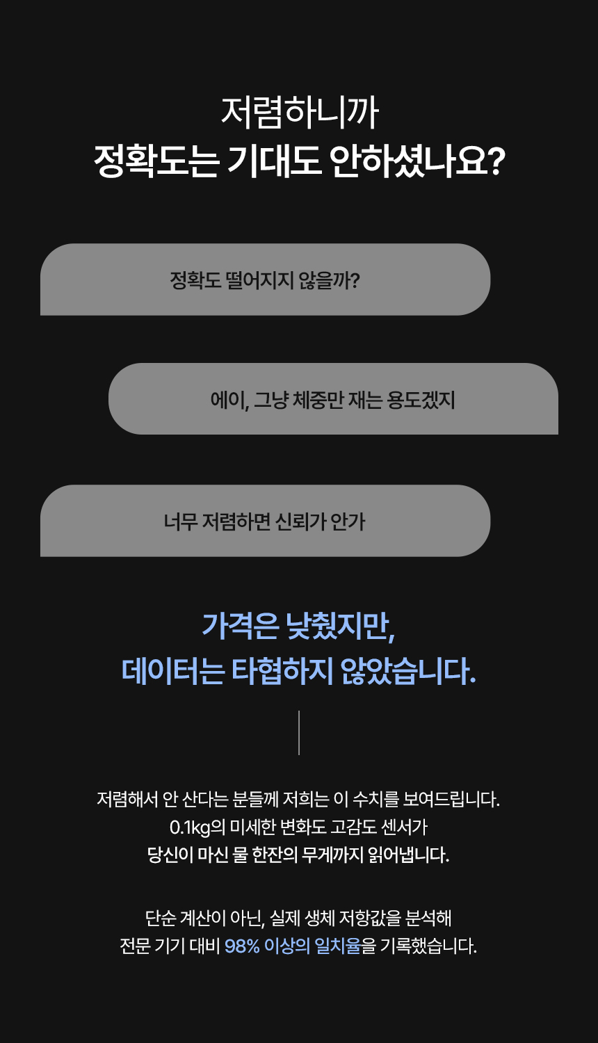 "정확도는 타협할 수 없지만, 가격은 르젠다워야 한다"이 불가능해 보이는 미션을 해결하기 위해 1년 넘게 센서와 씨름했습니다.거품을 뺀 르젠만의 유통 구조와 검증된 기술력을 바탕으로, 집에서 정밀하게 체성분을 분석할 수 있는 '리얼 8전극 스마트 체중계'를 와디즈 서포터분들께 가장 먼저 선보이고자 합니다.