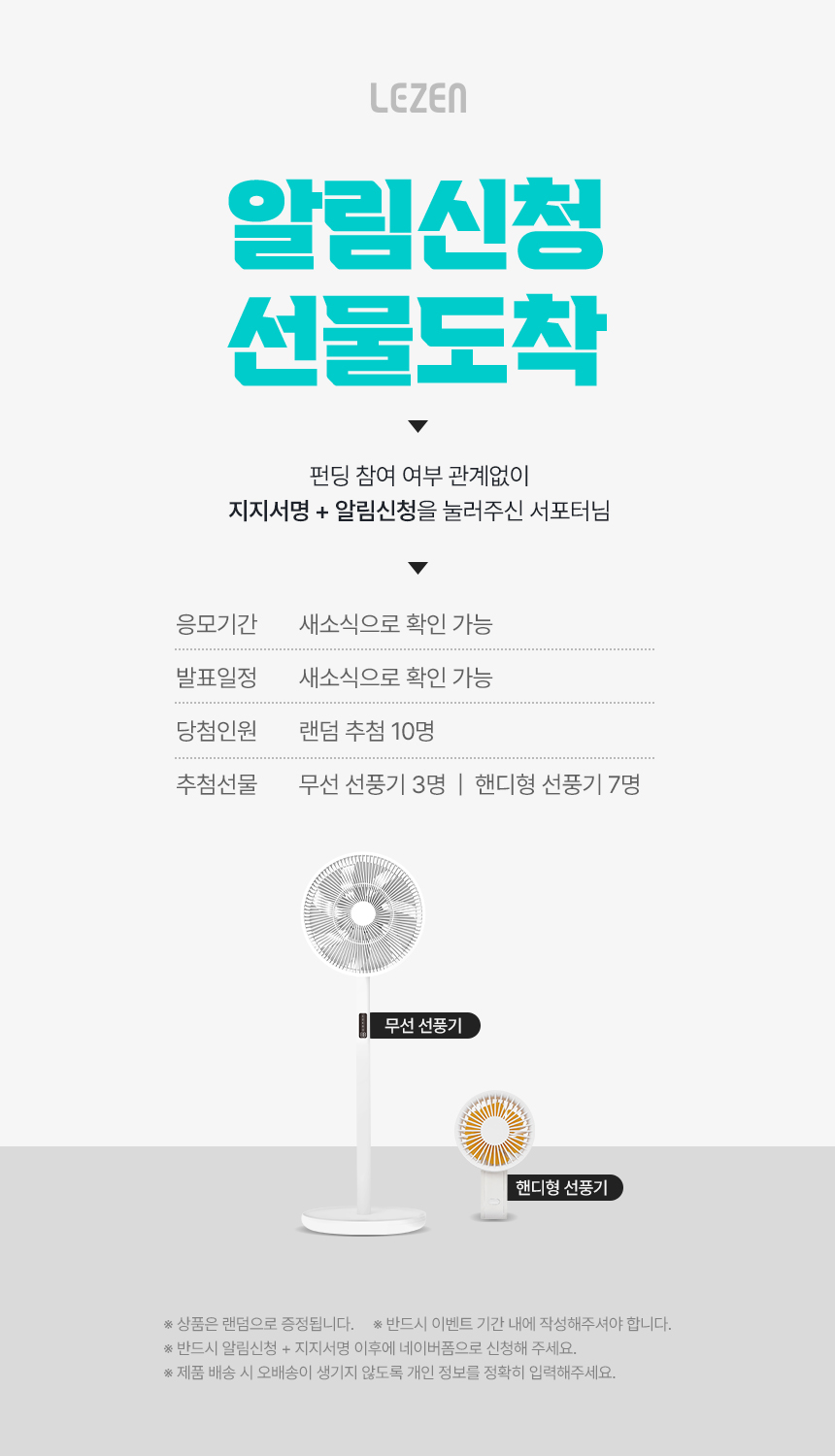 - 펀딩 오픈예정 기간 동안 펀딩여부 상관없이 지지서명 + 알림신청 하시는 서포터님들 중 추첨을 통해 총 10분께 선물을 드립니다! 곧 여름이 시작하는 계절, 무선선풍기와 핸디형선풍기 선물 받아가실 수 있도록 새소식 확인 부탁드려요 ❤