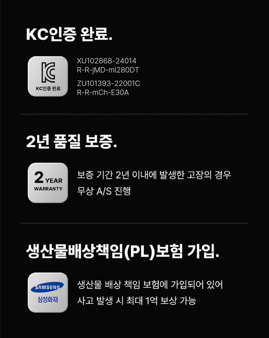 - 제품의 정상적인 사용 도중 발생한 제품의 성능, 기능 상의 하자에 한하여 제품을 리워드 수령일로부터 2년 동안 무상 A/S 가능합니다. (배송비 별도)