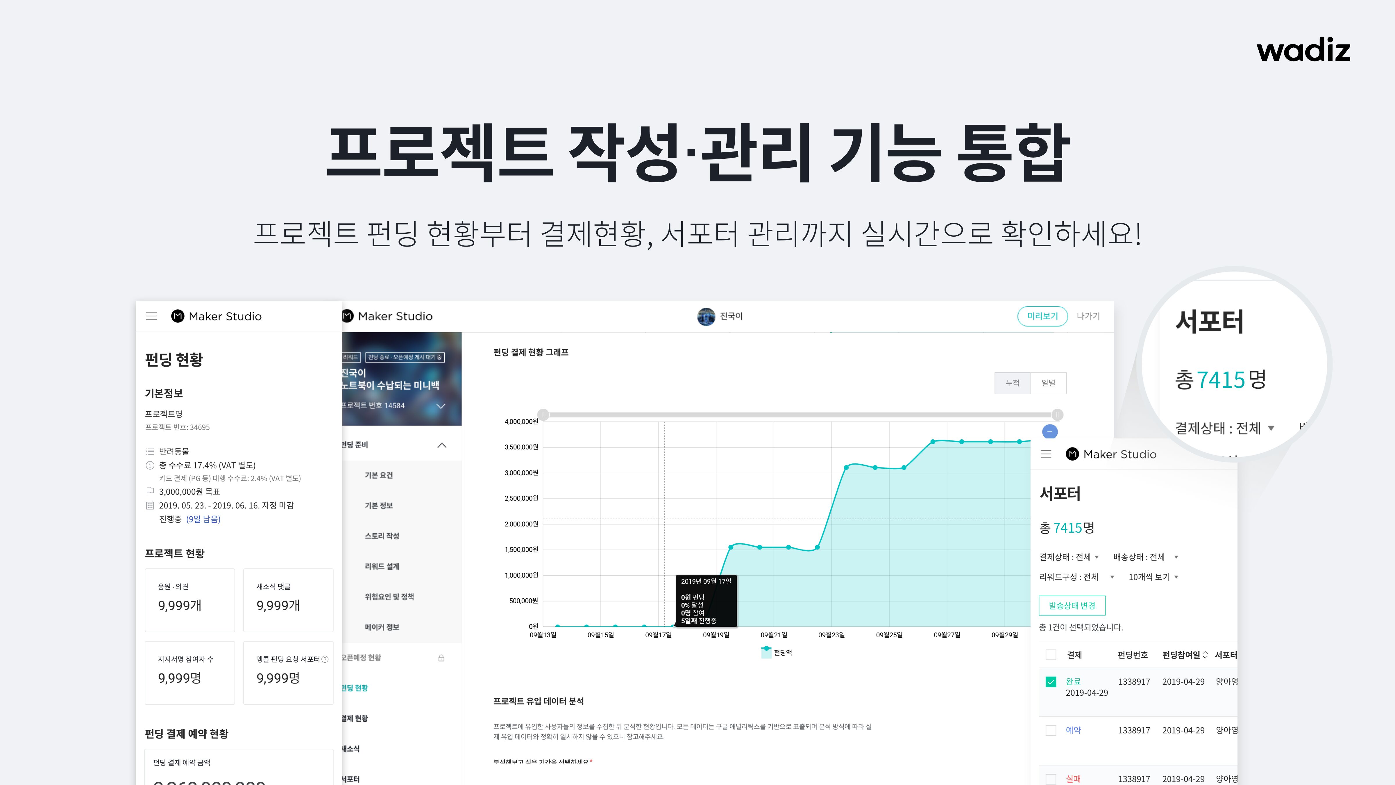프로젝트 작성부터 펀딩 진행 현황, 오픈예정 알림 신청 현황, 결제 현황, 펀딩 참여 서포터까지 스튜디오에서 한눈에 확인하고 관리할 수 있습니다.