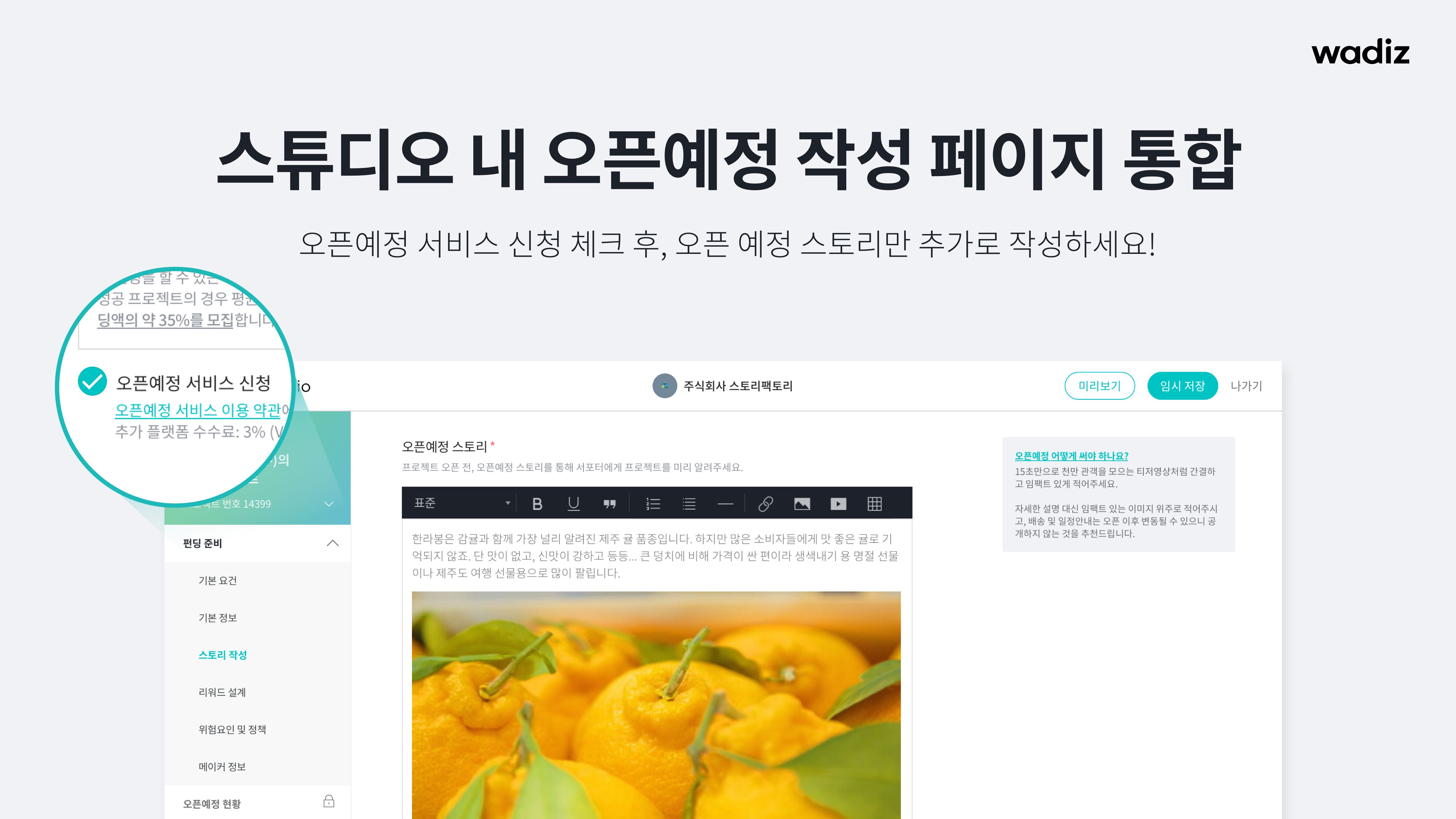 개편되는 스튜디오에서는 프로젝트 작성 시 오픈예정 스토리만 추가로 작성하여 한 번에 진행할 수 있습니다.