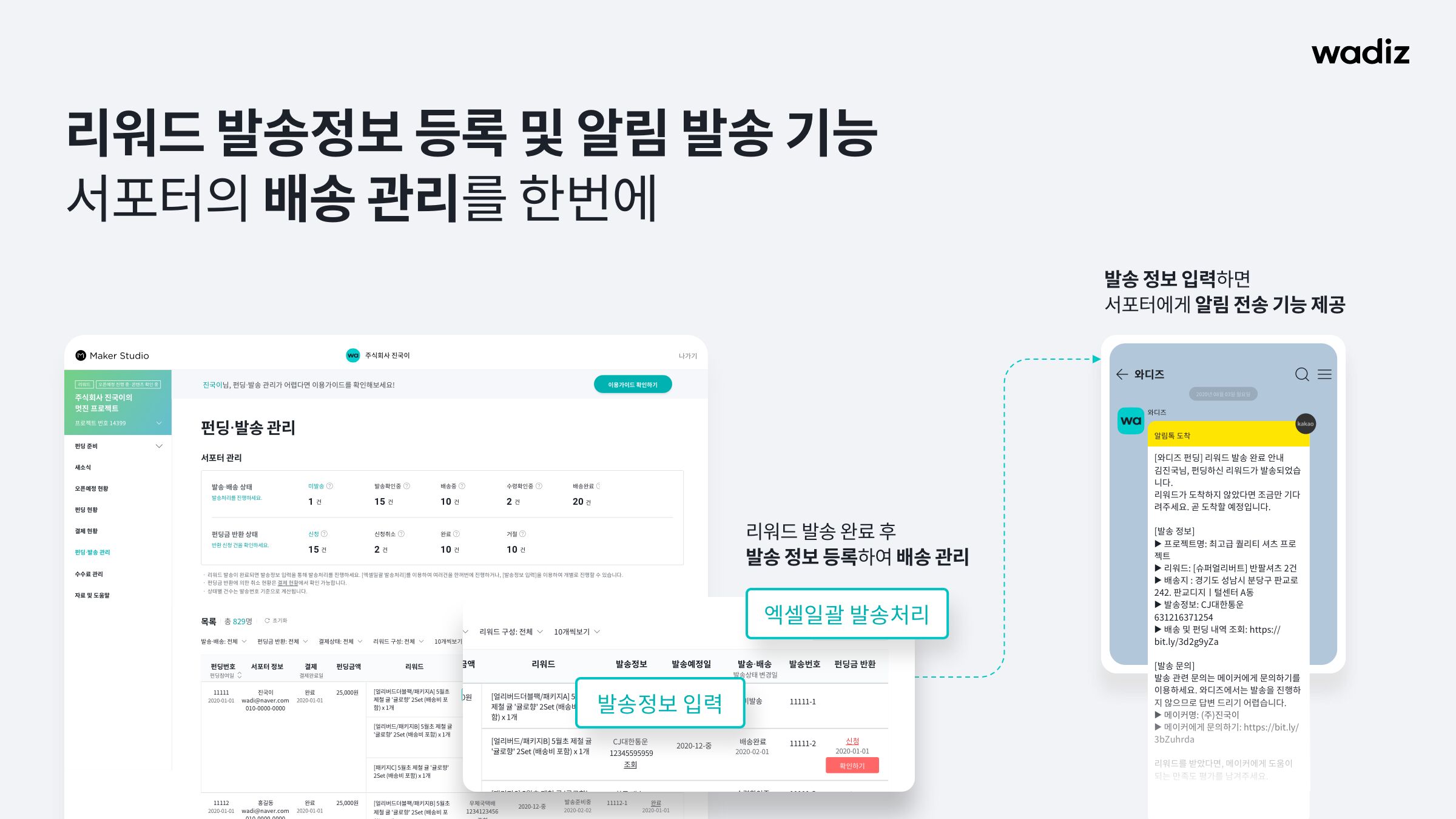 앞으로 메이커 스튜디오 - 펀딩•발송 관리 메뉴에서 서포터의 송장정보를 입력하고 개별로 안내할 수 있습니다.