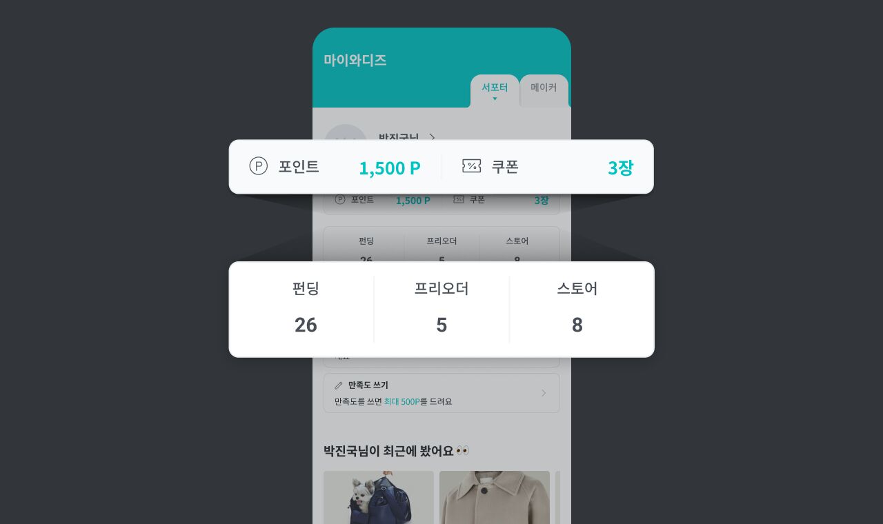 지금 바로 사용 가능한 포인트와 쿠폰 현황을 마이와디즈 가장 위쪽에서 바로 확인할 수 있도록 변경했습니다.