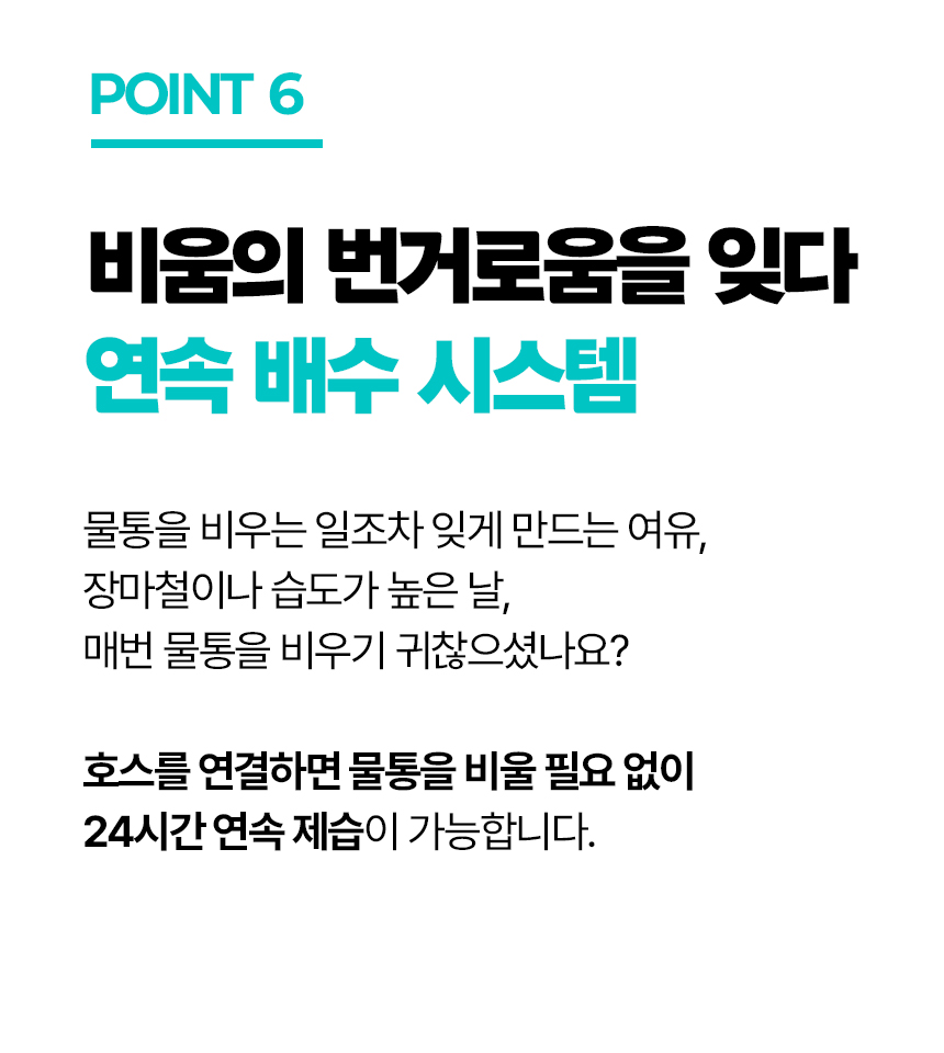 연속 배수 기능을 지원하여, 물통 만수로 인한 제습기 작동 정기 없이 더욱 쾌적하게 사용할 수 있습니다.