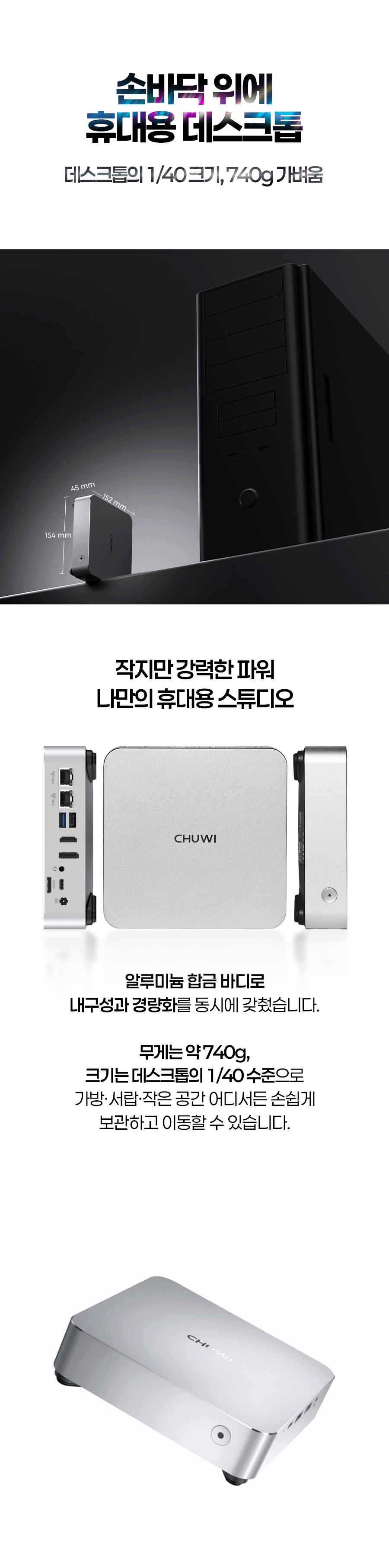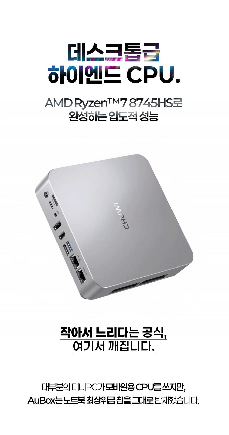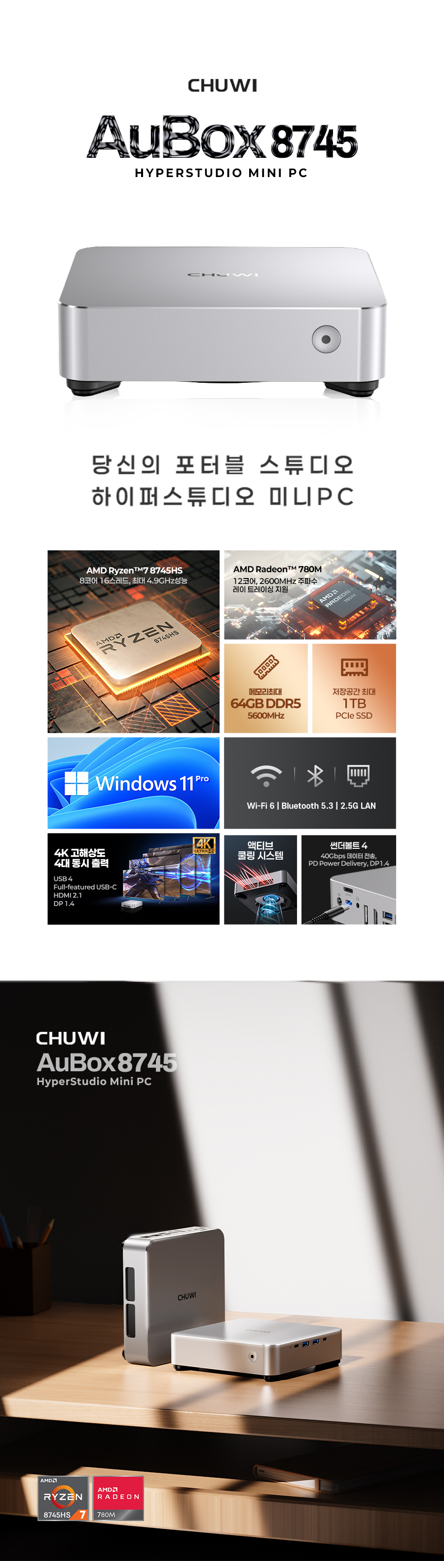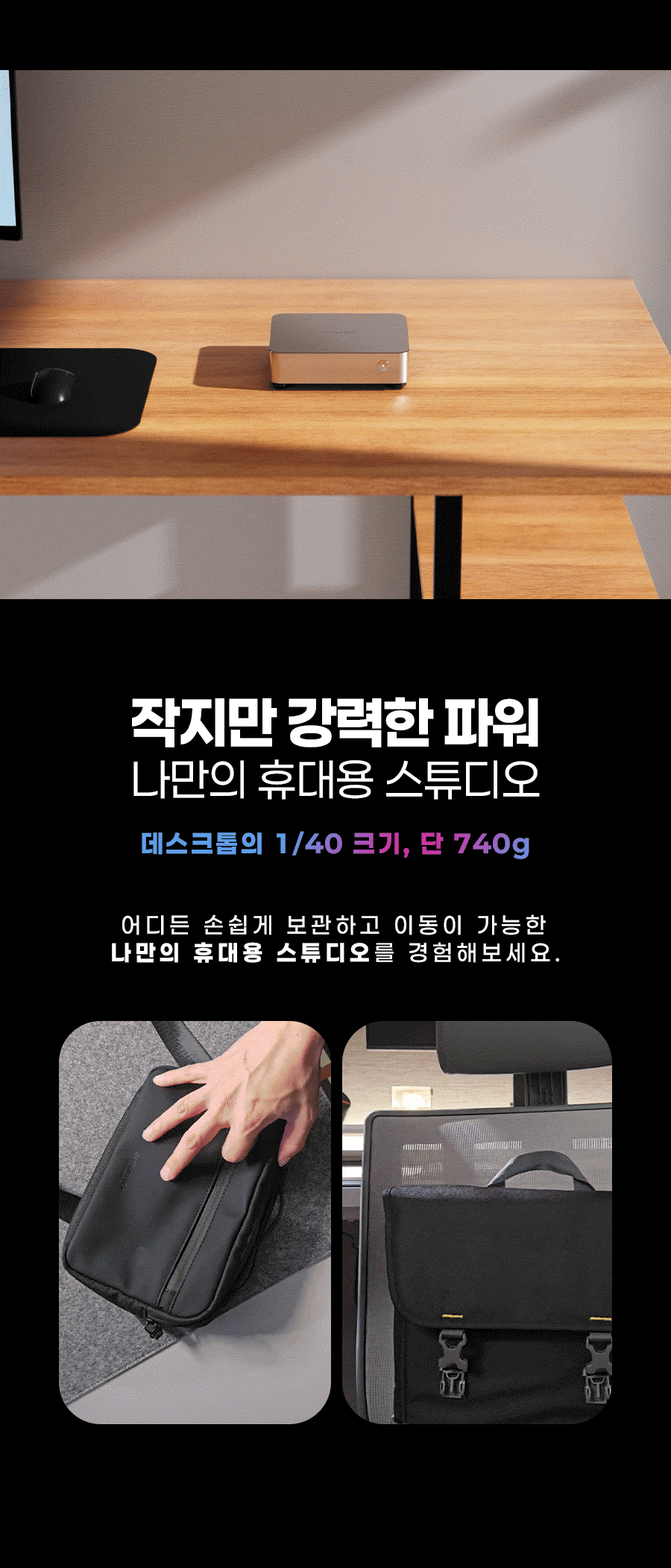 1. 💻 Ryzen 7 탑재 고성능 미니PC - 8코어 CPU와 고성능 내장그래픽으로 데스크탑 성능 구현 2. 📏 컴팩트한 공간 활용 - 데스크탑 대비 1/40 크기, 740g 초경량 디자인 3. 🎁 와디즈 단독 특별 할인 - 울트라 얼리버드 등 다양한 할인 혜택 제공
