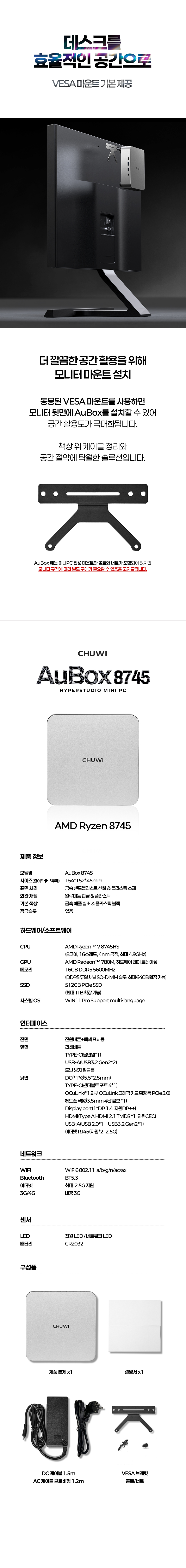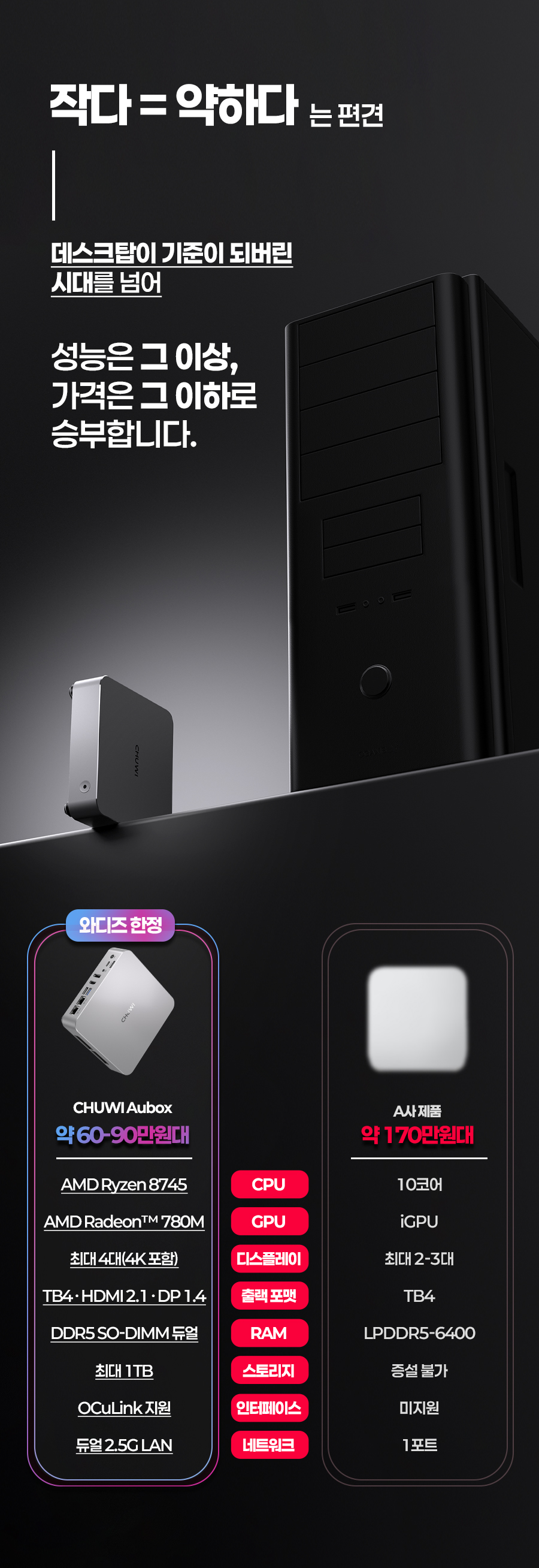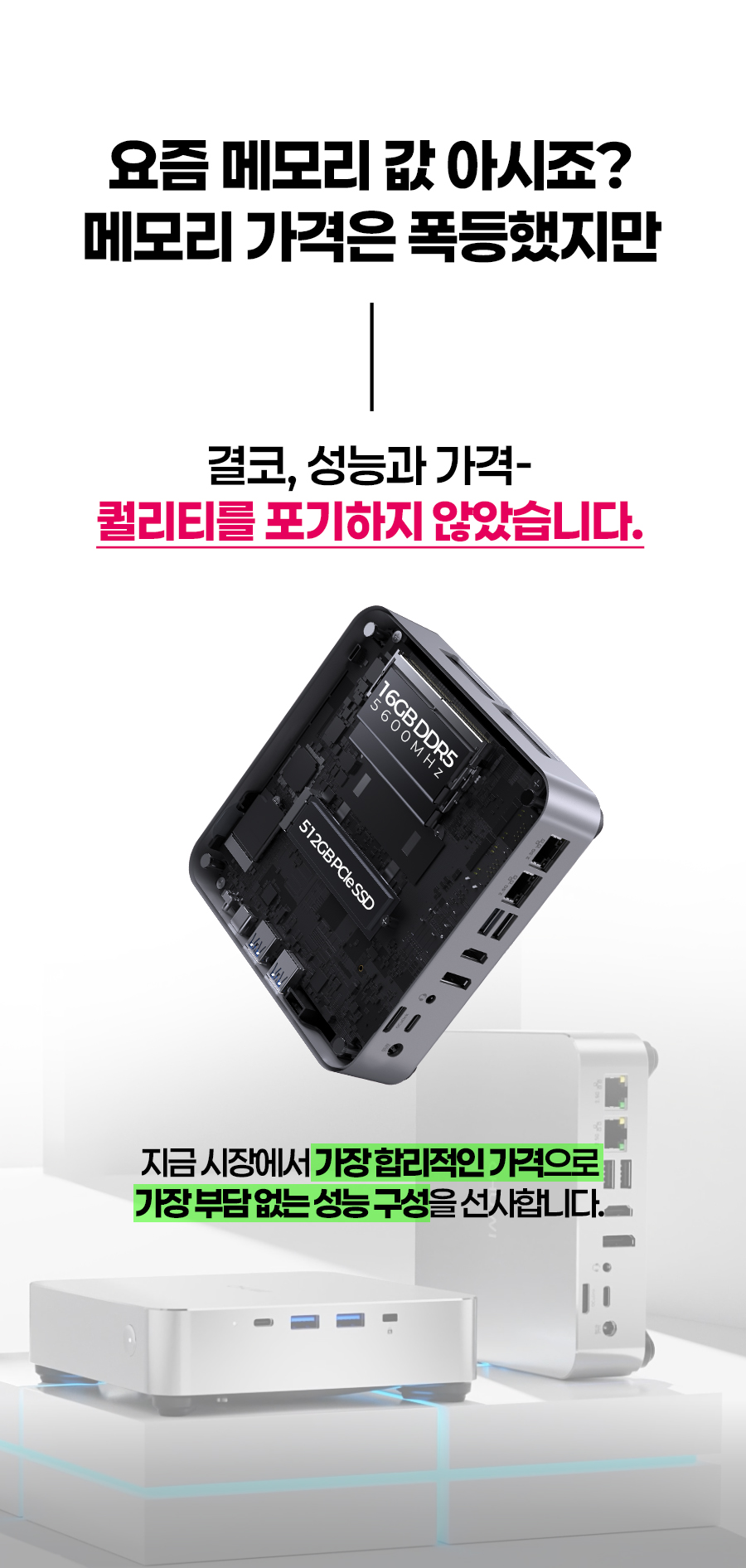 1. 💻 Ryzen 7 탑재 고성능 미니PC - 8코어 CPU와 고성능 내장그래픽으로 데스크탑 성능 구현 2. 📏 컴팩트한 공간 활용 - 데스크탑 대비 1/40 크기, 740g 초경량 디자인 3. 🎁 와디즈 단독 특별 할인 - 울트라 얼리버드 등 다양한 할인 혜택 제공