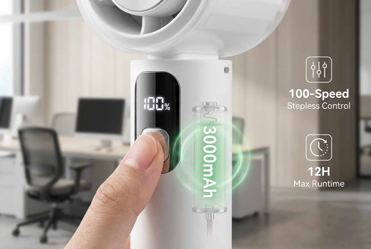 3000mAh 고용량 배터리: 한 번 충전으로 하루 종일 시원함을 유지하며, 출퇴근이나 야외 활동 시 전력 걱정 없이 사용 가능합니다.