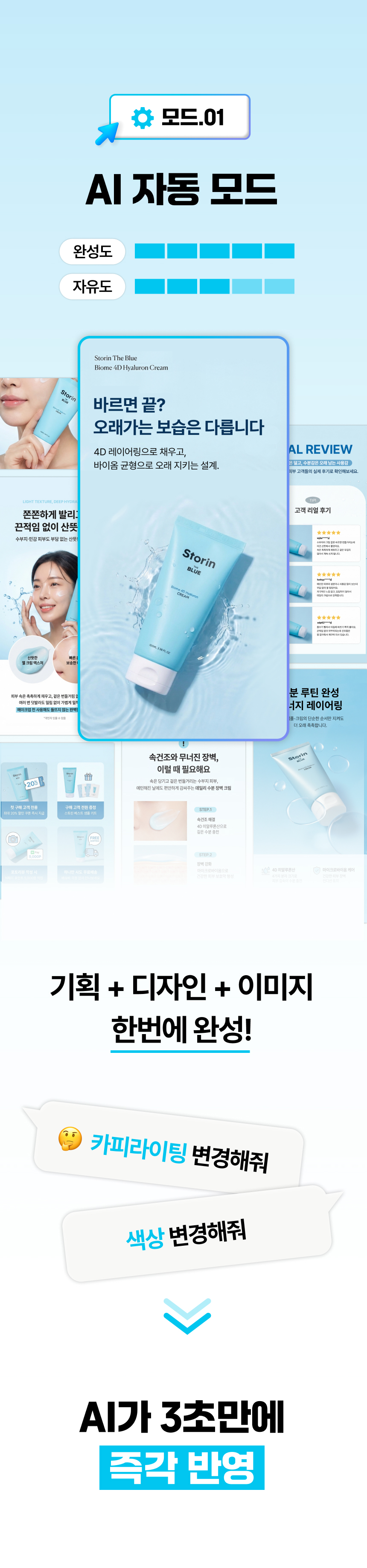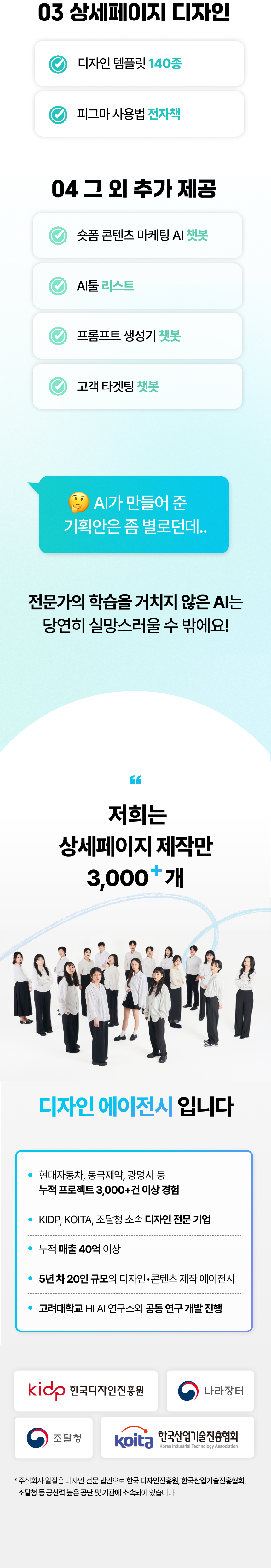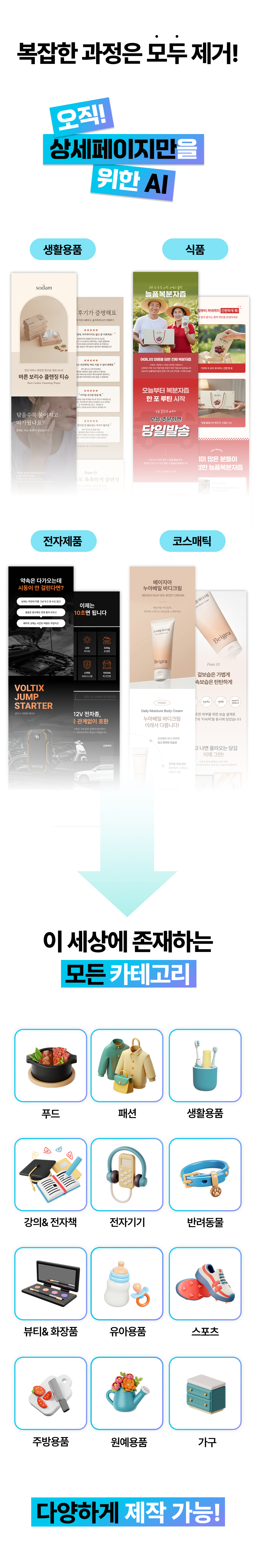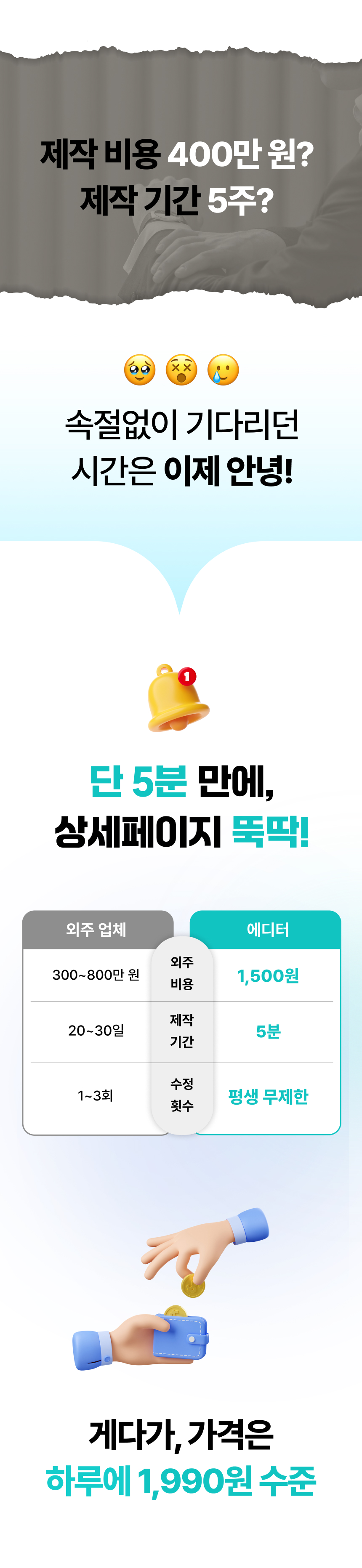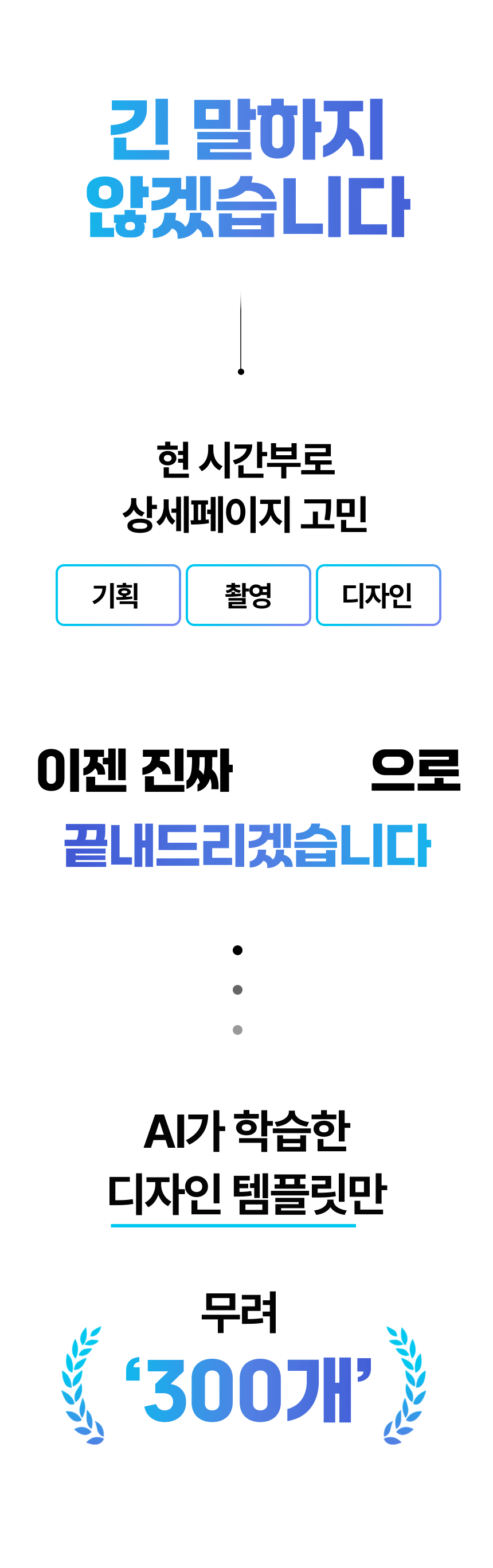 1. 🤖 AI 기반 상세페이지 제작 서비스 - 누적 매출 30억, 3000건 이상 제작 경험 보유 2. ⚡ 빠른 상세페이지 완성 - 클릭 5번으로 5분 내 전문가 수준 상세페이지 완성 3. 💸 외주비 평생 0원 절감 - 저렴한 비용과 무제한 수정으로 외주비 10배 절감