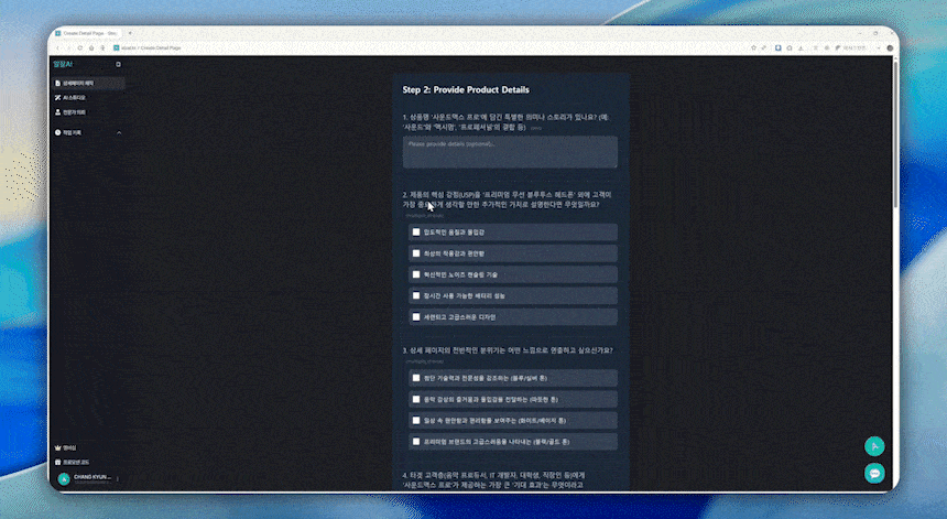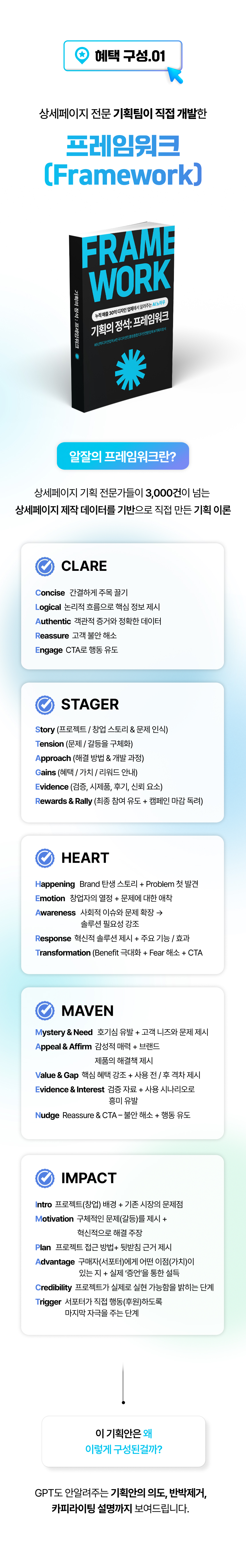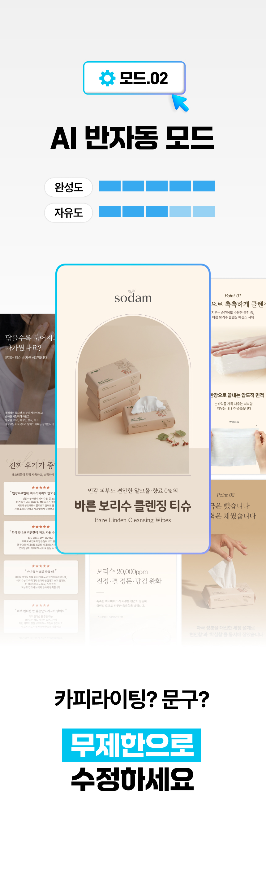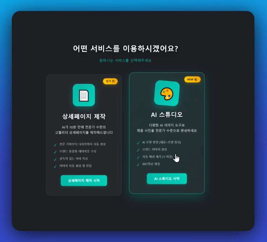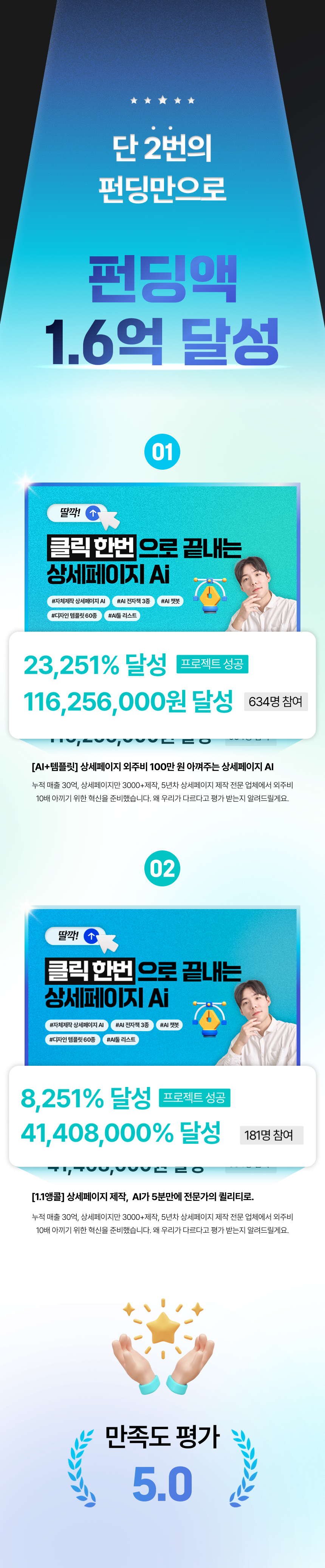 1. 🤖 AI 기반 상세페이지 제작 서비스 - 누적 매출 30억, 3000건 이상 제작 경험 보유 2. ⚡ 빠른 상세페이지 완성 - 클릭 5번으로 5분 내 전문가 수준 상세페이지 완성 3. 💸 외주비 평생 0원 절감 - 저렴한 비용과 무제한 수정으로 외주비 10배 절감