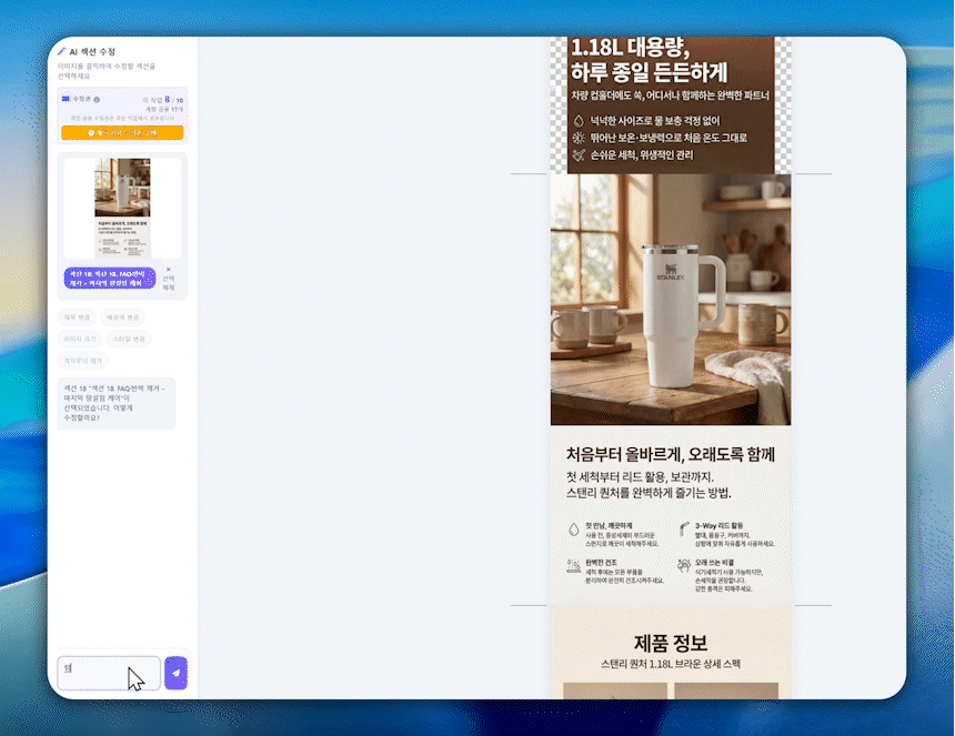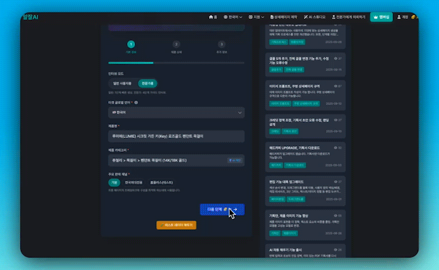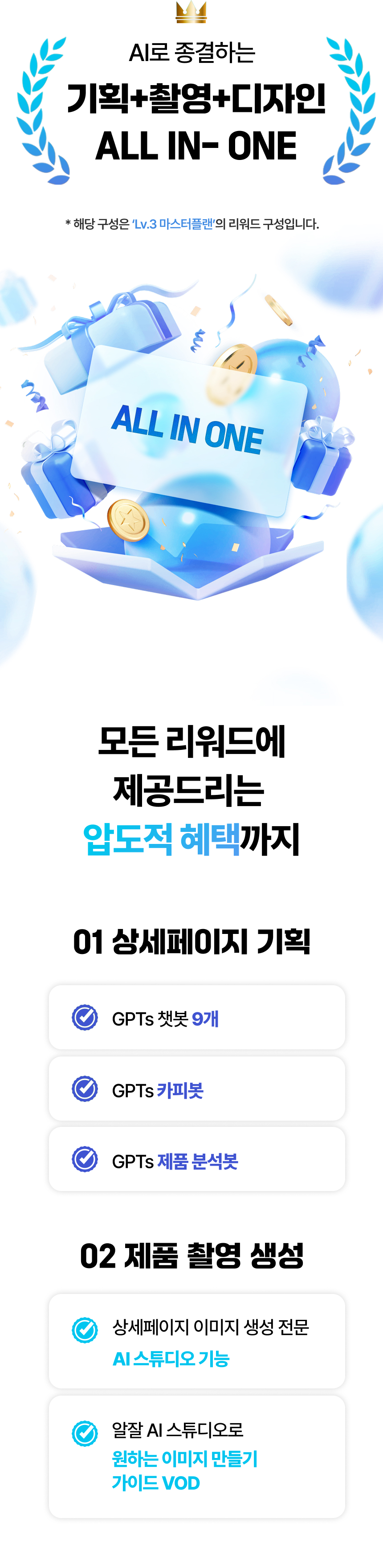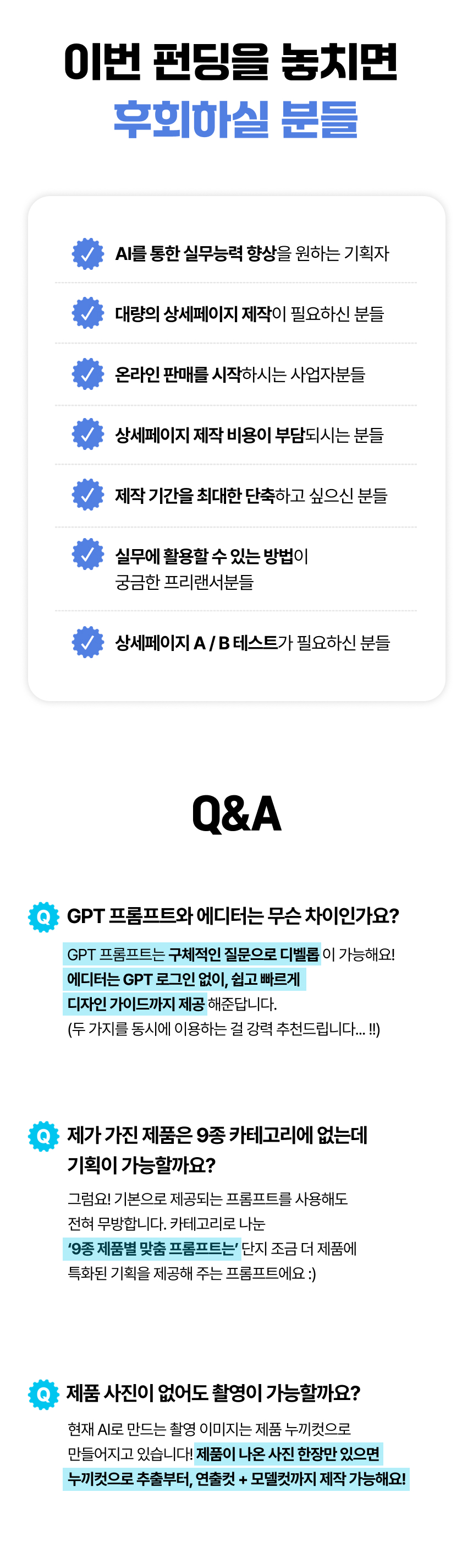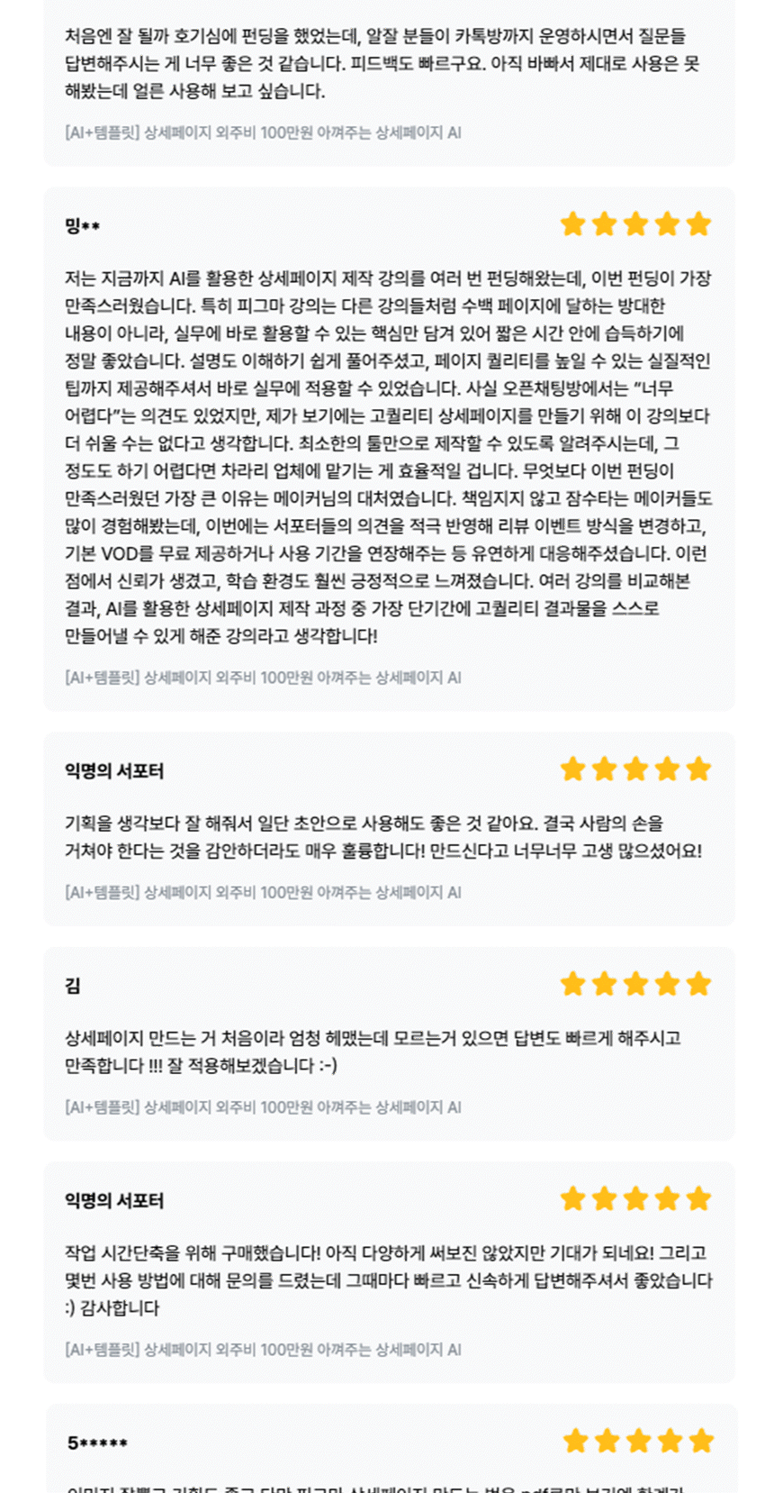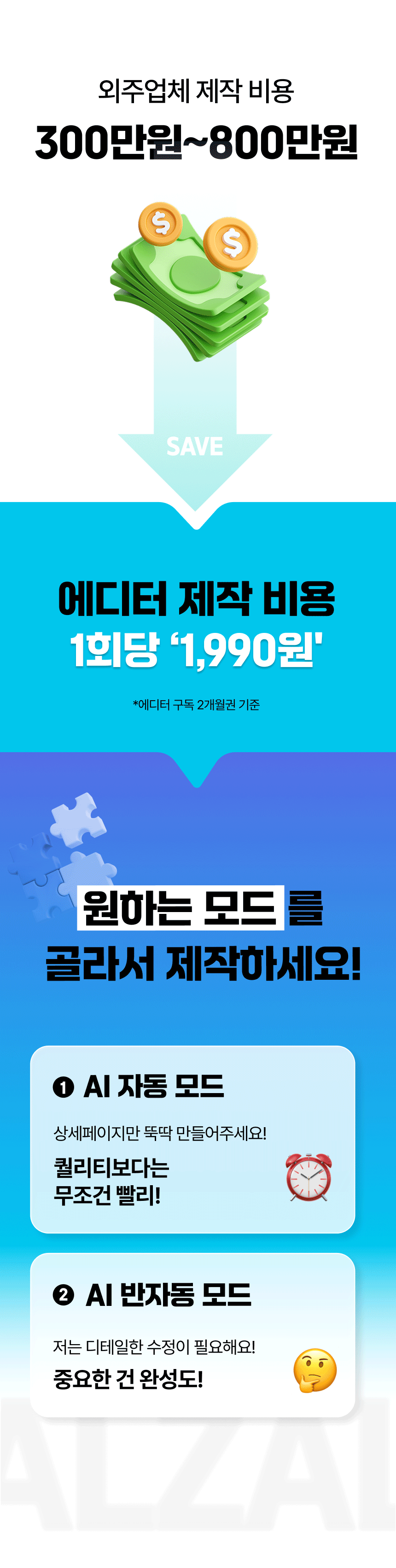 1. 🤖 AI 기반 상세페이지 제작 서비스 - 누적 매출 30억, 3000건 이상 제작 경험 보유 2. ⚡ 빠른 상세페이지 완성 - 클릭 5번으로 5분 내 전문가 수준 상세페이지 완성 3. 💸 외주비 평생 0원 절감 - 저렴한 비용과 무제한 수정으로 외주비 10배 절감