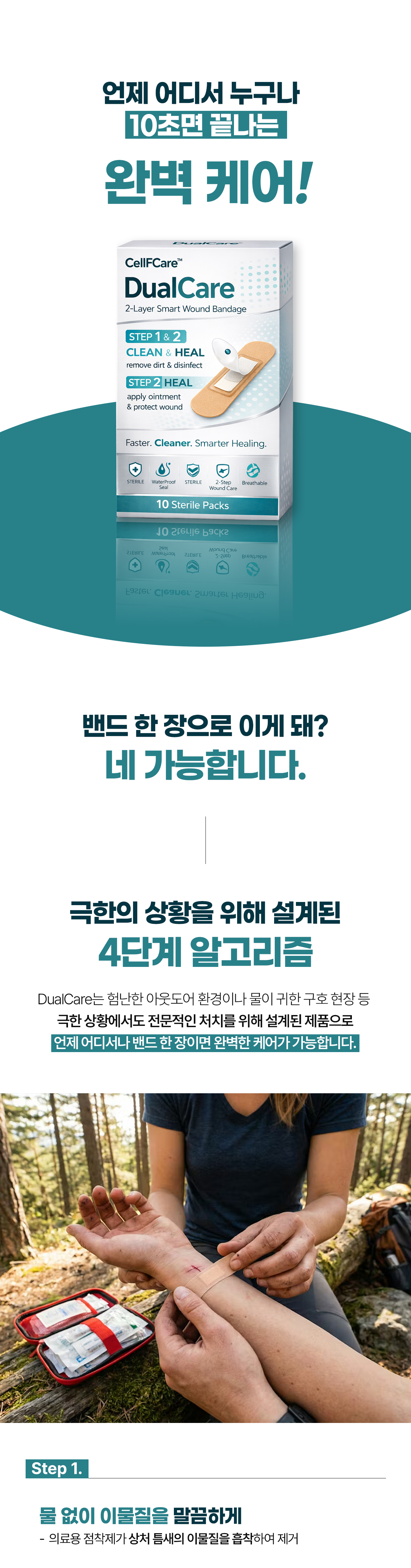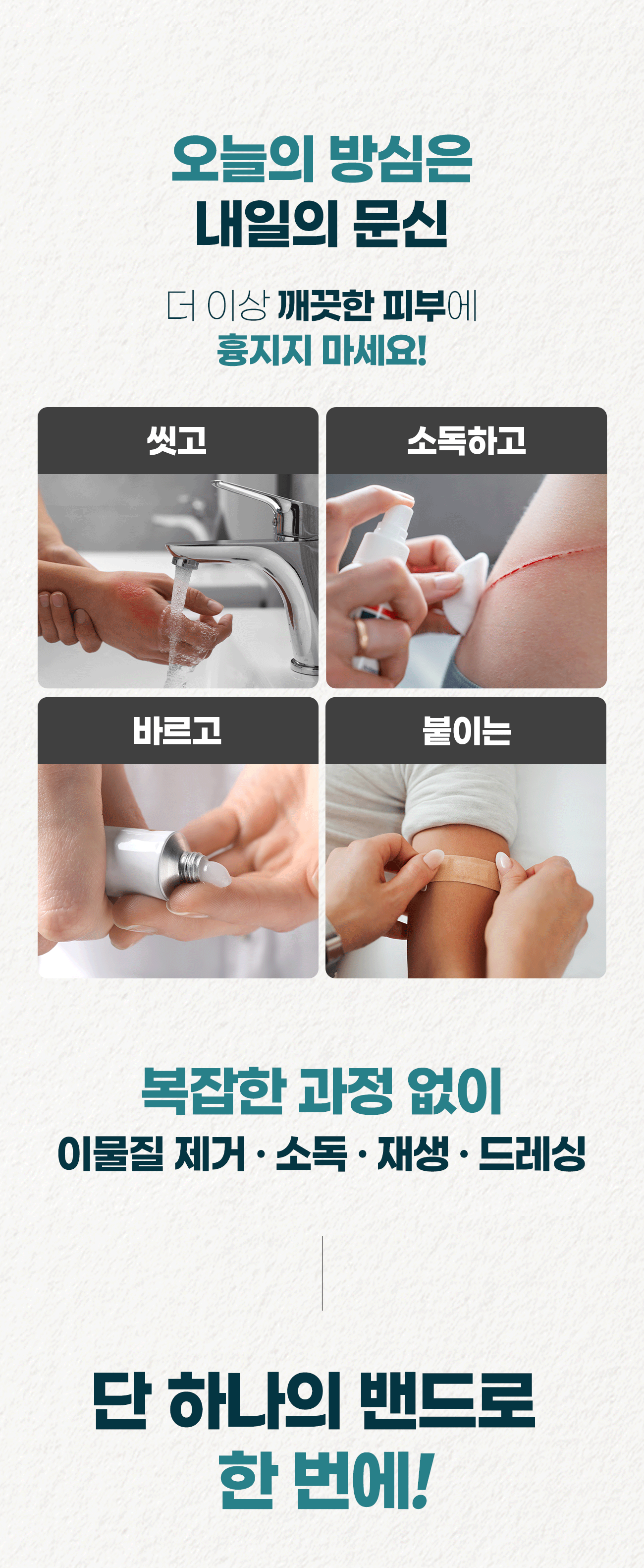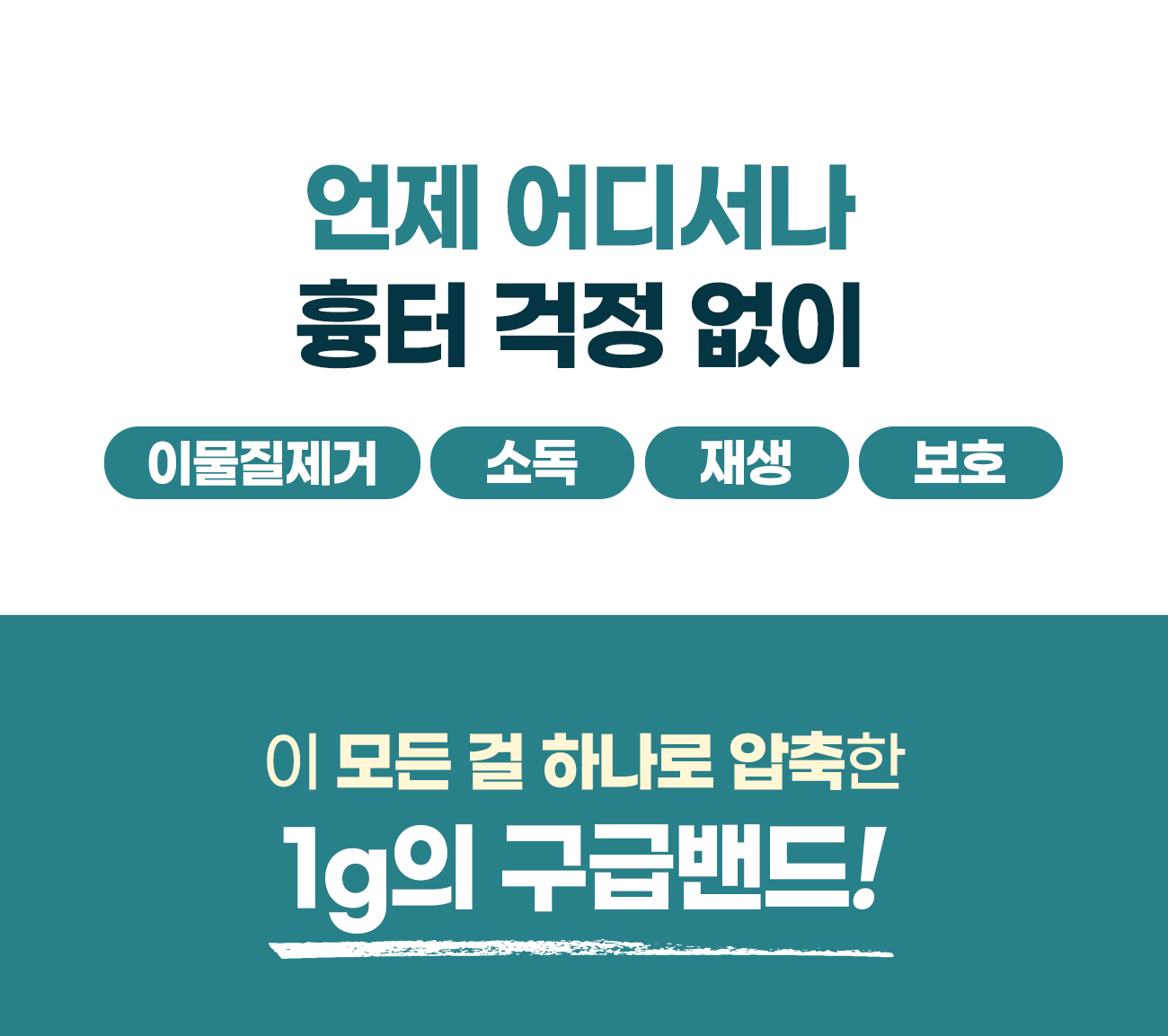 저희는 이 6단계의 번거로움을 단 한 장의 밴드에 집약했습니다. 이번 펀딩을 통해 "세척과 소독이 동시에 되는 2-Layer 밴드"의 시장 가치를 검증하고, 많은 서포터분의 피드백을 바탕으로 대한민국 응급 키트의 표준을 바꾸고 싶습니다.