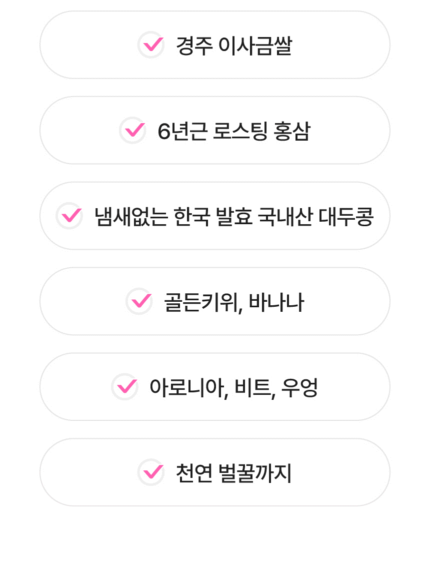 - 로스팅 홍삼과 콩발효, 쌀발효 기반 식품은 단품으로도 쉽게 ‘매일’ 챙기기 어렵습니다.