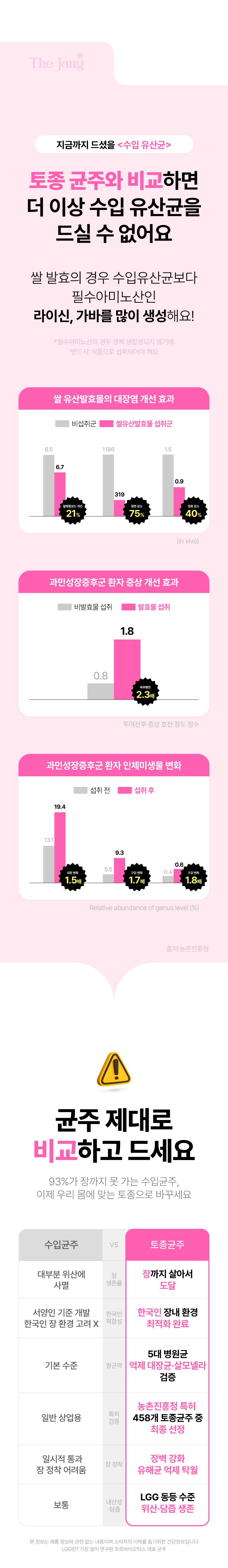 - 위 소장에 유산균 + 대장에 비피더스균 + 청국장 고초균 + 쌀누룩 황국균 발효
