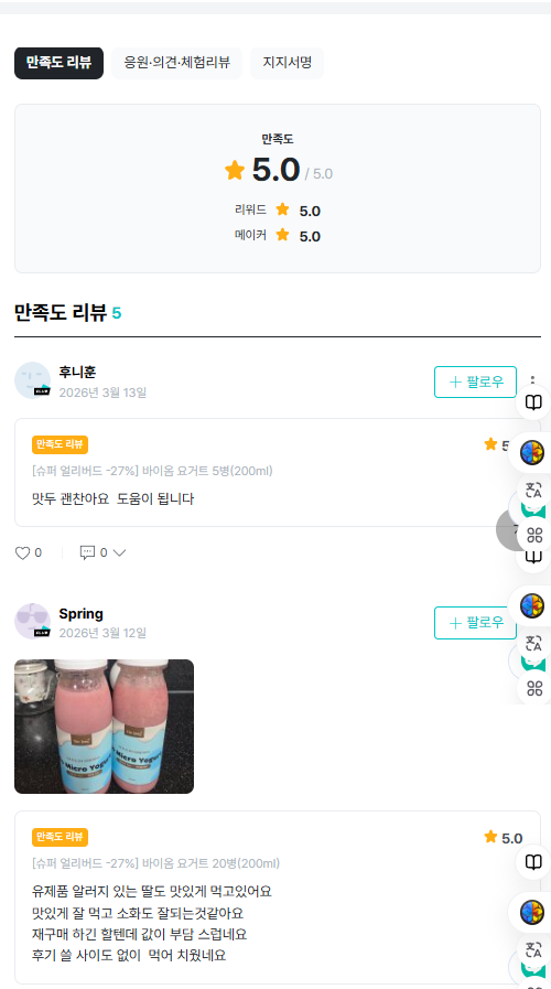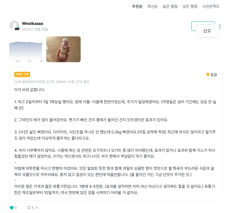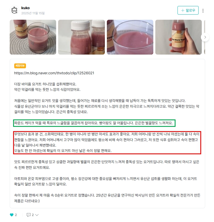 - 유당불내증이 있어서 요거트 좋아하면서도 먹고 나면 속 불편한 경우가 많았는데, 이 요거트는 먹자마자 느낌이 좀 달랐어요. 속이 꾸르륵거리거나 더부룩한 게 전혀 없고, 진짜 편안했어요.👍🏻👍🏻👍🏻 저는 주로 저녁에 먹었는데 늦게 먹어도 부담 없었고, 오히려 속이 정리되는 느낌이라 잠도 잘 오더라고요. 며칠 먹으니까 아침에 화장실 가는 것도 훨씬 수월해져서 진짜 만족스러워요! 보통 요거트 특유의 신맛이나 쿰쿰한 향 때문에 잘못먹는데 이건 맛도 깔끔하고 은은해서 먹기 편했어요. 단맛도 인위적이지 않고 자연스러운 편이라 아이부터 어른까지 무난하게 먹기 좋을 것 같아요.🤗- 율이율이