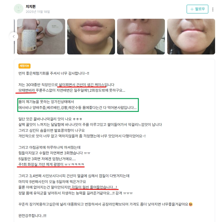 - 남편은 오래전부터 과민성대장증후군(IBS)로 복통, 잦은 배변 신호, 변비와 설사를 반복하며 일상에서 많은 불편을 겪어왔어요. 외출이나 회의, 장시간 이동이 있는 날이면 항상 긴장 상태였고, 스트레스가 쌓일수록 증상도 더 심해지는 악순환이 반복됐습니다. 옆에서 지켜보는 입장에서도 마음이 많이 쓰였어요. 이번 제품은 “과민성대장증후군을 겪는 사람의 일상”을 충분히 이해하고 만든 느낌이 들어 더 기대가 컸습니다. 단순히 건강을 챙긴다는 개념이 아니라, 실제 생활 속 불편함을 조금이라도 줄여주길 바라는 마음으로 사용을 시작했어요. 며칠 사용해본 결과, 남편이 가장 먼저 말한 건 장에 대한 부담감이 덜하다는 점이었습니다. 예민하게 반응하던 복부 불편감이 이전보다 완화되면서, 식사 후나 외출 전의 긴장도가 눈에 띄게 줄었어요. 무엇보다 “오늘은 배 때문에 하루를 망치지 않아도 될 것 같다”는 말을 들었을 때, 이 제품을 선택하길 잘했다는 생각이 들었습니다. - 알콩맘