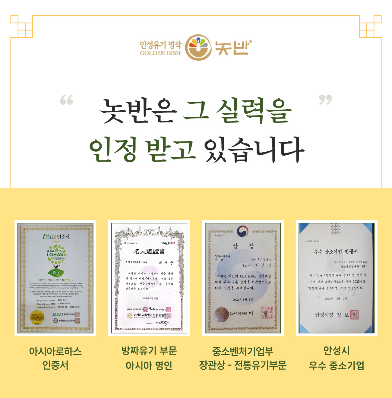 놋반은 행복하고 건강한 생활을 위한 유기제품을 만들고자 합니다. 또한 천년의 역사가 고스란히 담겨 있는 우리 유기를 세계로 널리 알리기 위해 부단히 애쓰고 있습니다.