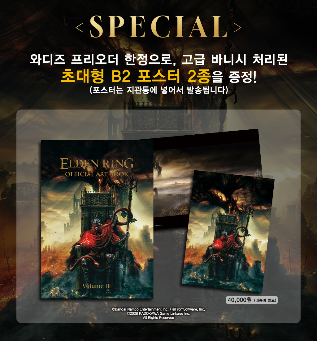 1. 📖 엘든 링 공식 아트북 Vol.III - 다크 판타지 세계관과 DLC 아트워크를 고품질로 수록 2. 🎨 팬과 컬렉터를 위한 한정판 구성 - 초대형 B2 포스터 2종 포함, 소장 가치 극대화 3. 🎁 와디즈 프리오더 한정 특전 - 고급 바니시 처리된 초대형 B2 포스터 2종 증정