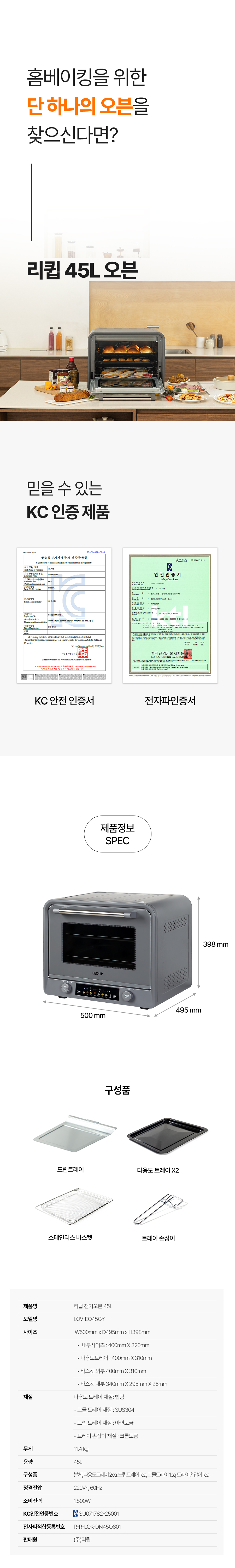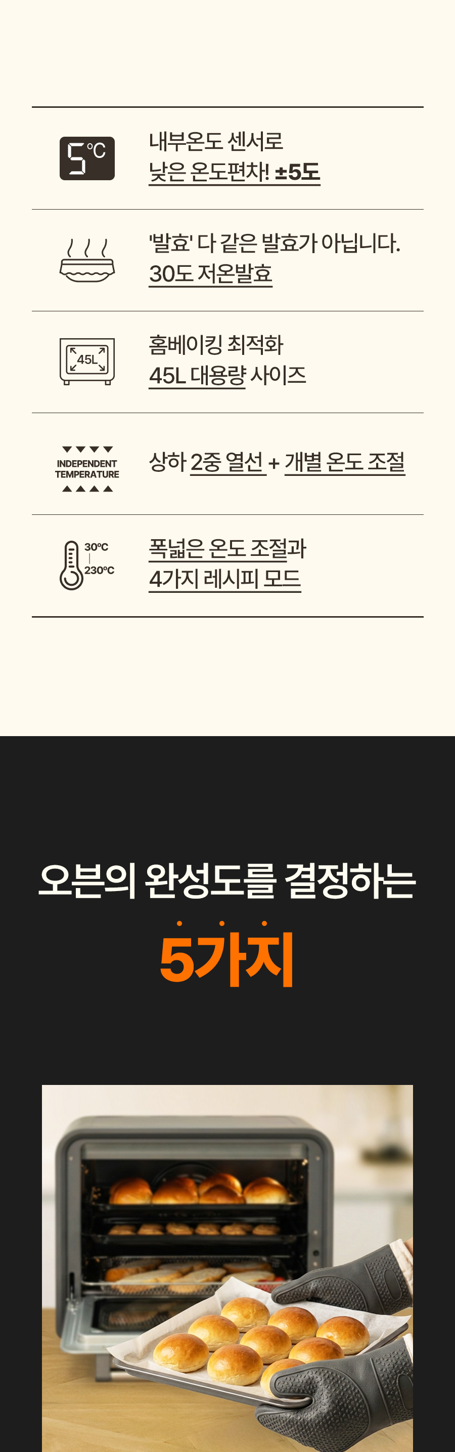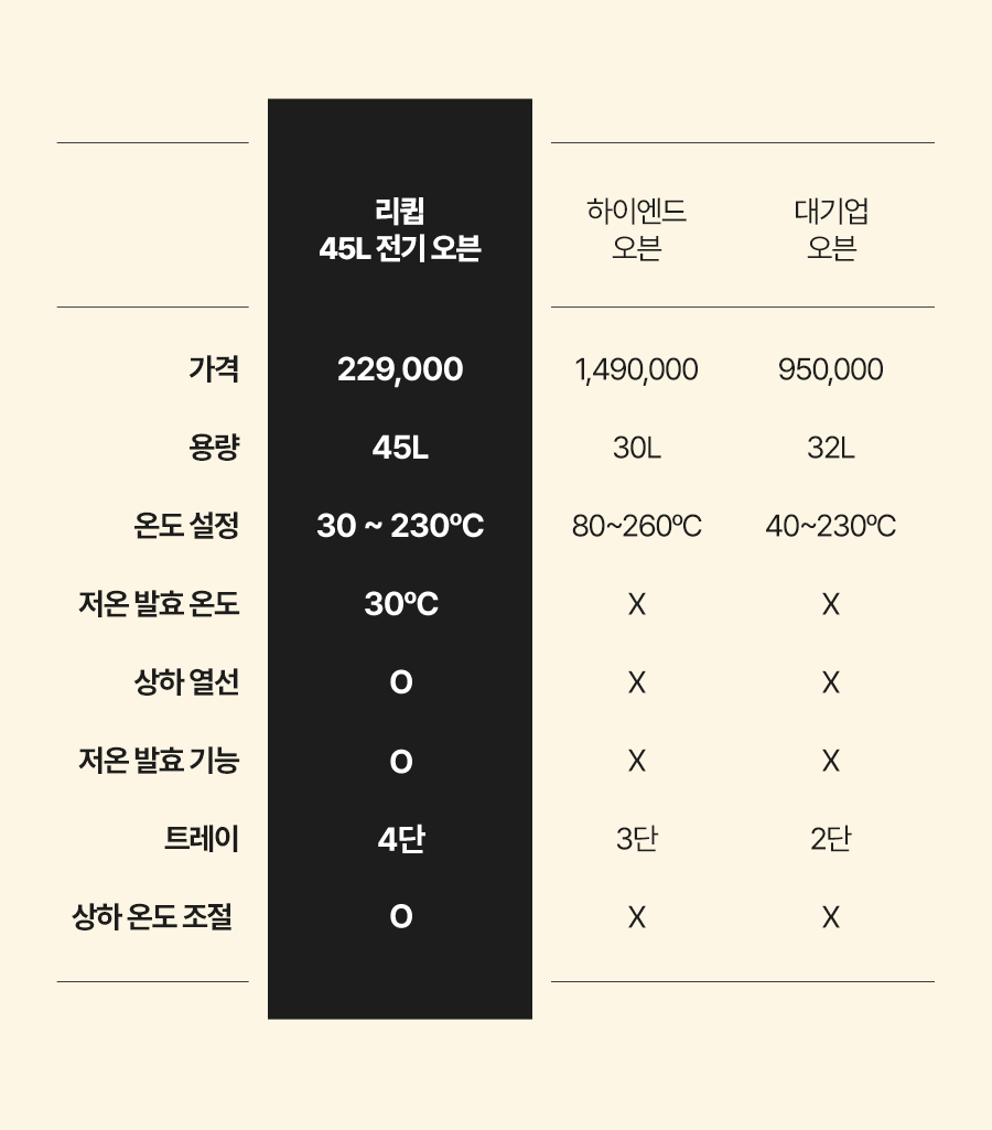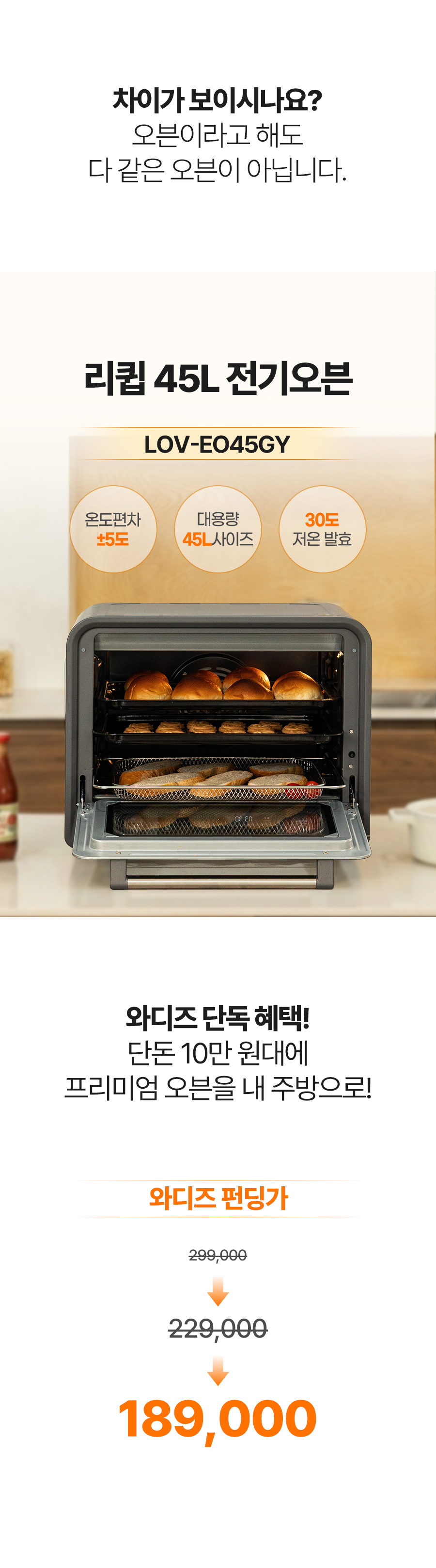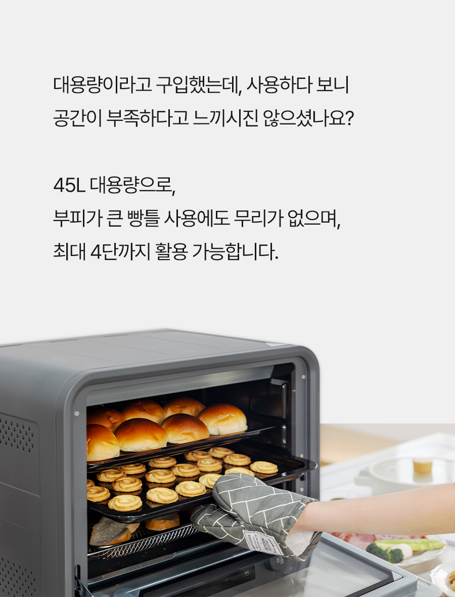 1. 🍞 45L 대용량 전기오븐 - 넉넉한 45L 용량으로 다양한 베이킹 가능 2. 🌡️ 정밀 온도 조절 기능 - 내부 온도센서로 온도 편차 ±5도 유지 3. 🎁 와디즈 단독 혜택 - 10만원대 합리적 가격에 프리미엄 오븐 제공