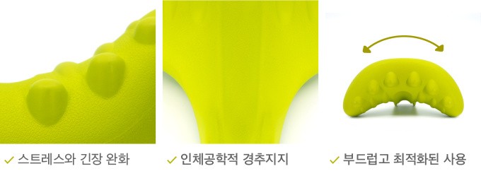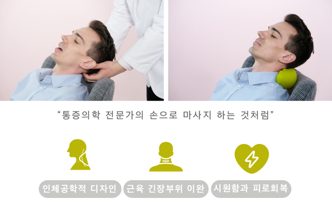 Lime은 특별한 설명없이도 모두가 직관적으로 사용하실 수 있습니다. 여러개의 지압점이 좀 더 넓은 범위의 근막과 근표면을 마사지해 줍니다. (천주혈,풍지혈+천유혈) 처음 사용하시더라도 불편함을 유발하지 않으며 목의 긴장과 스트레스를 푸는 것에 집중한 디자인 입니다.