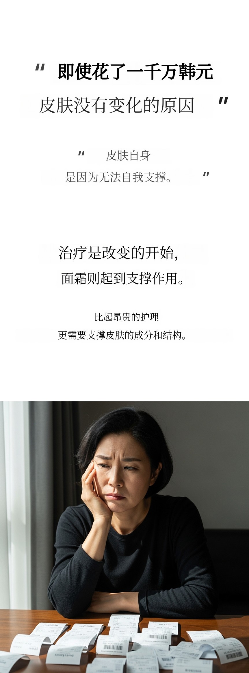 照顾孩子,做家务,忙于各种事情,不知不觉一天就这样过去了。经历了生育和育儿后,镜子里的我的皮肤已经和以前不同了。变得暗淡无光,似乎失去了弹性,色斑和皱纹的烦恼也逐渐浮现。但真正为自己涂抹多重护肤品的时间,总是被排在最后。含有好成分的产品有很多。但在忙碌的日常中,每天会用到的产品其实并不多。太厚重、浮于表面,或者需要多重叠加才能满意的护肤流程,现实中很难长期坚持。也没有太多时间经常去皮肤科,但又不能随便选择产品。所以我一个个查找并比较了百货公司一楼的高端面霜和皮肤科常提到的成分。有的产品价格高但成分令人失望,有的成分看起来不错但实际用起来并不想每天使用。
