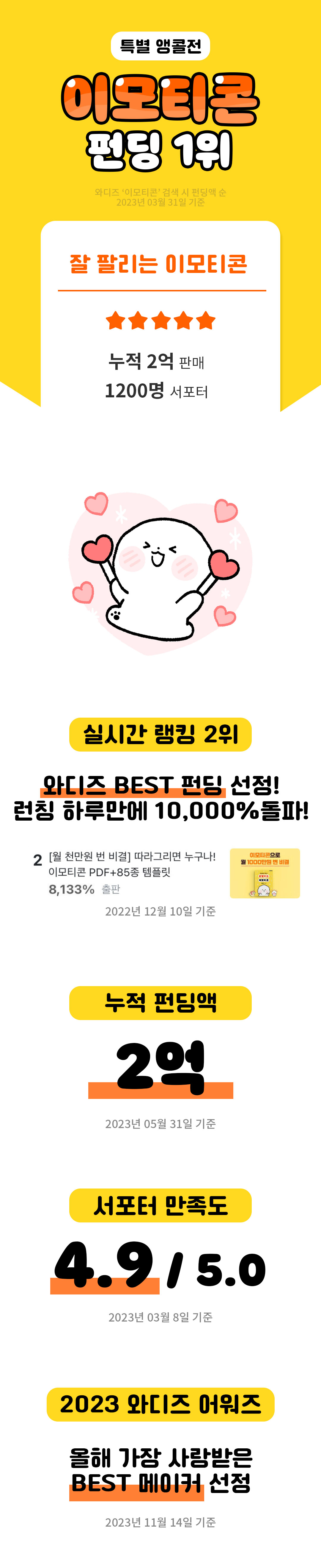 이번 프리오더는 이와 같은 경험을 바탕으로 저와 같은 시행착오 없이 이모티콘 제작 경험이 없으신 분들도 따라오실 수 있도록 처음부터 1위를 하며 잘된 케이스가 아닌 이모티콘 시장 초창기부터 7년 간 다양한 컨셉으로 도전하며  인기순위를 역주행했던  저만의 경험과 기왕 창작하는 이모티콘으로 일러스트, 애니메이션  등 캐릭터 브랜딩을 통해 더 많은 수익을 창출할 수 있었으면 하는 마음을 더해 만들어졌습니다.