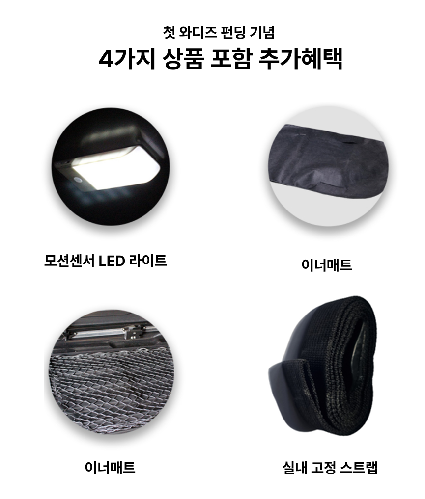 구성품 : 본체, 열쇠 2개, 이너매트, 모션센서 LED, 이너네트, 고정 스트랩 2개