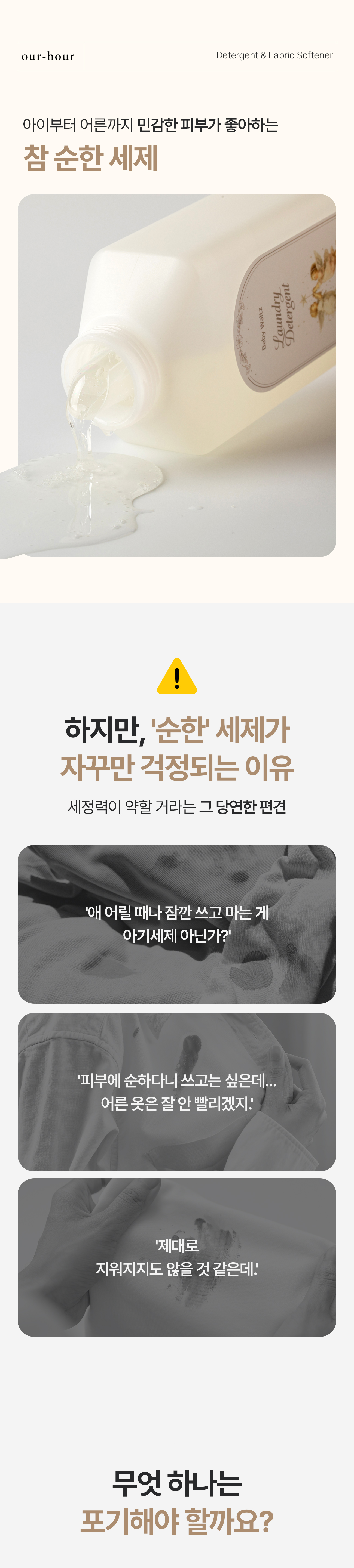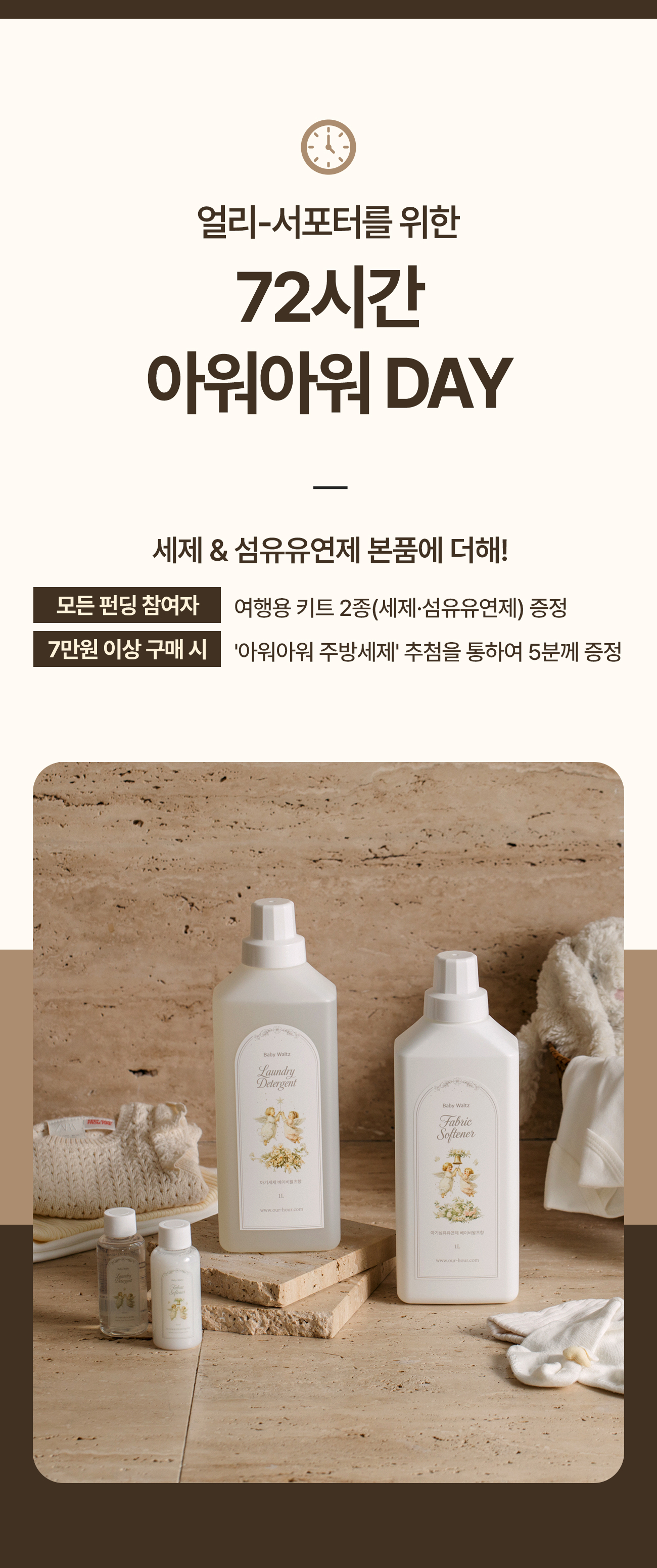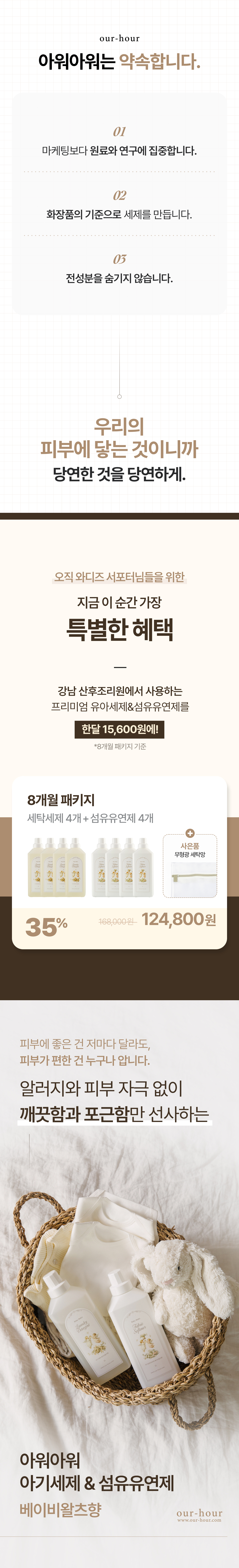 우리는 화려한 광고 대신, 소비자와 직접 만나는 와디즈를 선택했습니다. 아워아워의 세제가 진짜 좋은지, 성분의 차이가 세탁 후 얼마나 다르게 느껴지는지 가장 객관적인 검증자는 바로 ‘고객’이라 믿기 때문입니다.