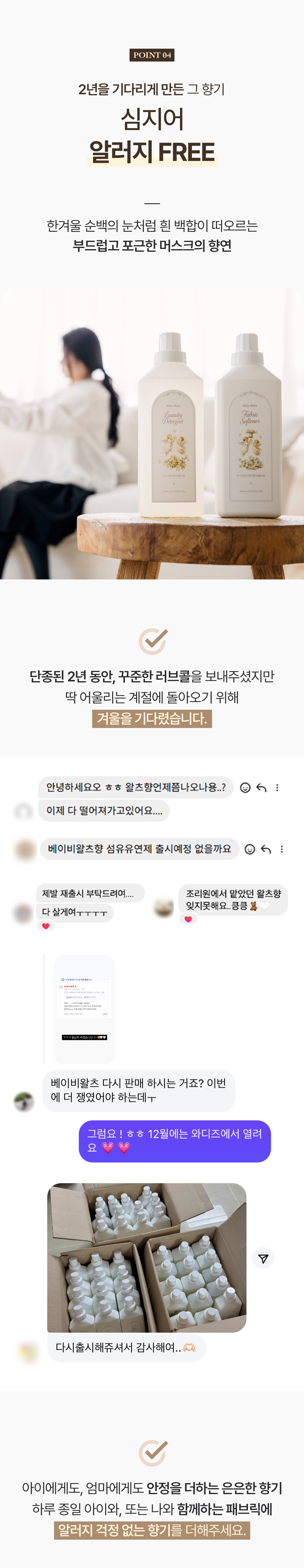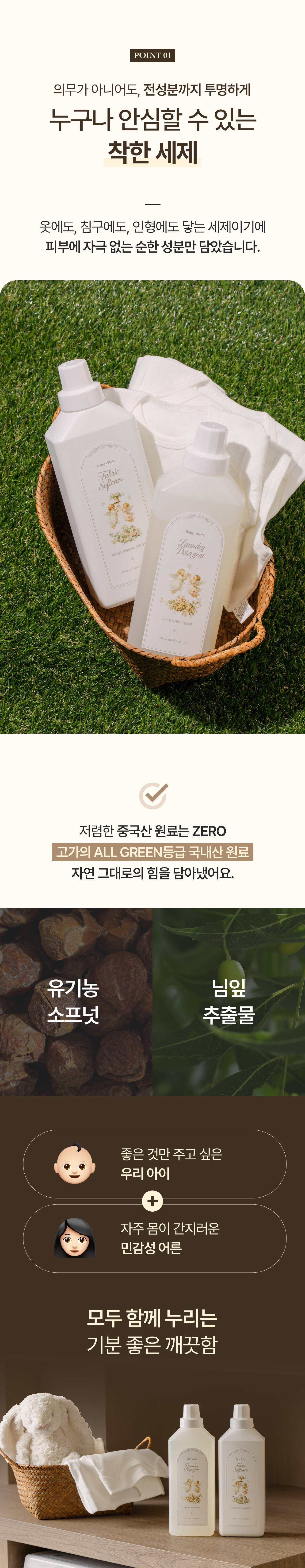 하루 종일 손수건과 이불에 얼굴을 비비고, 입에 문 채로 잠드는 아이를 보며 깨달았어요. 세제는 단순히 옷을 깨끗하게 하는 제품이 아니라, 아기의 하루를 만들어주는 첫걸음이라는 것을요.