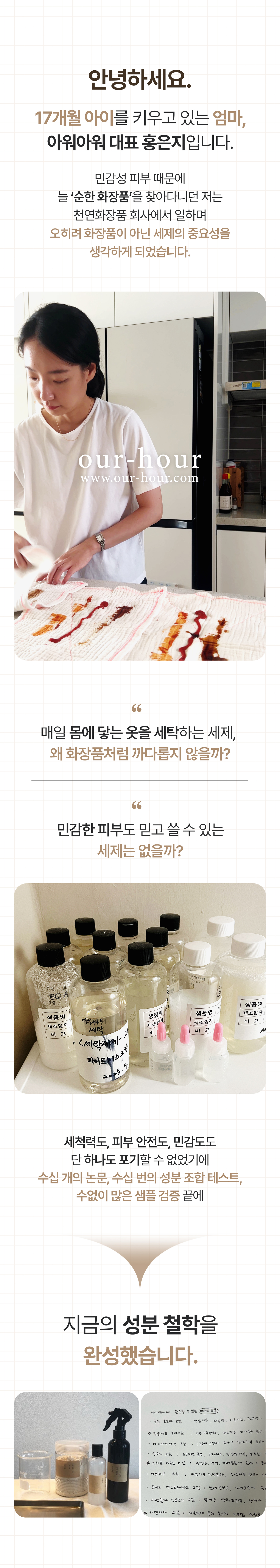 아워아워는 과도한 마케팅비 대신 모든 비용을 제품 연구와 원료 개발에 투자했습니다. 중국산 원료는 단 1g도 사용하지 않고, EWG 그린등급의 안전한 성분만으로 ‘피부에 닿는 화장품 기준의 세제’ 를 완성했습니다.