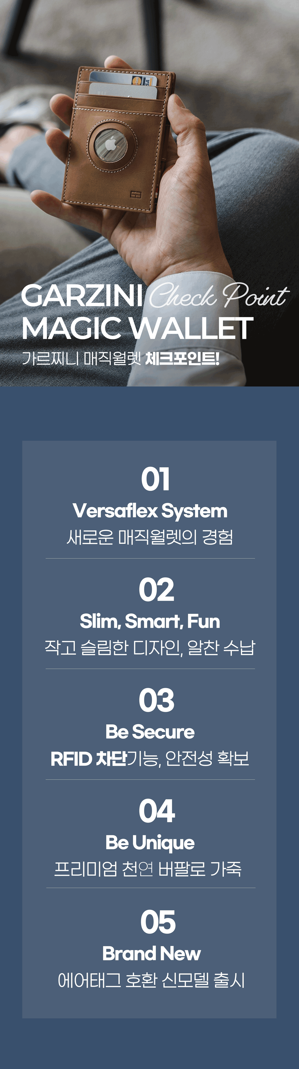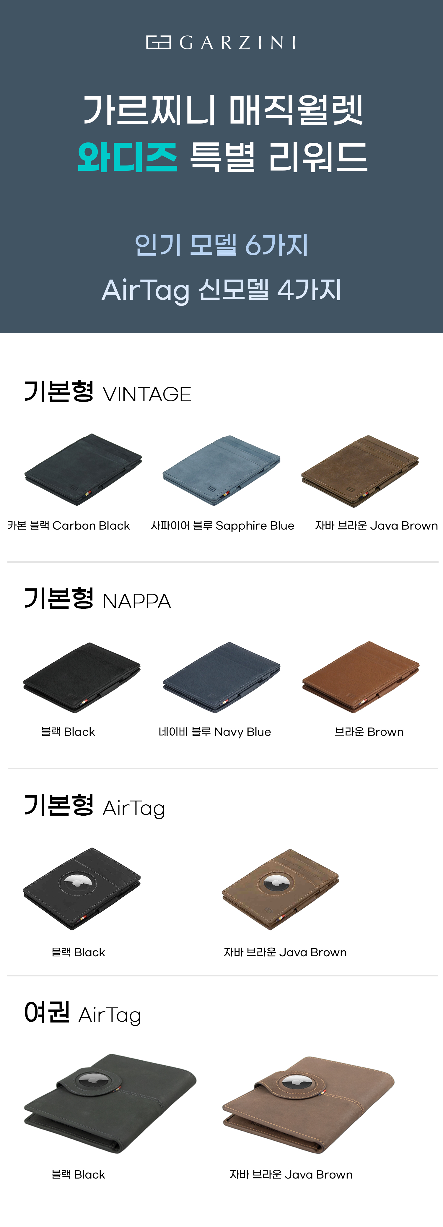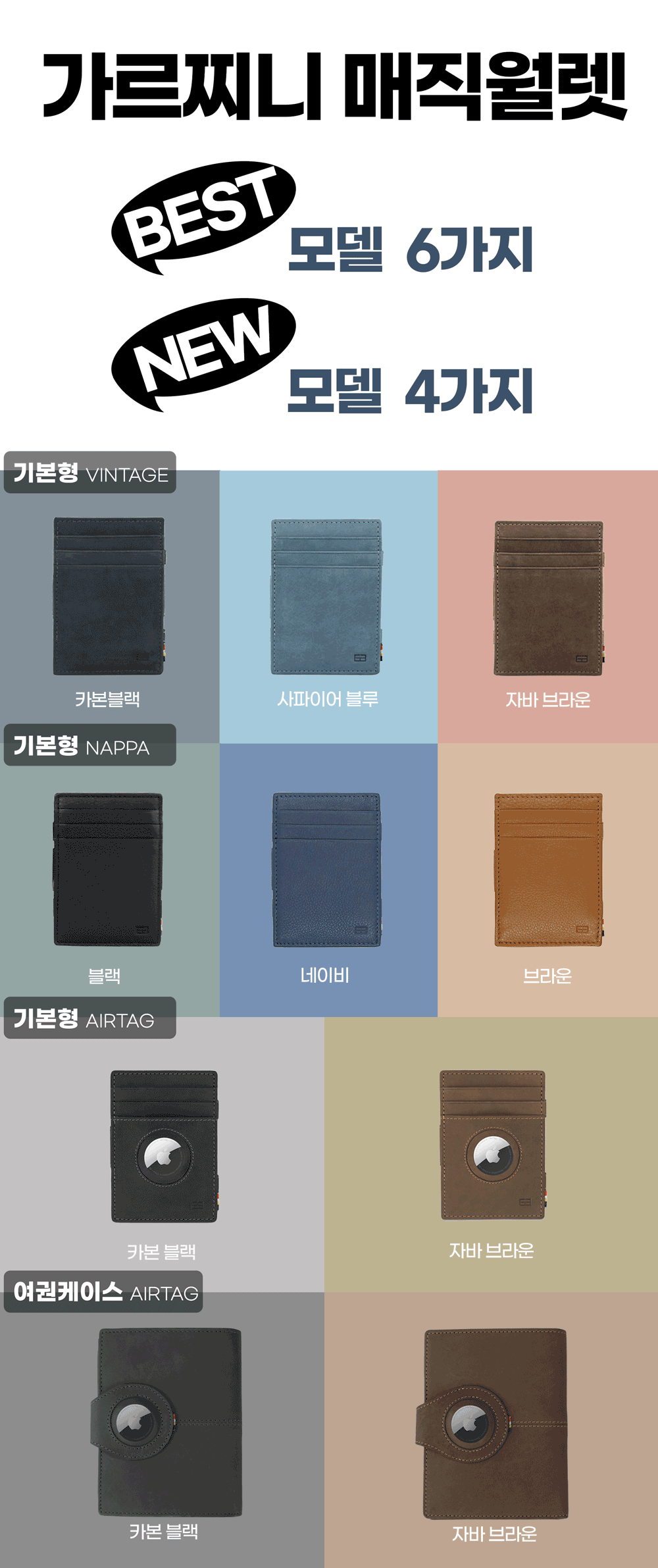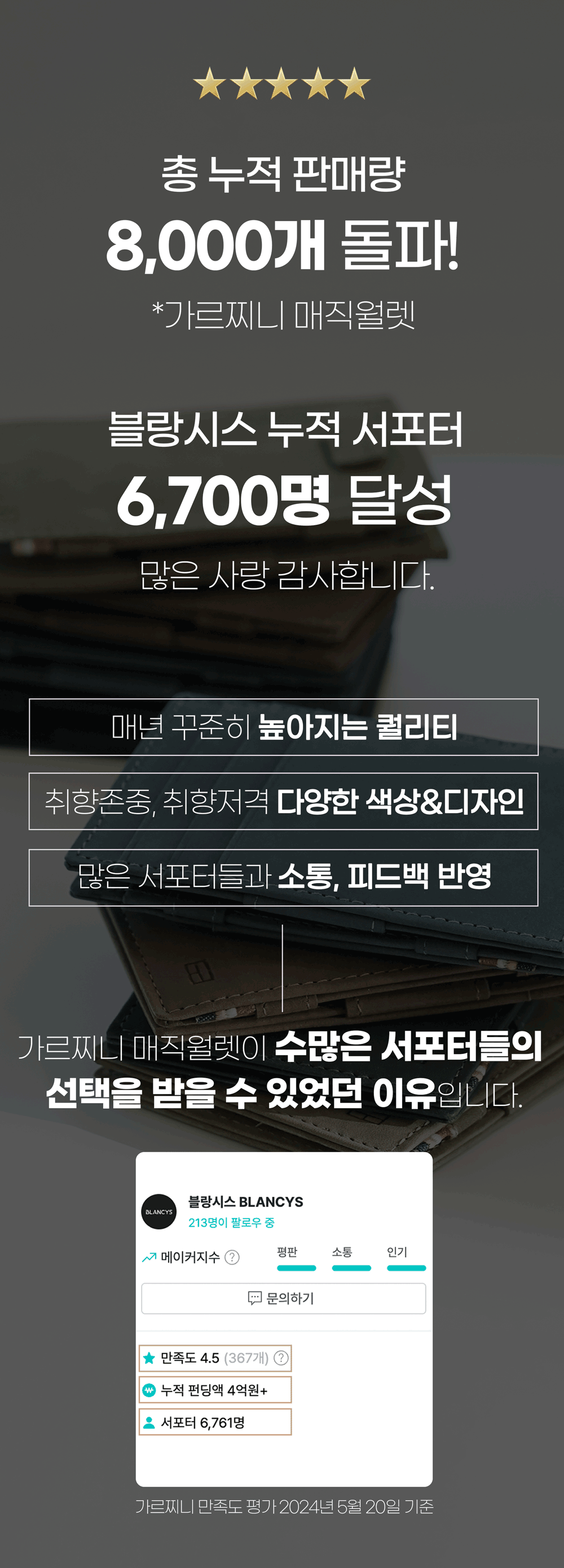 가르찌니 매직월렛을 처음 만났던 그 때를 잊을 수가 없습니다. 어디에서도 볼수 없었던 Versaflex System의 신박함과 수납의 용이성, 패셔너블하고 심플한 디자인에 반했습니다. 2016년 독일에서 처음 가르찌니와 인연을 맺고 줄곧 매직월렛을 사용하면서, 시간이 흐를수록 자연스럽고 더욱 멋스러운 기품을 더하는 가르찌니 천연가죽의 매력에 흠뻑 빠졌습니다. 참 많은 서포터님들께 받은 과분한 사랑에 힘입어 지난 2년간 수많은 앵콜요청을 보내주신 덕분에 다시 한번 신모델과 함께 가르찌니 매직월렛을 소개해 드릴 수 있어서 큰 영광입니다. 이번 앵콜 펀딩에서는 가장 큰 사랑을 받았던 BEST 기본형 모델과 함께 에어태그 매직월렛 & 여권케이스 모델까지 함께 소개해 드릴 수 있어 더욱 기쁜 마음입니다. 앞으로도 쭉~~더 많은 서포터님들과 함께 "재미에 멋을 더하는 가르찌니 매직월렛" 의 매력을 함께 만끽하고 싶습니다. 서포터님들의 응원과 지지가 저희에게 큰 힘이됩니다. 꾸준히 성장하고 있는 저희 블랑시스팀을 지켜봐 주세요. 감사합니다.♡