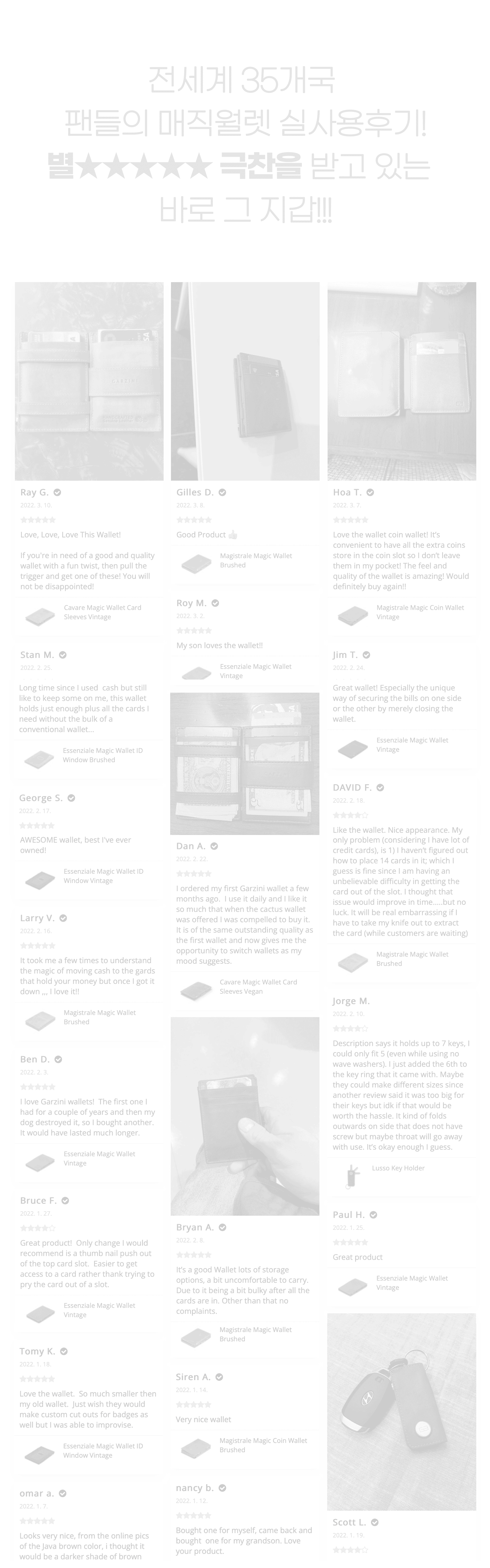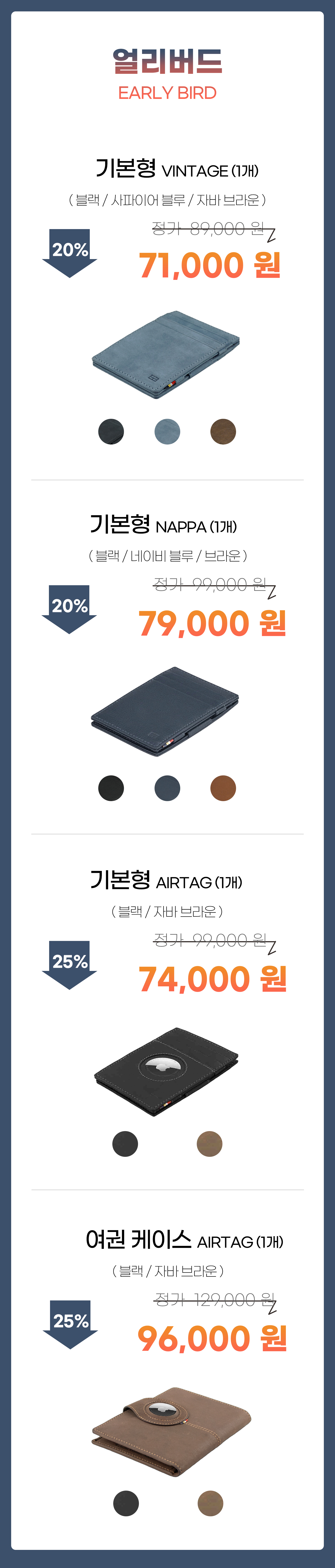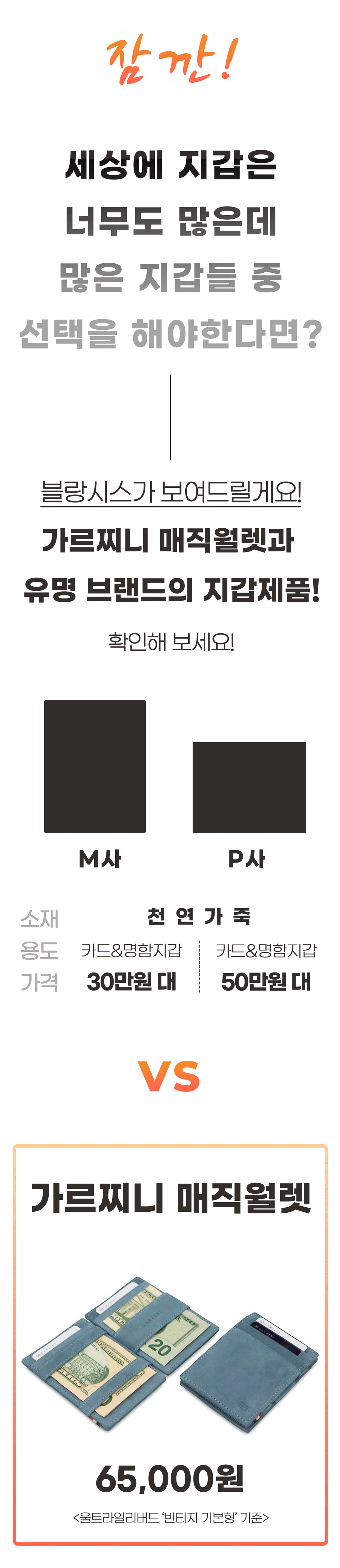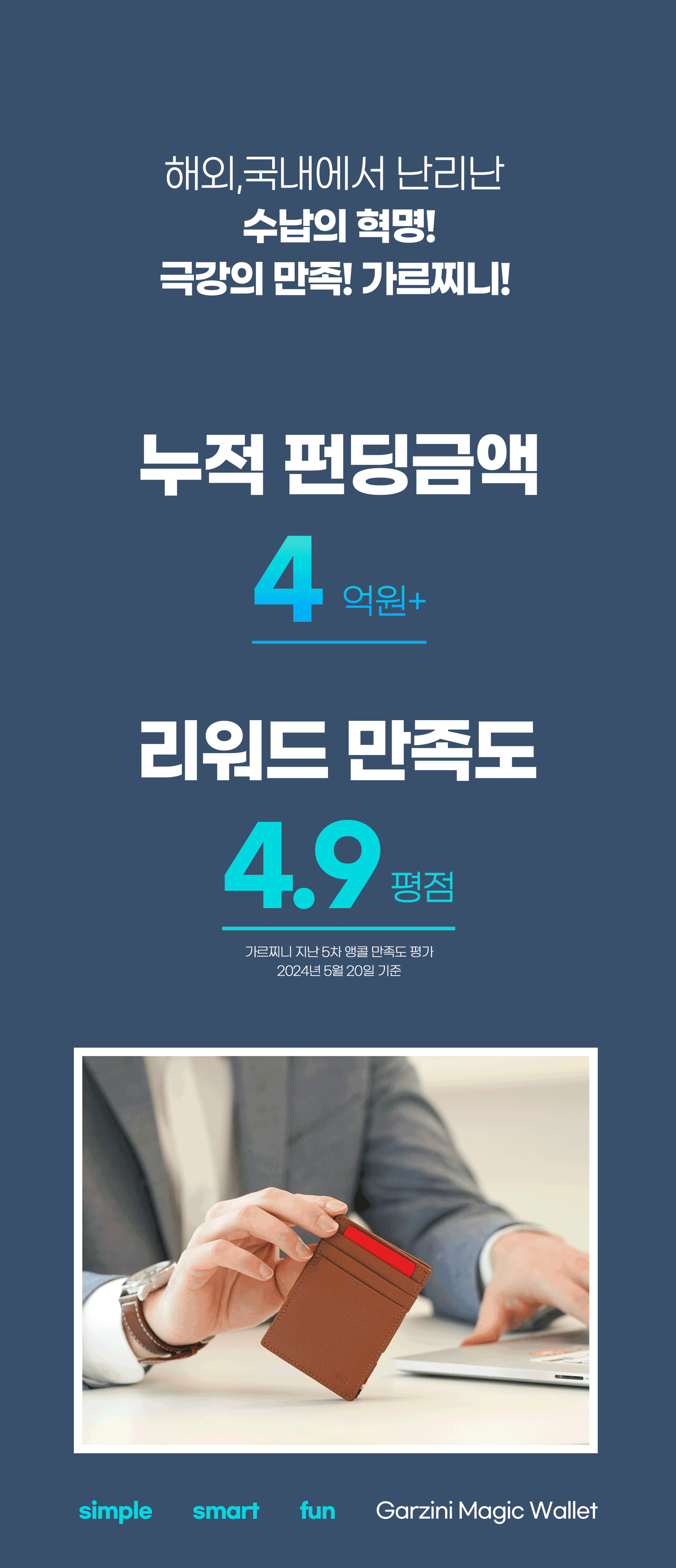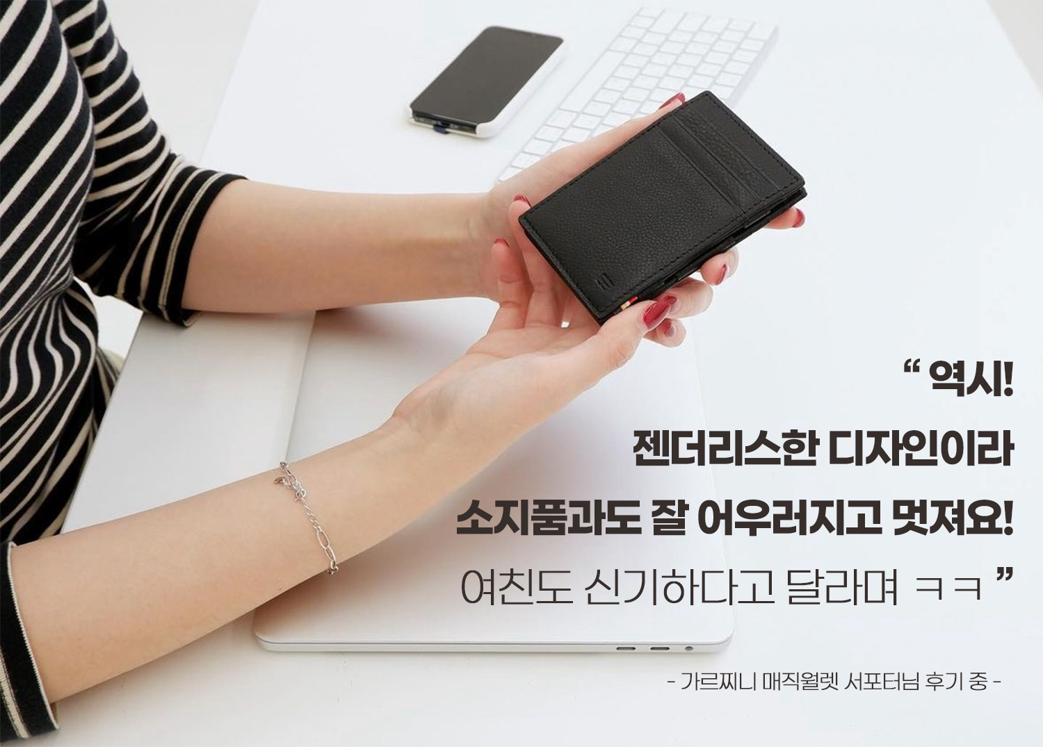가르찌니 매직월렛을 처음 만났던 그 때를 잊을 수가 없습니다. 어디에서도 볼수 없었던 Versaflex System의 신박함과 수납의 용이성, 패셔너블하고 심플한 디자인에 반했습니다. 2016년 독일에서 처음 가르찌니와 인연을 맺고 줄곧 매직월렛을 사용하면서, 시간이 흐를수록 자연스럽고 더욱 멋스러운 기품을 더하는 가르찌니 천연가죽의 매력에 흠뻑 빠졌습니다. 참 많은 서포터님들께 받은 과분한 사랑에 힘입어 지난 2년간 수많은 앵콜요청을 보내주신 덕분에 다시 한번 신모델과 함께 가르찌니 매직월렛을 소개해 드릴 수 있어서 큰 영광입니다. 이번 앵콜 펀딩에서는 가장 큰 사랑을 받았던 BEST 기본형 모델과 함께 에어태그 매직월렛 & 여권케이스 모델까지 함께 소개해 드릴 수 있어 더욱 기쁜 마음입니다. 앞으로도 쭉~~더 많은 서포터님들과 함께 "재미에 멋을 더하는 가르찌니 매직월렛" 의 매력을 함께 만끽하고 싶습니다. 서포터님들의 응원과 지지가 저희에게 큰 힘이됩니다. 꾸준히 성장하고 있는 저희 블랑시스팀을 지켜봐 주세요. 감사합니다.♡