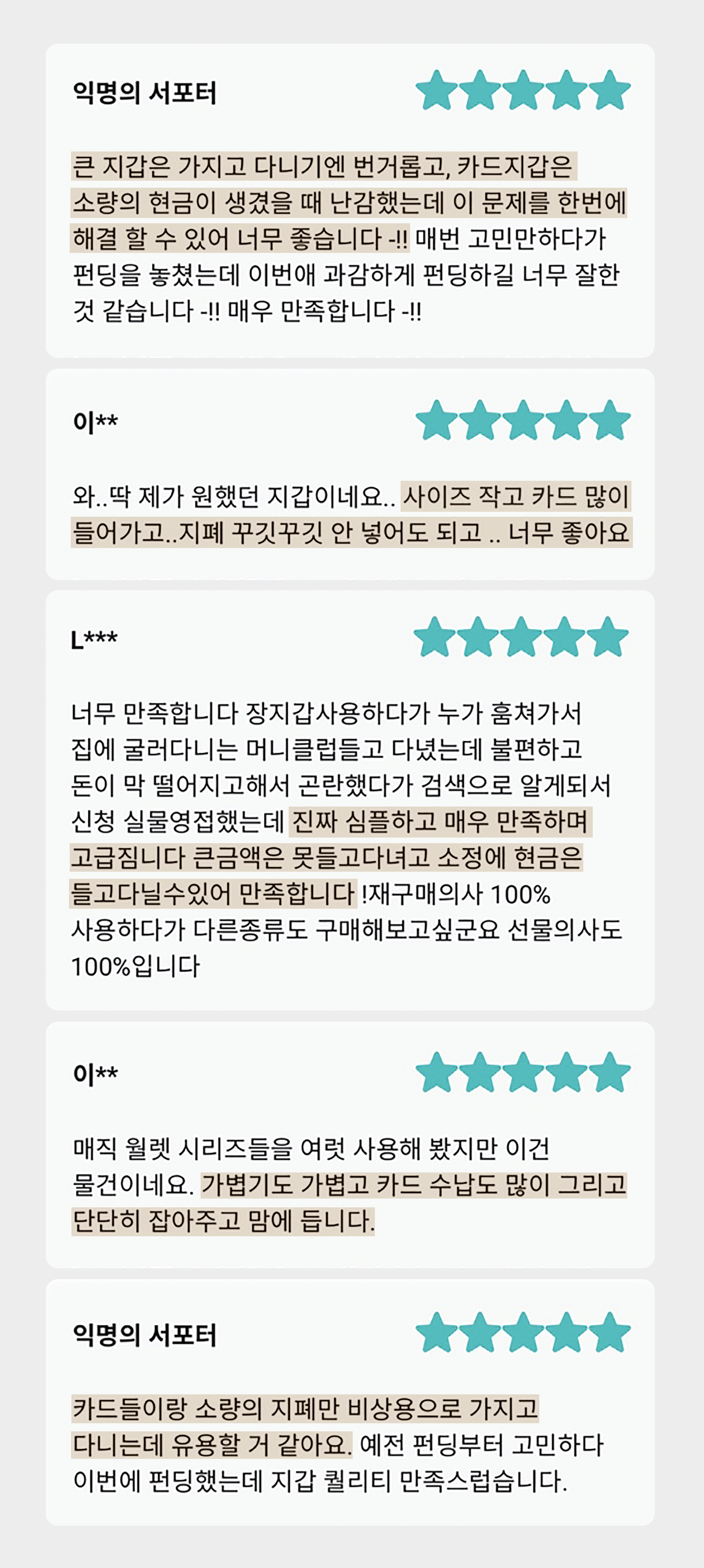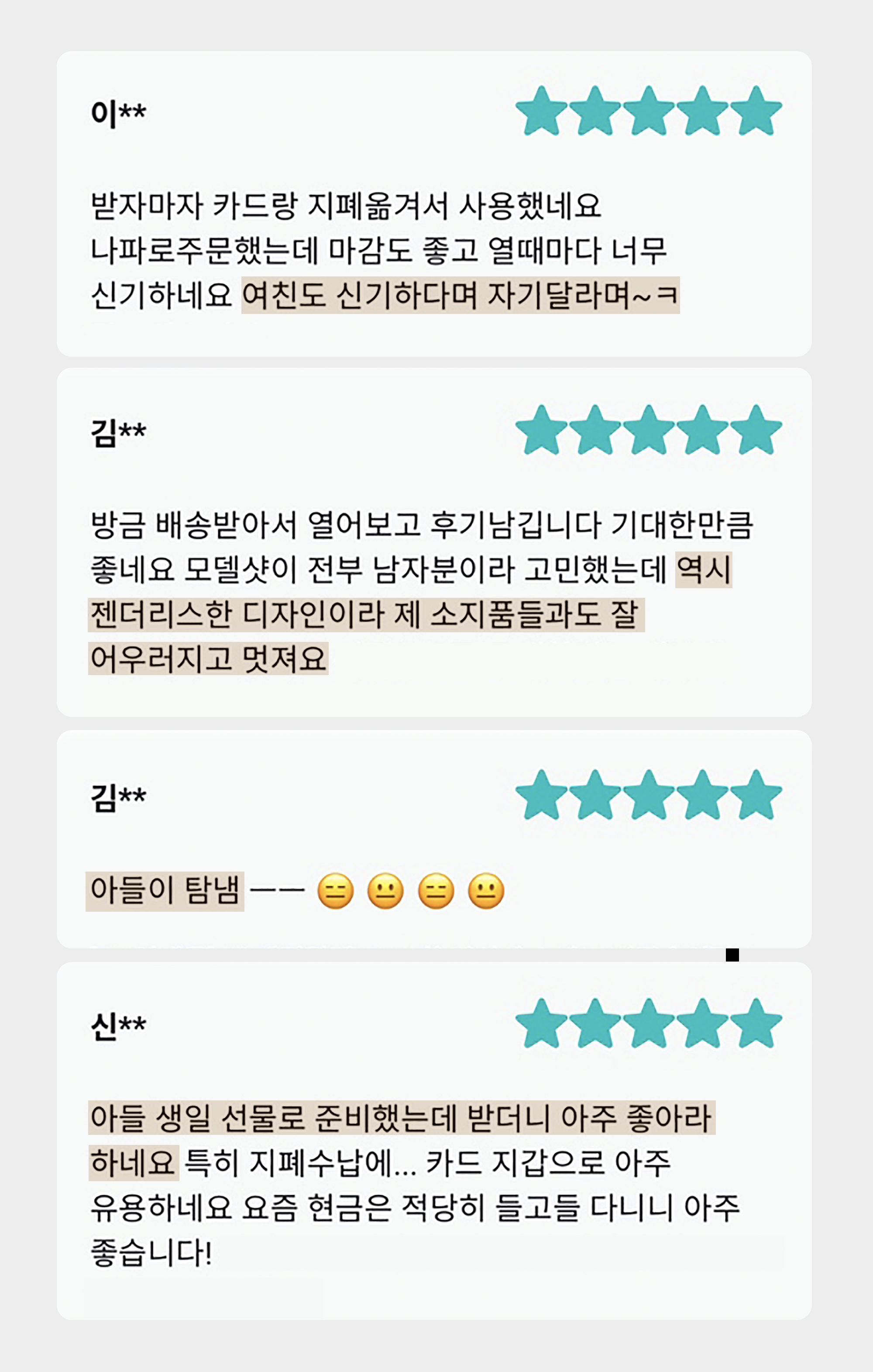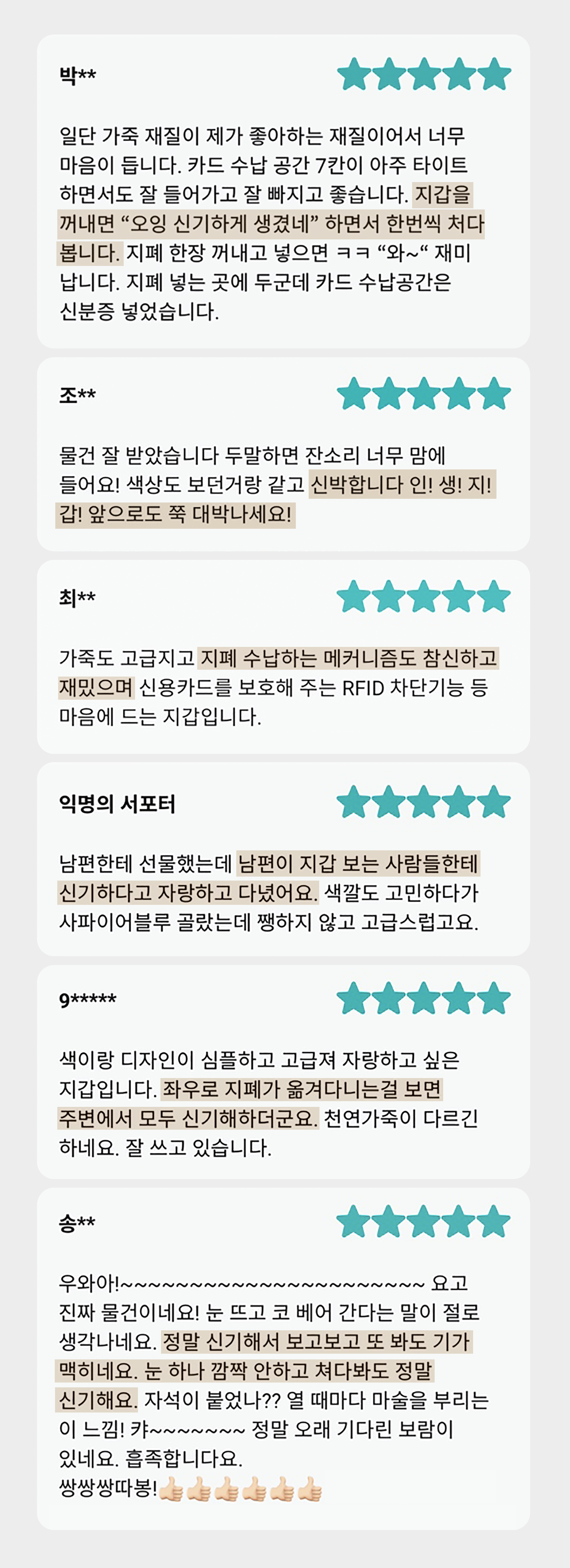 - 지갑의 양쪽 면에 알맞은 일정 수량의 지폐(한쪽에 약 3-5장 정도)를 유지해 주시면 가죽 스트랩이 느슨해지는 것을 방지할 수 있어 지폐가 빠지지 않게 오래 사용하실 수 있답니다!