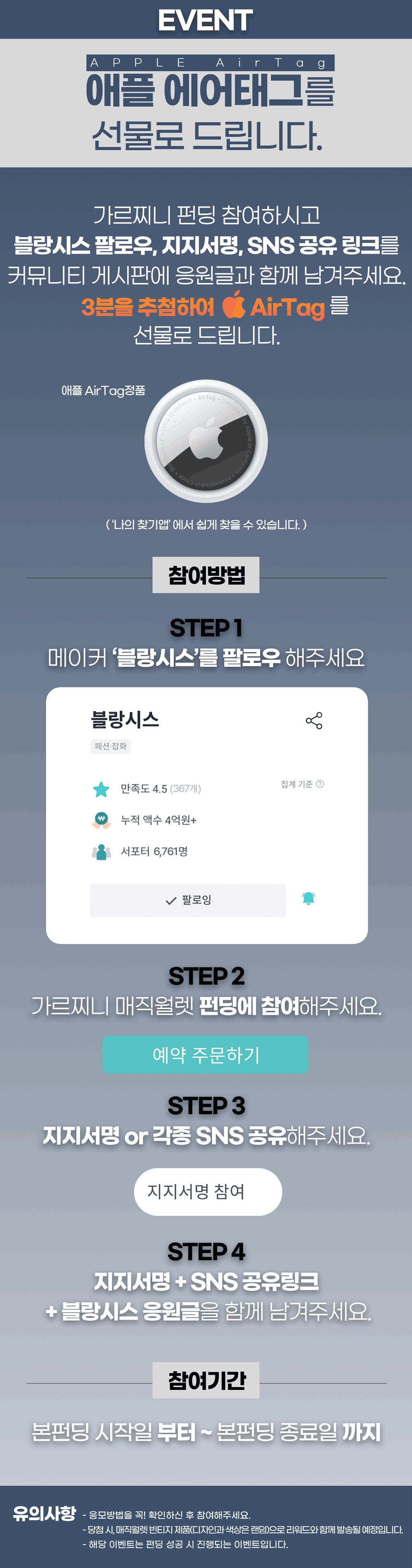 전세계를 무대로 나아가고자 하는 열정 넘치는 팀리더와 20년 경력의 베테랑 해외영업, 유통 전문가 브랜드 매니저, 그외 든든한 지원군들이 모인 저희 블랑시스는 전세계의 매력넘치는 브랜드 아이템을 합리적인 가격에 국내 시장에 정착시키고자 오늘도 밤낮으로 최선을 다하고 있습니다. 특히나 수차례 펀딩을 통한 서포터님들의 지지에 힘입어 자체 제작 상품 런칭 역시 기획하고 하고 있습니다. 서포터 여러분들의 소중한 펀딩금은 리워드 제작비용으로 사용되며, 일정 부분 차기 프로젝트를 위한 투자금으로 사용될 예정입니다. 앞으로도 전세계의 새롭고 패셔너블한 아이템, 블랑시스만의 독자적인 아이템으로 더많은 서포터 여러분들을 만나뵐 수 있기를 바랍니다. 에어태그 호환용 신모델과 함께 돌아온 가르찌니 매직월렛 프로젝트에 많은 사랑과 관심 부탁드립니다. 감사합니다.