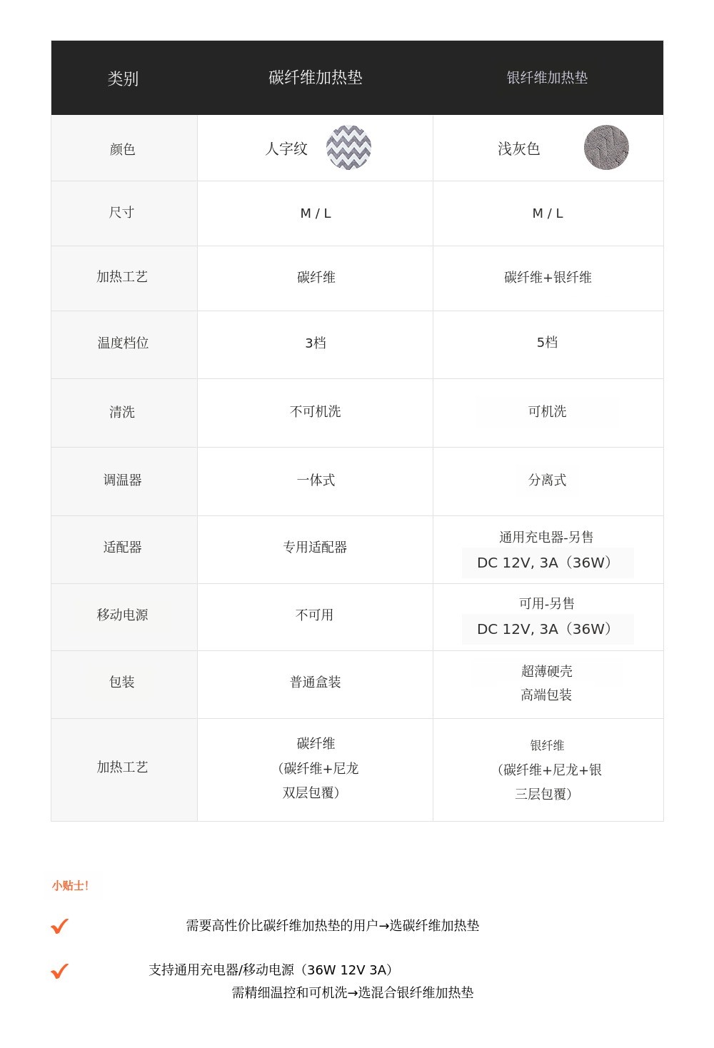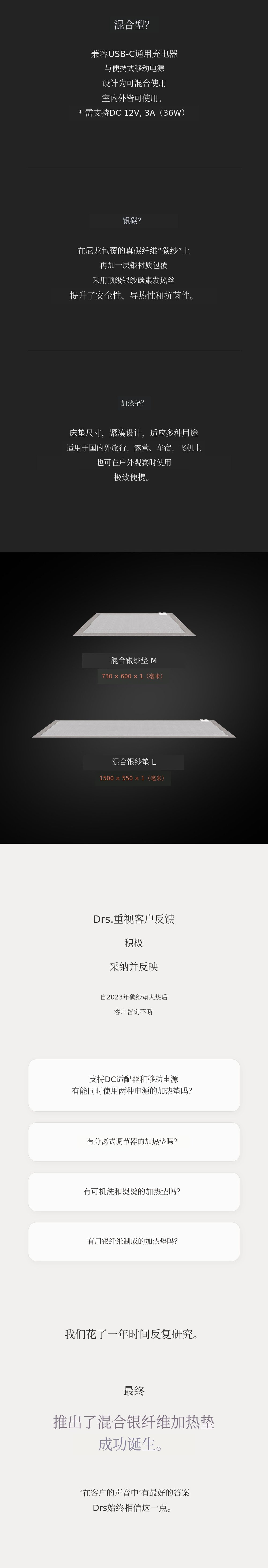 许多支持者喜爱的Wadiz“碳纱垫”大热预售后,大家纷纷询问是否有既可用DC适配器又可用移动电源的垫子,是否有可分离调节器/可水洗的垫子,是否有用银纱制成的垫子,是否有上市计划。为回馈提出宝贵意见的支持者,我们经过一年思考与研究,推出了“混合银纱垫”新品,并通过带有特别优惠的预售再次与大家见面。