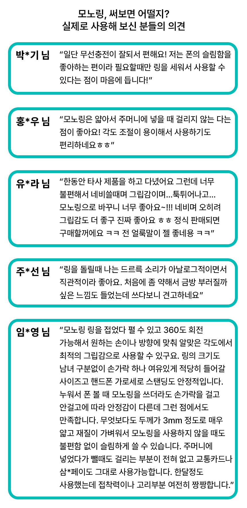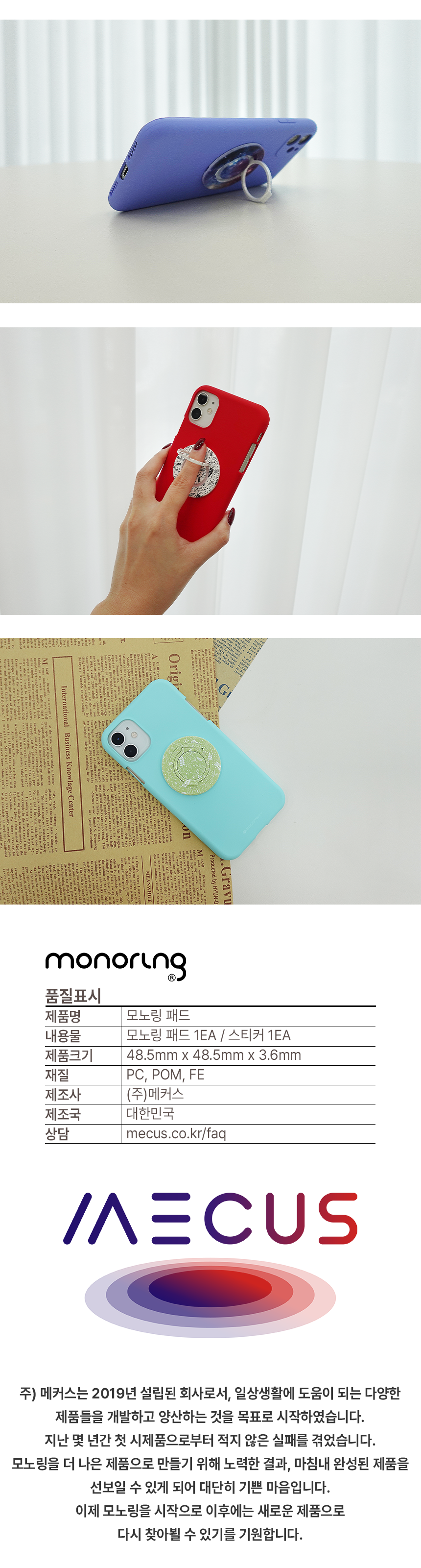 - 모노링은 핸드폰 사용 편의를 위한 소모성 보조 제품입니다. 무리한 사용 및 사용자 부주의로 인한 휴대폰, 케이스 또는 모노링이 파손되었을 시 당사에서 책임지지 않습니다.