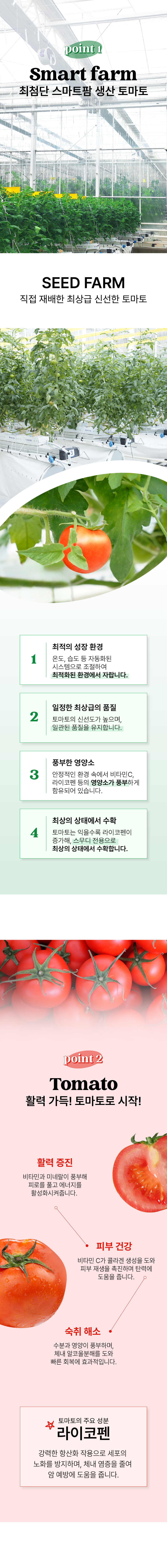 (주)SEED는 건강한 음식과 즐거운 식문화를 위한 안전하고 바른 먹거리를 선도하는 친환경 Agri-Tech 기업이며, 시작은 토마토 스무디입니다. 국내 최대 규모(약 15,000평)의 대형 유리온실과 특허받은 IoT 스마트팜 기술을 통해 연중 내내 신선하고 건강한 작물을 안정적으로 생산하며, LED 보광등 설치로 기후 변화에도 영향을 받지 않는 지속 가능한 농업을 실현합니다.