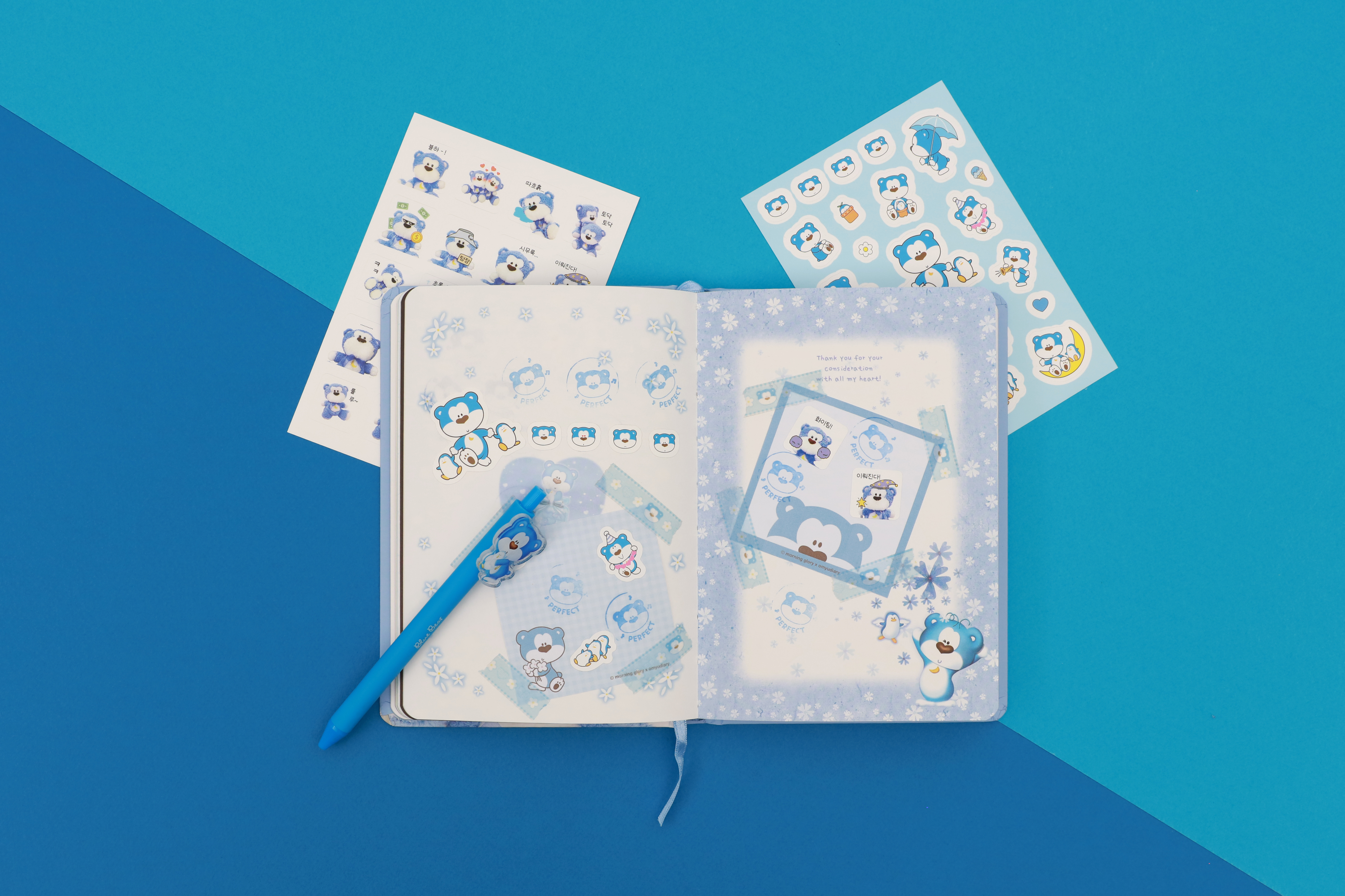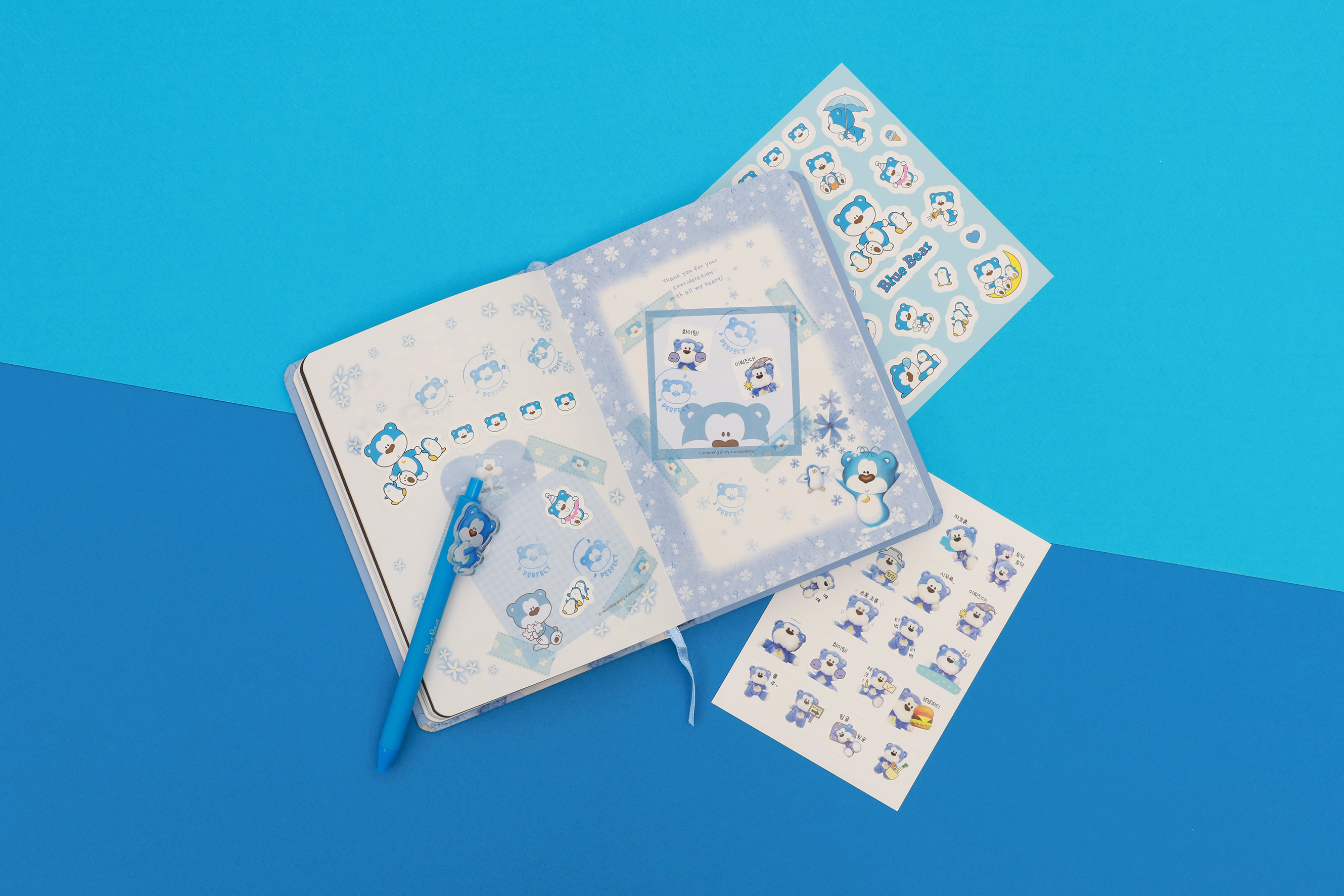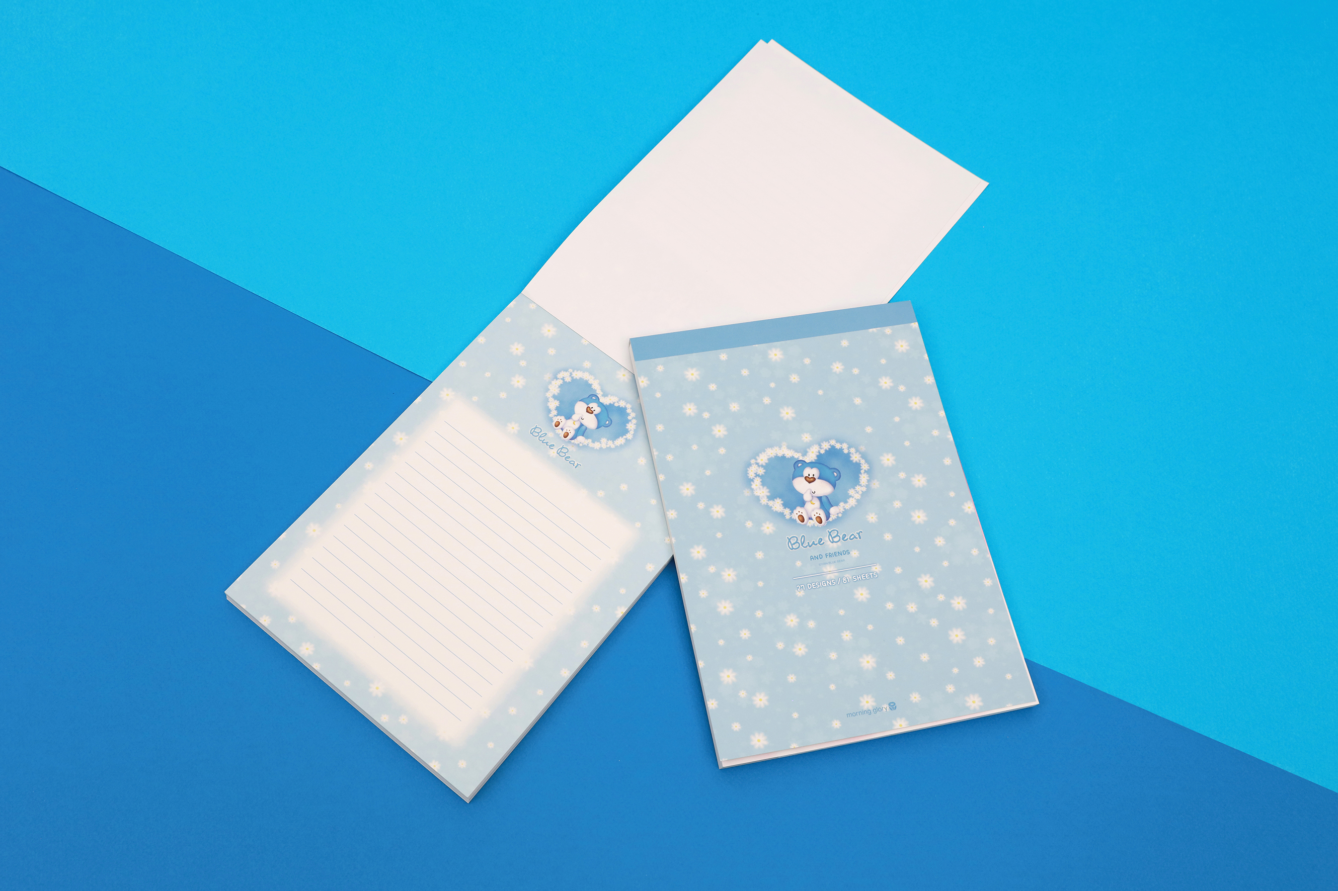 모닝글로리 블루베어는 1990년대 - 2000년대 사랑받았던 팬시 캐릭터로 노트, 필통, 편지지, 엽서, 다이어리, 필기구 등 다양한 문구와 팬시 상품으로 만날 수 있었던 친근하고 대중적인 캐릭터였습니다.