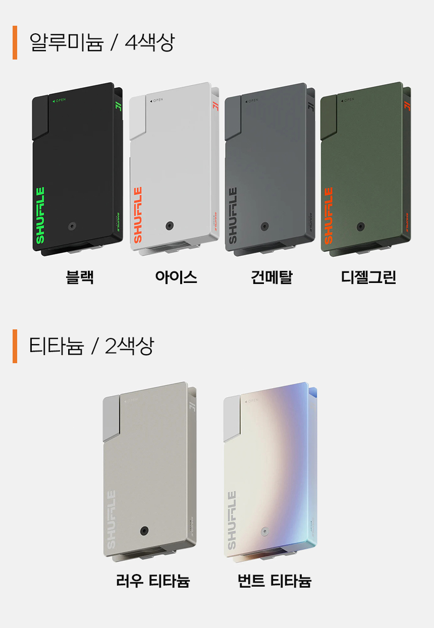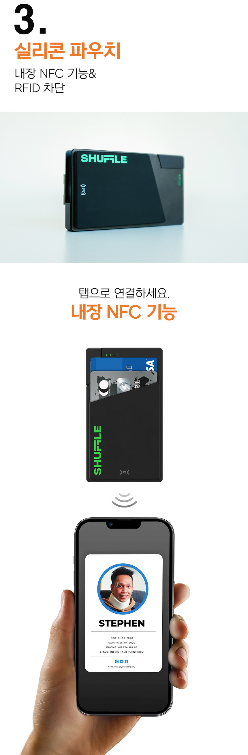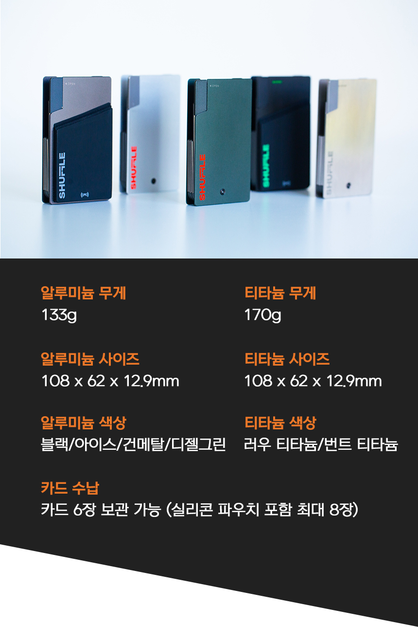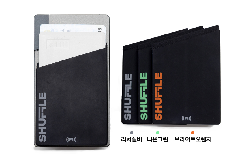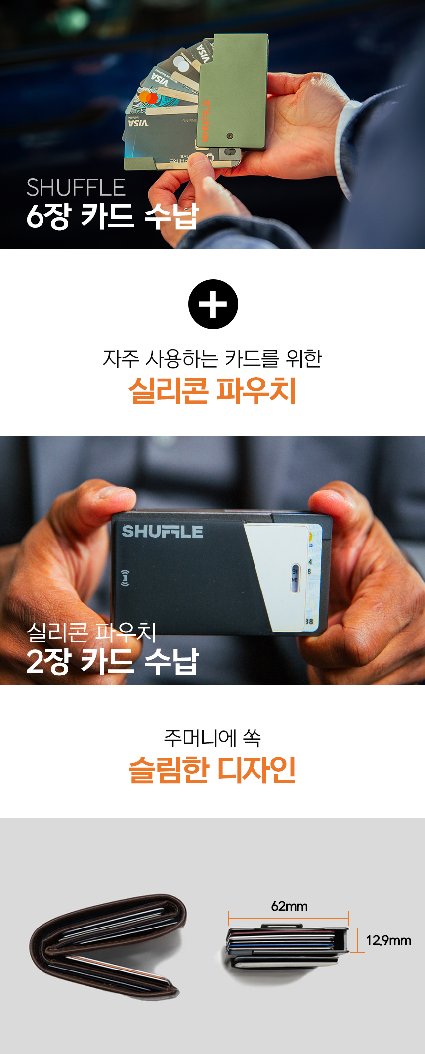 12.9mm크기의 셔플지갑은 6개의 카드를 수납 할 수 있으며 실리콘 파우치를 사용하면 최대8개까지 수납 할 수 있습니다. 슬림한 디자인으로 휴대가 간편한 셔플지갑!