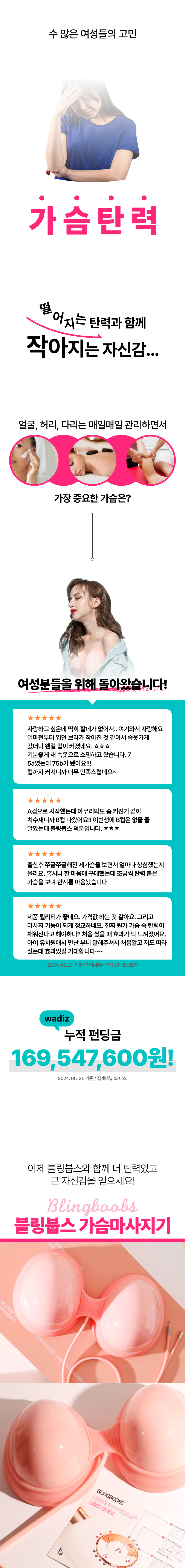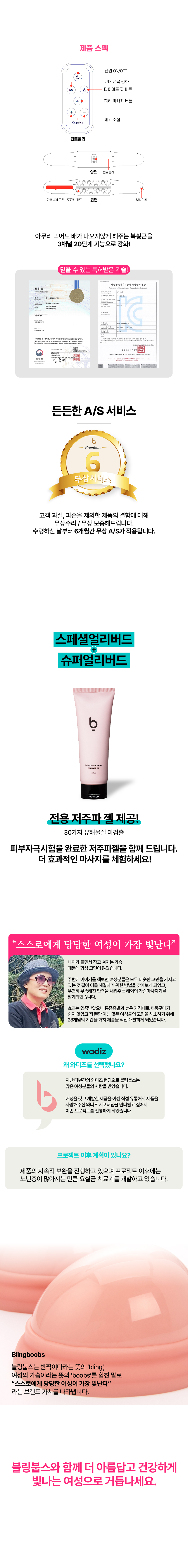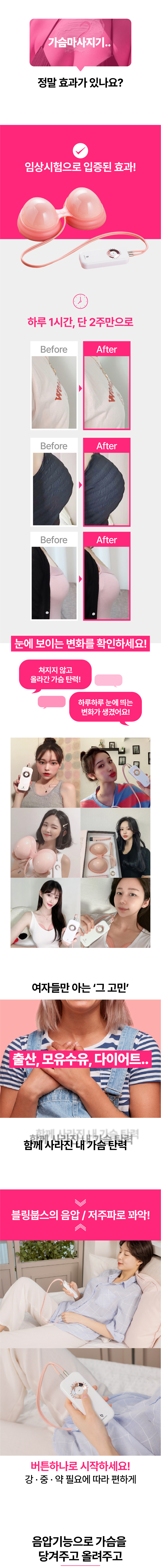 - 블링붑스 제품 사용 중 트러블 및 부작용의 경우 “진단서(진단명: 음압사용으로 인한 부작용, 블링붑스 가슴마사지기 사용후 부작용)”을 제출해주시면 블링붑스 반품 규정에 따라 반환이 가능합니다.