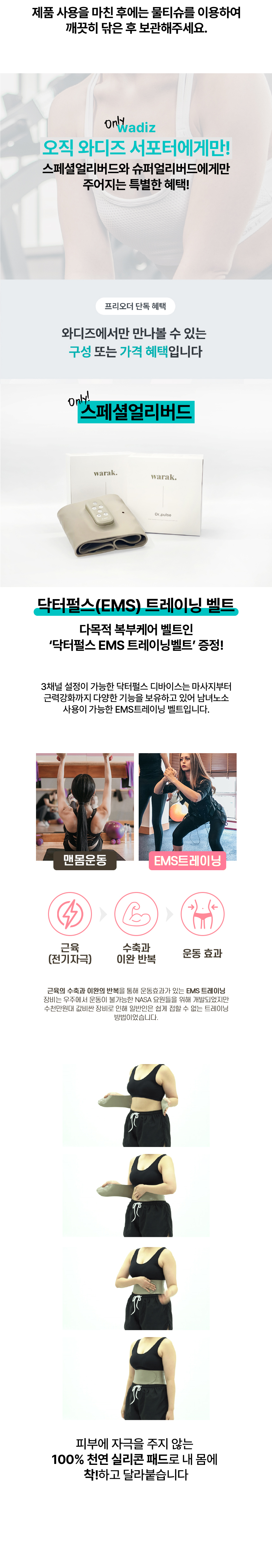 - 간혹 가슴둘레가 많이 작거나 살집이 거의 없으신분들은 착용이 어려우실 수 있습니다. 이럴경우 제품 테두리에 젤을 바르지 마시고 안쪽 검은색 도전성 패드부분에만 살짝 발라주신 뒤 편안하게 누우셔서 제품의 위치를 바꿔가며 착용하면 적절한 위치를 찾으시기 수월하고, 한번 착용이 되고 나면 자리가 잡혀 다음부턴 문제없이 착용하실 수 있습니다. (가슴둘레가 많이 작거나 살집이 너무 없으신 분들은 펀딩 전 꼭! 와디즈 메세지를 통해 상담을 받고 펀딩하시기 바랍니다.)