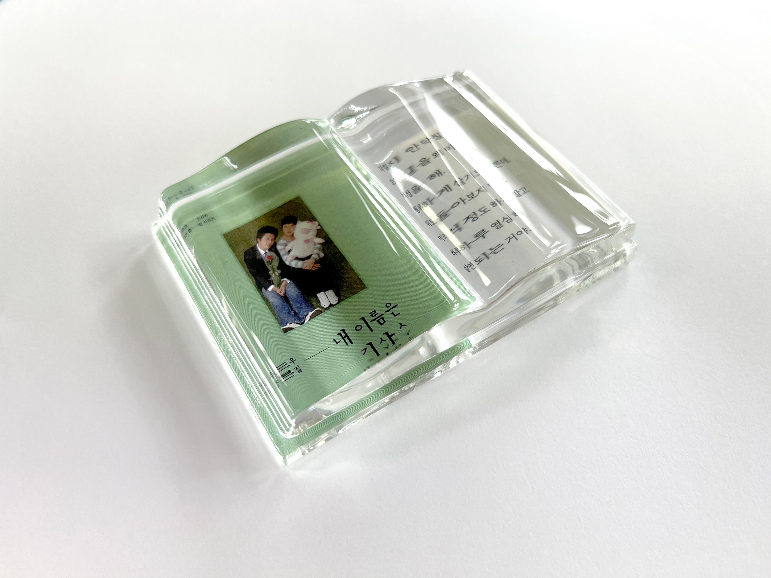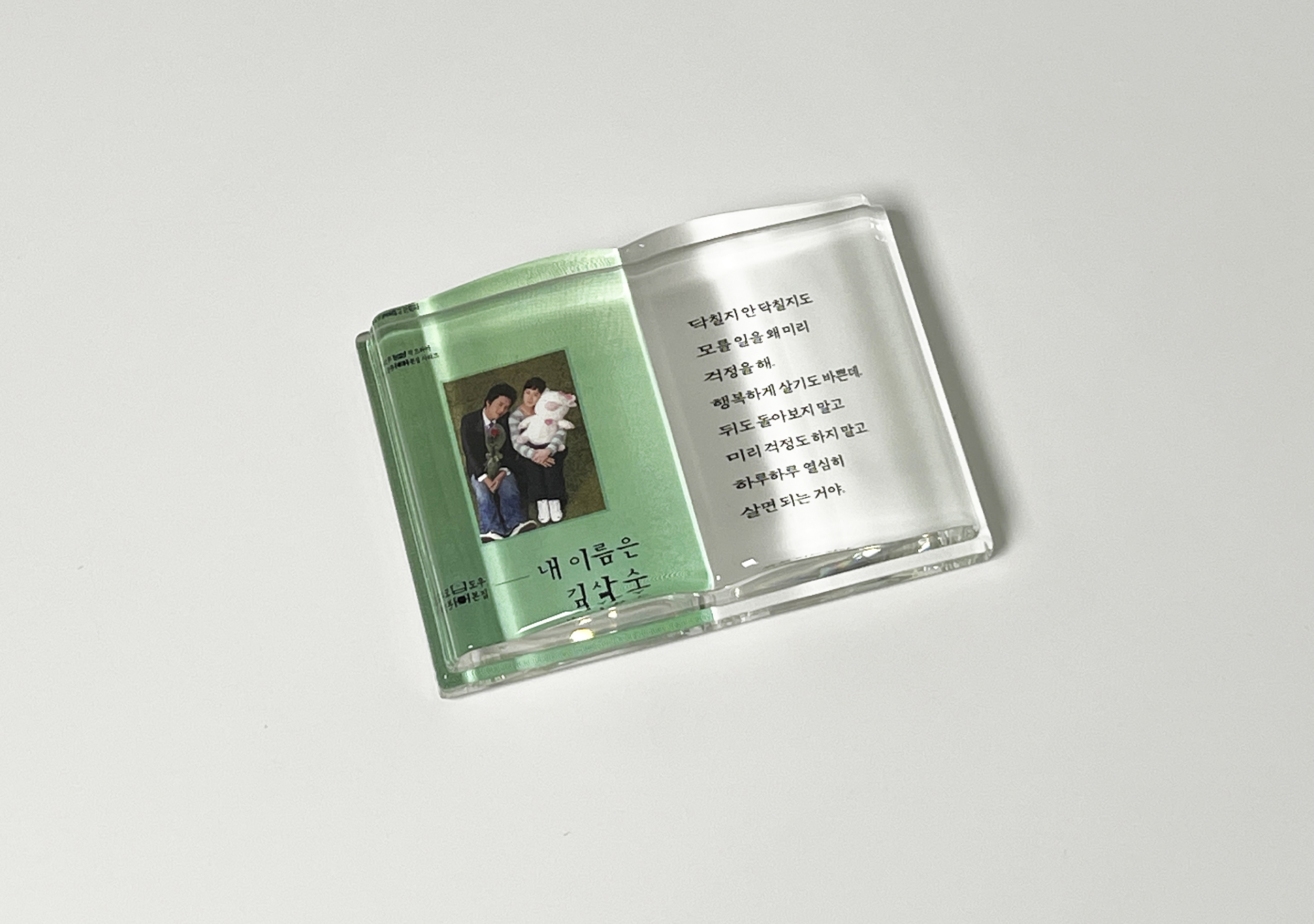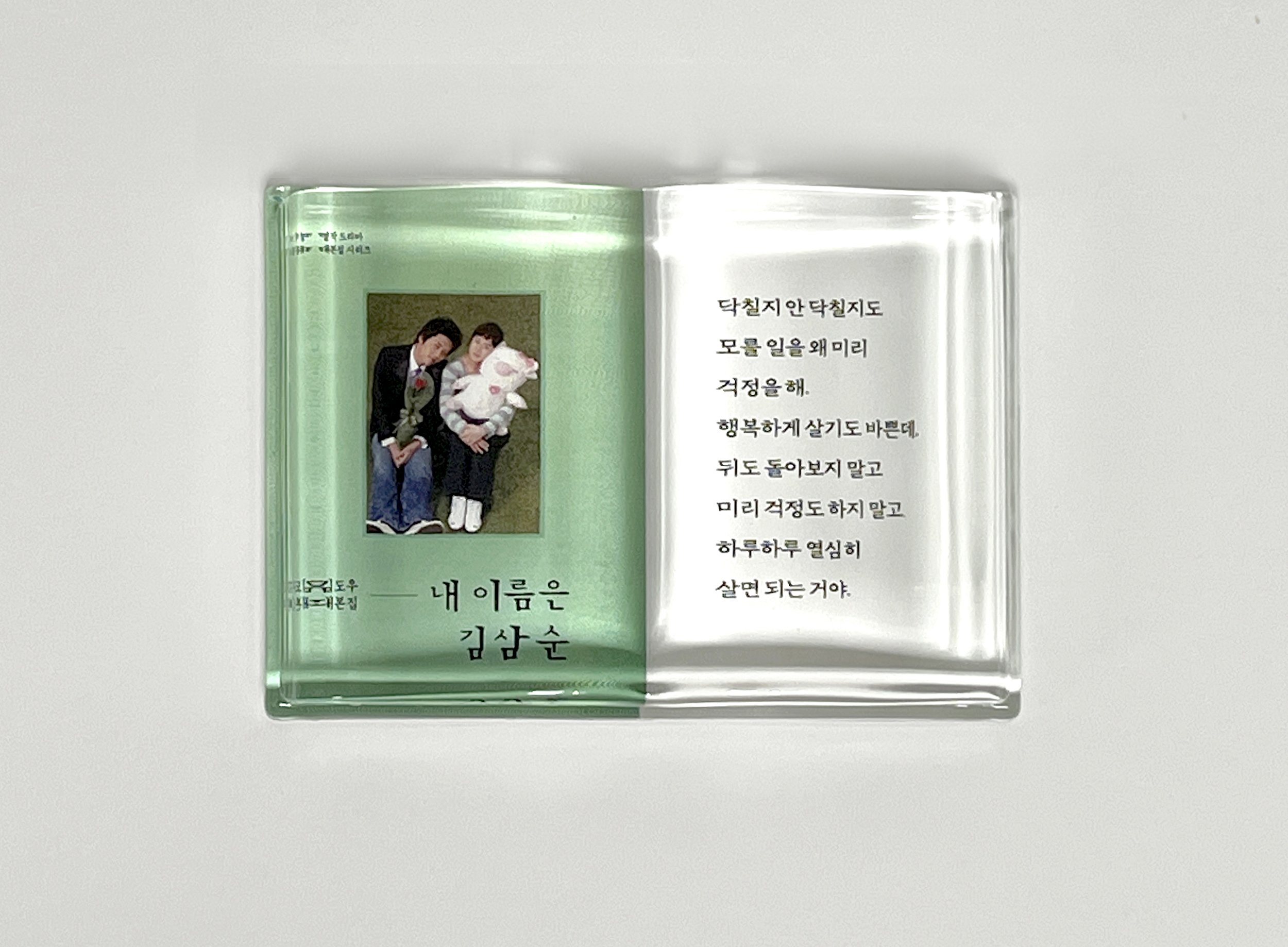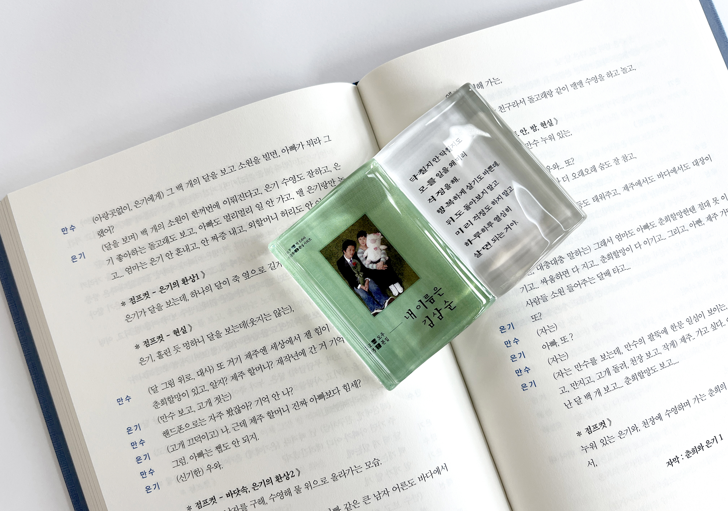 <내 이름은 김삼순> 대본집 1권 표지와 언제 읽어도 마음이 따스해지는 명대사를 책 모양 유리 문진에 담았습니다.