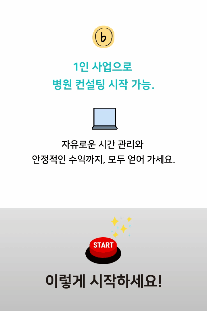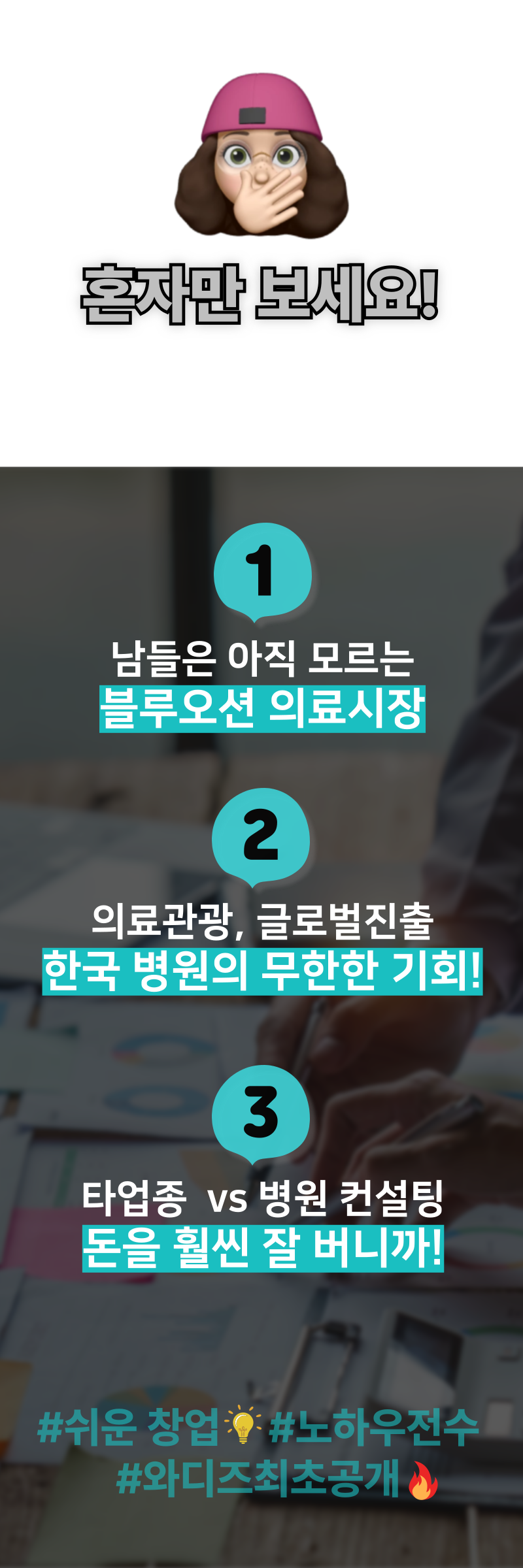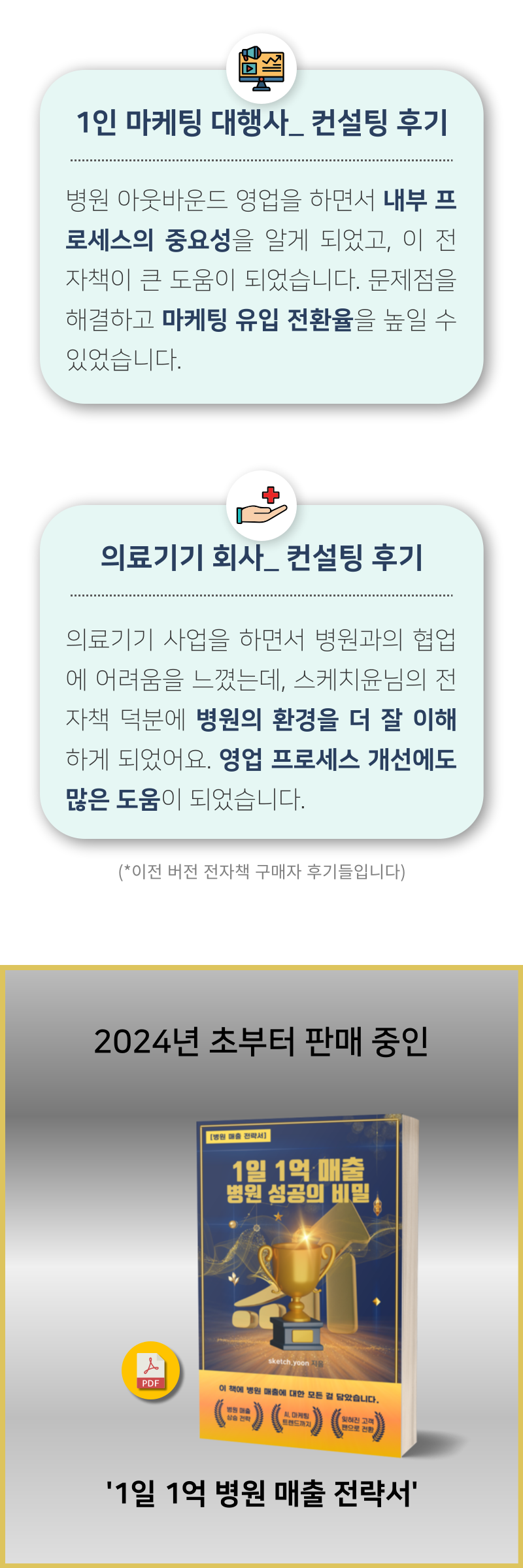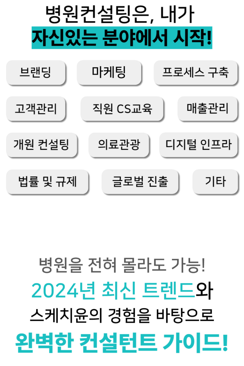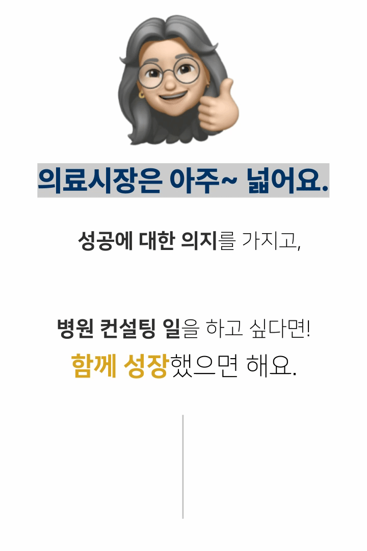1, 2차 급의 병의원과 단과 종합병원의 경우는 오히려 밀착해서 관리해주는 형태의 컨설팅이나 마케팅이 더 효율적이며, 소통에도 유리하기에 1인 기업으로 컨설팅을 시작해도 충분히 성공할 수 있어요. 그렇기에 관심이 있으신 분들은 도전해 보셨으면 합니다.