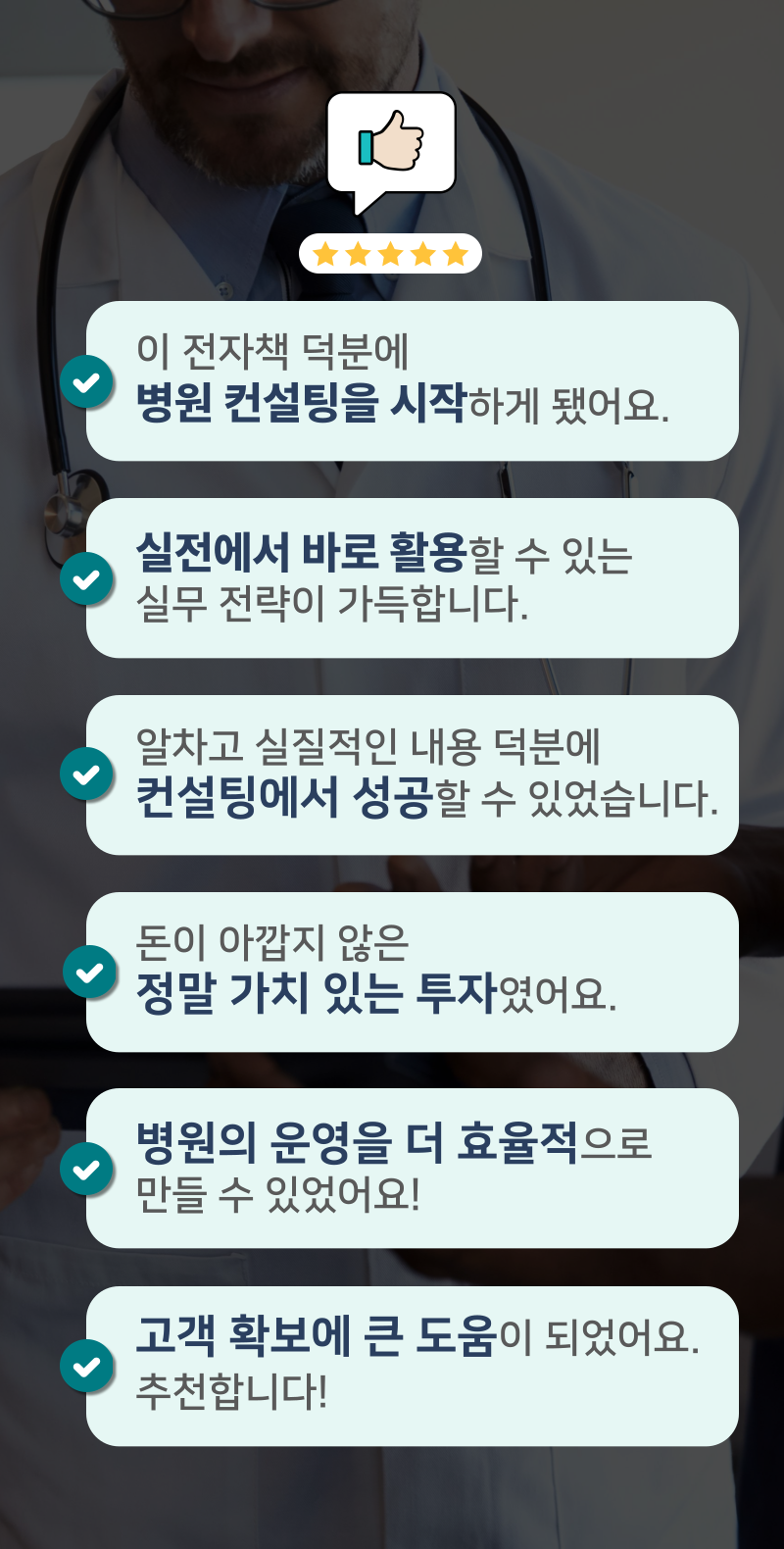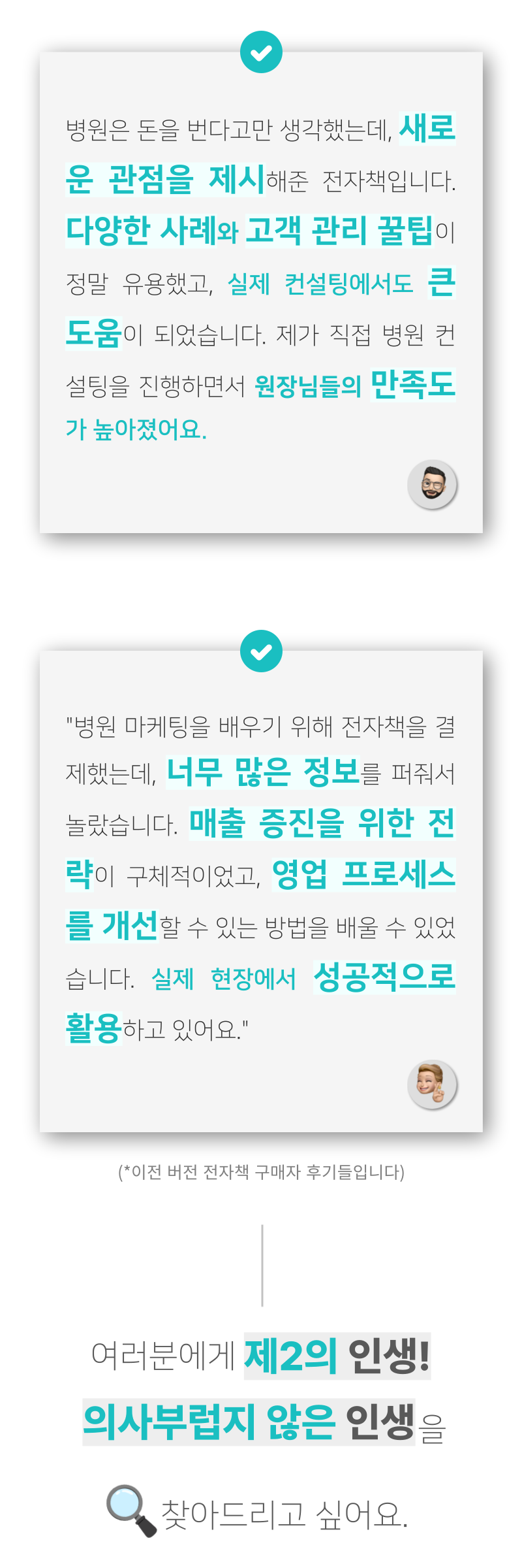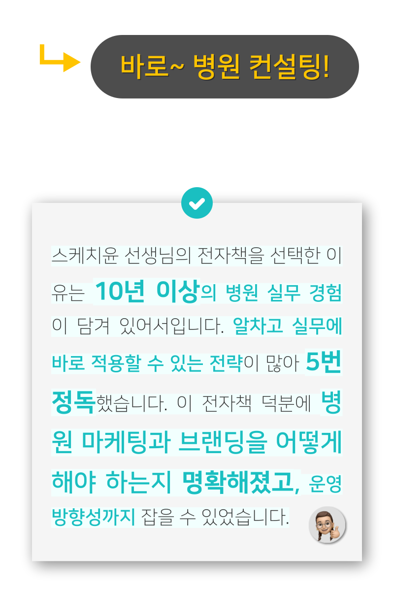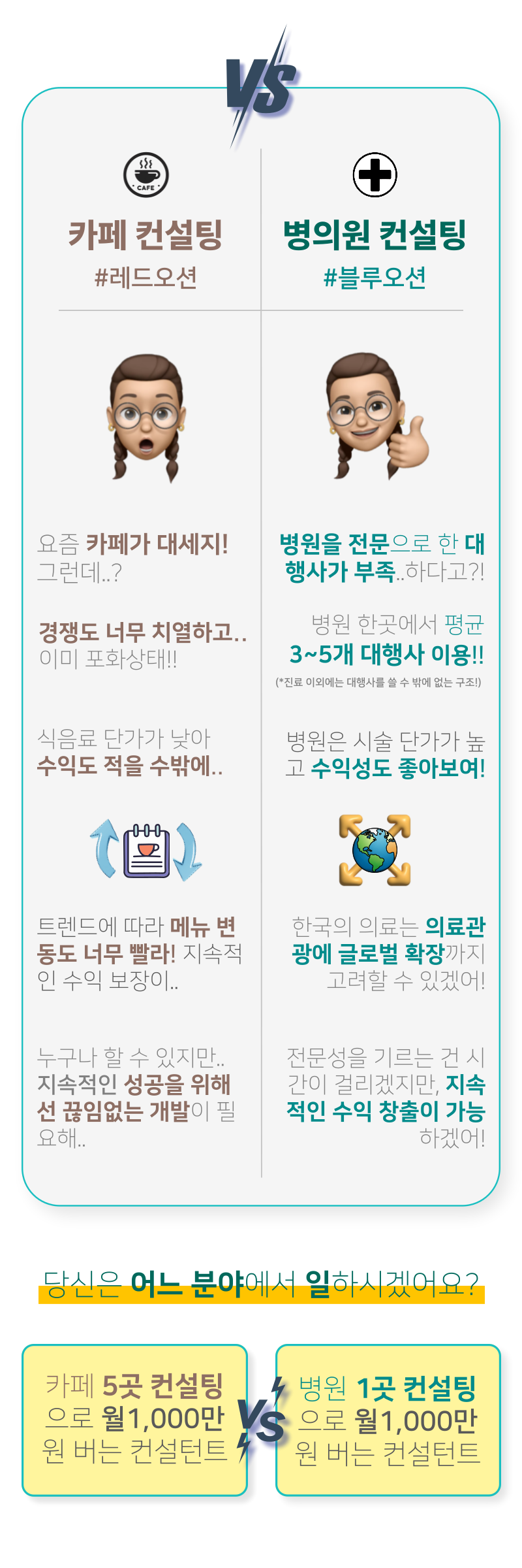 1, 2차 급의 병의원과 단과 종합병원의 경우는 오히려 밀착해서 관리해주는 형태의 컨설팅이나 마케팅이 더 효율적이며, 소통에도 유리하기에 1인 기업으로 컨설팅을 시작해도 충분히 성공할 수 있어요. 그렇기에 관심이 있으신 분들은 도전해 보셨으면 합니다.